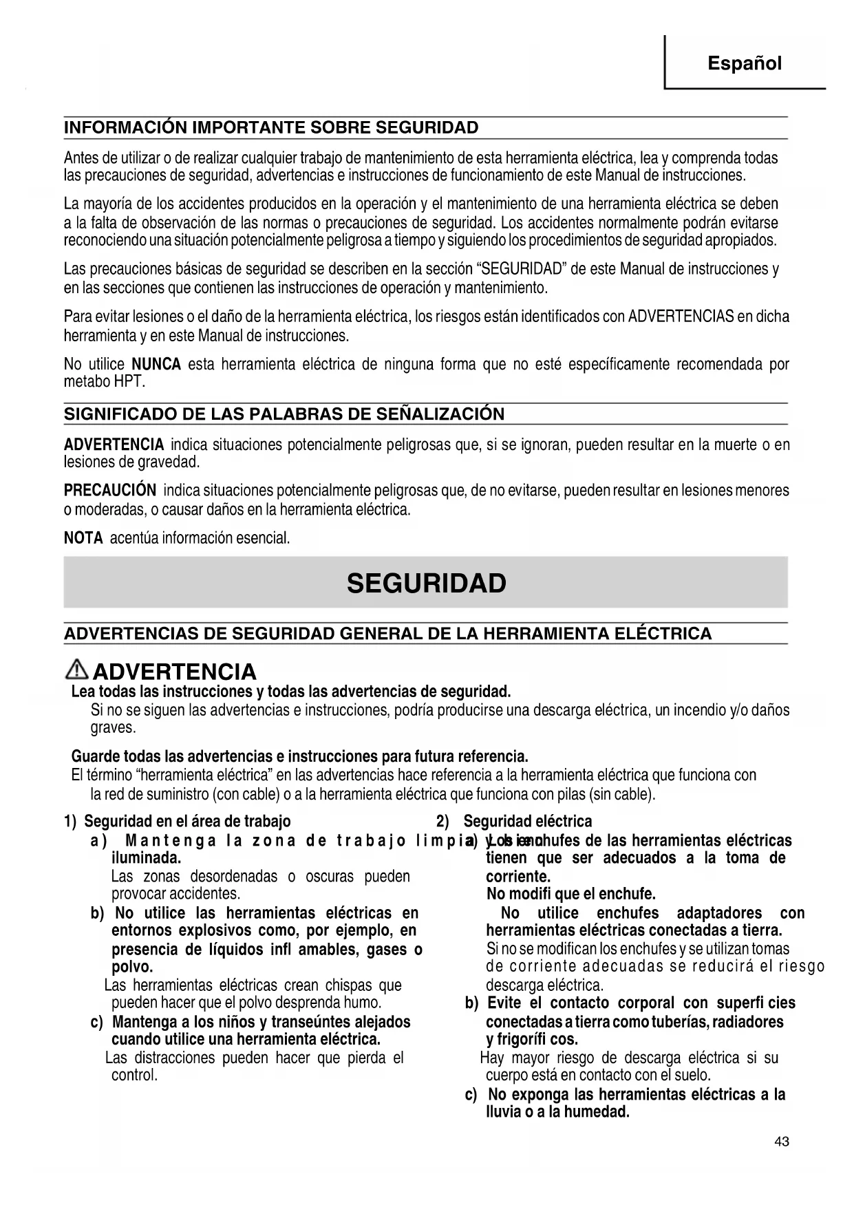 Français 000BookP18DSL.indb42000BookP18DSL.indb42 2018/10/1617:38:442018/10/1617:38:44INFORMACIÓN IMPORTANTE SOBRE SEGURIDAD Antes de utilizar o de realizar cualquier trabajo de mantenimiento de esta herramienta eléctrica, lea y comprenda todas las precauciones de seguridad, advertencias e instrucciones de funcionamiento de este Manual de instrucciones. La mayoría de los accidentes producidos en la operación y el mantenimiento de una herramienta eléctrica se deben a la falta de observación de las normas o precauciones de seguridad. Los accidentes normalmente podrán evitarse reconociendo una situación potencialmente peligrosa a tiempo y siguiendo los procedimientos de seguridad apropiados. Las precauciones básicas de seguridad se describen en la sección “SEGURIDAD” de este Manual de instrucciones y en las secciones que contienen las instrucciones de operación y mantenimiento. Para evitar lesiones o el daño de la herramienta eléctrica, los riesgos están identifi cados con ADVERTENCIAS en dicha herramienta y en este Manual de instrucciones. No utilice NUNCA esta herramienta eléctrica de ninguna forma que no esté específi camente recomendada por metabo HPT. SIGNIFICADO DE LAS PALABRAS DE SEÑALIZACIÓN ADVERTENCIA indica situaciones potencialmente peligrosas que, si se ignoran, pueden resultar en la muerte o en lesiones de gravedad. PRECAUCIÓN indica situaciones potencialmente peligrosas que, de no evitarse, pueden resultar en lesiones menores o moderadas, o causar daños en la herramienta eléctrica. NOTA acentúa información esencial. SEGURIDAD ADVERTENCIAS DE SEGURIDAD GENERAL DE LA HERRAMIENTA ELÉCTRICA ADVERTENCIA Lea todas las instrucciones y todas las advertencias de seguridad. Si no se siguen las advertencias e instrucciones, podría producirse una descarga eléctrica, un incendio y/o daños graves. Guarde todas las advertencias e instrucciones para futura referencia. El término “herramienta eléctrica” en las advertencias hace referencia a la herramienta eléctrica que funciona con la red de suministro (con cable) o a la herramienta eléctrica que funciona con pilas (sin cable).