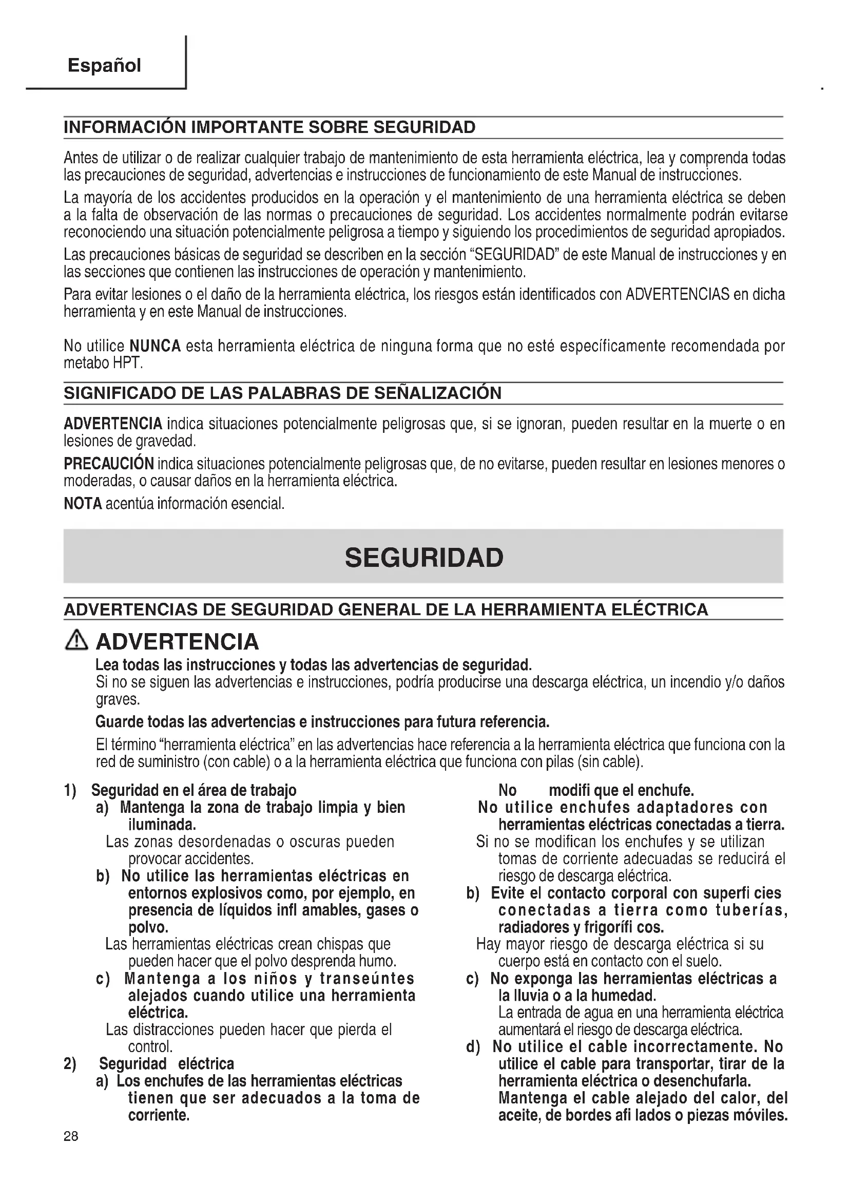 Antes de utilizar o de realizar cualquier trabajo de mantenimiento de esta herramienta eléctrica, lea y comprenda todas las precauciones de seguridad, advertencias e instrucciones de funcionamiento de este Manual de instrucciones. La mayoría de los accidentes producidos en la operación y el mantenimiento de una herramienta eléctrica se deben a la falta de observación de las normas o precauciones de seguridad. Los accidentes normalmente podrán evitarse reconociendo una situación potencialmente peligrosa a tiempo y siguiendo los procedimientos de seguridad apropiados. Las precauciones básicas de seguridad se describen en la sección “SEGURIDAD” de este Manual de instrucciones y en las secciones que contienen las instrucciones de operación y mantenimiento. Para evitar lesiones o el daño de la herramienta eléctrica, los riesgos están identifi cados con ADVERTENCIAS en dicha herramienta y en este Manual de instrucciones. No utilice NUNCA esta herramienta eléctrica de ninguna forma que no esté específicamente recomendada por metabo HPT. SIGNIFICADO DE LAS PALABRAS DE SEÑALIZACIÓN ADVERTENCIA indica situaciones potencialmente peligrosas que, si se ignoran, pueden resultar en la muerte o en lesiones de gravedad. PRECAUCIÓN indica situaciones potencialmente peligrosas que, de no evitarse, pueden resultar en lesiones menores o moderadas, o causar daños en la herramienta eléctrica. NOTA acentúa información esencial.