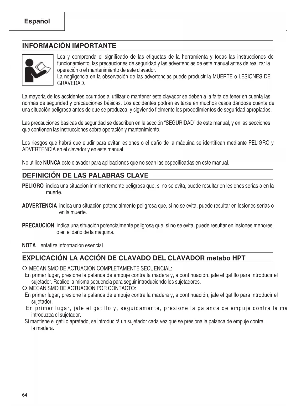 PELIGRO indica una situación inminentemente peligrosa que, si no se evita, puede resultar en lesiones serias o en la muerte. ADVERTENCIA indica una situación potencialmente peligrosa que, si no se evita, puede resultar en lesiones serias o en la muerte. PRECAUCIÓN indica una situación potencialmente peligrosa que, si no se evita, puede resultar en lesiones menores, o en el daño de la máquina. NOTA enfatiza información esencial. EXPLICACIÓN LA ACCIÓN DE CLAVADO DEL CLAVADOR metabo HPT