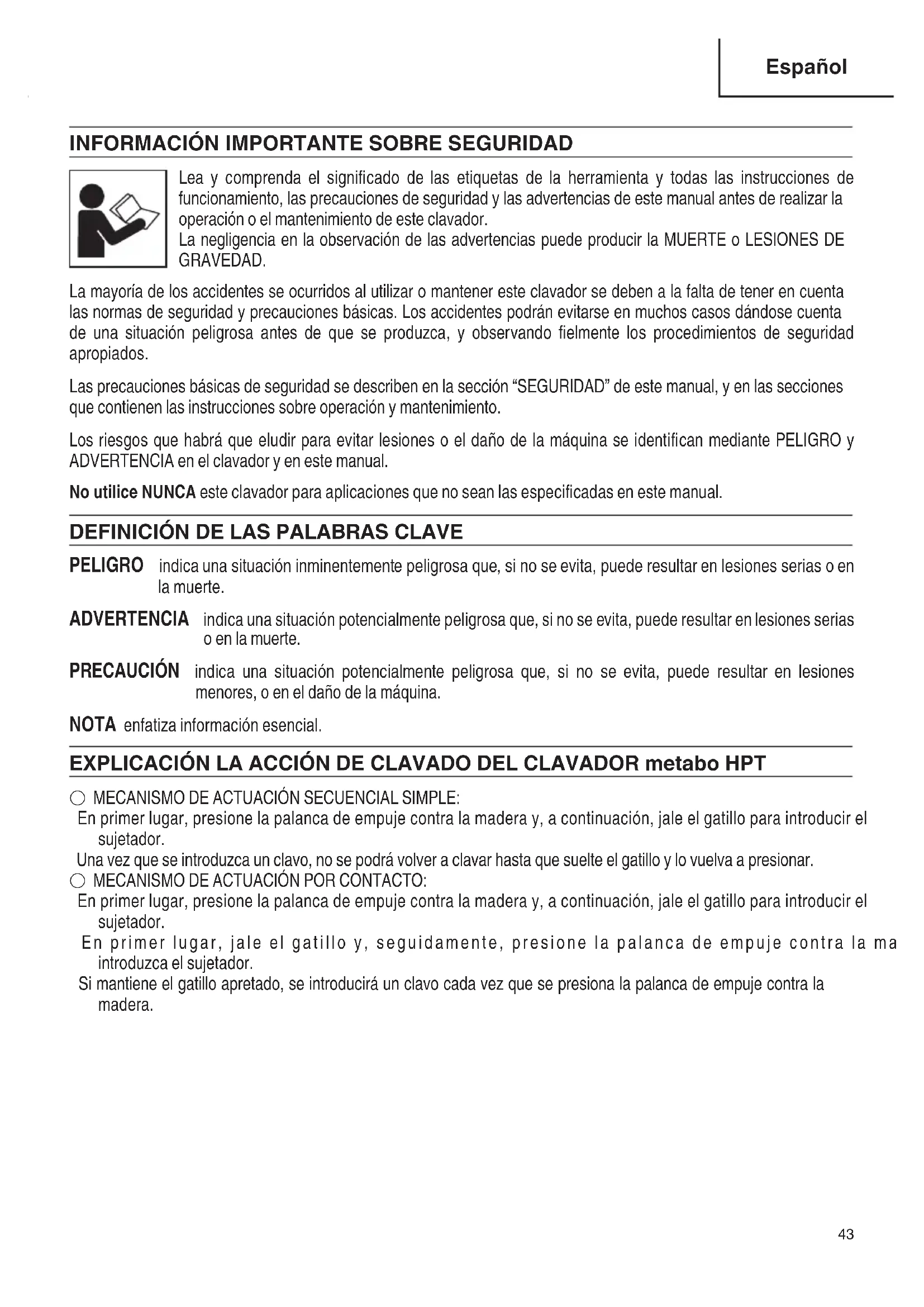 EXPLICACIÓN LA ACCIÓN DE CLAVADO DEL CLAVADOR metabo HPT ..................................43 SEGURIDAD