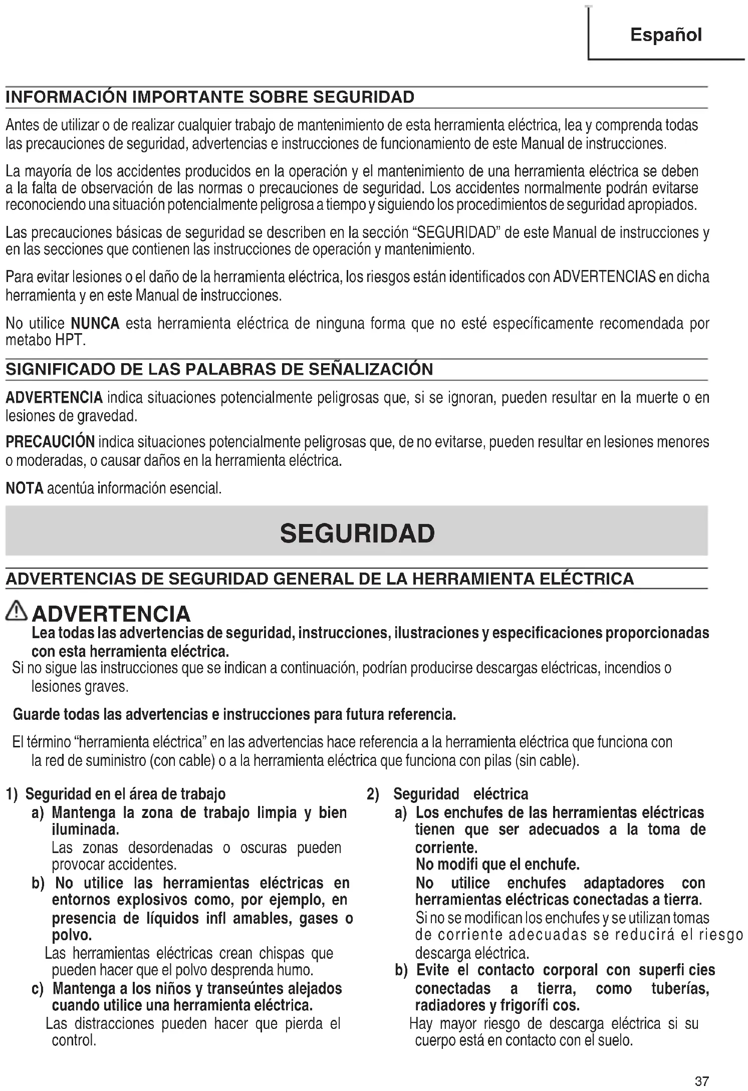 Français 00BookW18DANA.indb3600BookW18DANA.indb36 2022/03/1415:37:032022/03/1415:37:03INFORMACIÓN IMPORTANTE SOBRE SEGURIDAD Antes de utilizar o de realizar cualquier trabajo de mantenimiento de esta herramienta eléctrica, lea y comprenda todas las precauciones de seguridad, advertencias e instrucciones de funcionamiento de este Manual de instrucciones. La mayoría de los accidentes producidos en la operación y el mantenimiento de una herramienta eléctrica se deben a la falta de observación de las normas o precauciones de seguridad. Los accidentes normalmente podrán evitarse reconociendo una situación potencialmente peligrosa a tiempo y siguiendo los procedimientos de seguridad apropiados. Las precauciones básicas de seguridad se describen en la sección “SEGURIDAD” de este Manual de instrucciones y en las secciones que contienen las instrucciones de operación y mantenimiento. Para evitar lesiones o el daño de la herramienta eléctrica, los riesgos están identifi cados con ADVERTENCIAS en dicha herramienta y en este Manual de instrucciones. No utilice NUNCA esta herramienta eléctrica de ninguna forma que no esté específi camente recomendada por metabo HPT. SIGNIFICADO DE LAS PALABRAS DE SEÑALIZACIÓN ADVERTENCIA indica situaciones potencialmente peligrosas que, si se ignoran, pueden resultar en la muerte o en lesiones de gravedad. PRECAUCIÓN indica situaciones potencialmente peligrosas que, de no evitarse, pueden resultar en lesiones menores o moderadas, o causar daños en la herramienta eléctrica. NOTA acentúa información esencial. SEGURIDAD ADVERTENCIAS DE SEGURIDAD GENERAL DE LA HERRAMIENTA ELÉCTRICA ADVERTENCIA Lea todas las advertencias de seguridad, instrucciones, ilustraciones y especifi caciones proporcionadas con esta herramienta eléctrica. Si no sigue las instrucciones que se indican a continuación, podrían producirse descargas eléctricas, incendios o lesiones graves. Guarde todas las advertencias e instrucciones para futura referencia. El término “herramienta eléctrica” en las advertencias hace referencia a la herramienta eléctrica que funciona con la red de suministro (con cable) o a la herramienta eléctrica que funciona con pilas (sin cable).
