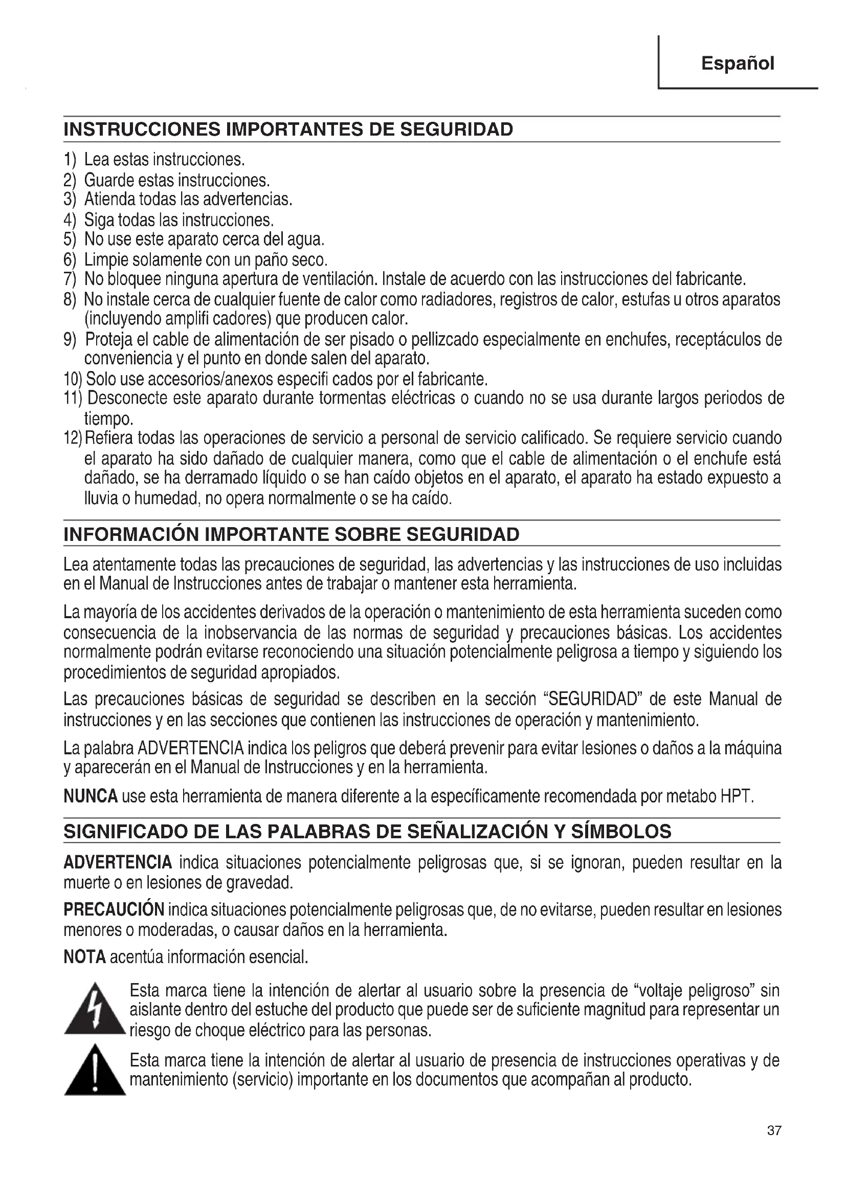 Lea atentamente todas las precauciones de seguridad, las advertencias y las instrucciones de uso incluidas en el Manual de Instrucciones antes de trabajar o mantener esta herramienta. La mayoría de los accidentes derivados de la operación o mantenimiento de esta herramienta suceden como consecuencia de la inobservancia de las normas de seguridad y precauciones básicas. Los accidentes normalmente podrán evitarse reconociendo una situación potencialmente peligrosa a tiempo y siguiendo los procedimientos de seguridad apropiados. Las precauciones básicas de seguridad se describen en la sección “SEGURIDAD” de este Manual de instrucciones y en las secciones que contienen las instrucciones de operación y mantenimiento. La palabra ADVERTENCIA indica los peligros que deberá prevenir para evitar lesiones o daños a la máquina y aparecerán en el Manual de Instrucciones y en la herramienta. NUNCA use esta herramienta de manera diferente a la específi camente recomendada por metabo HPT. SIGNIFICADO DE LAS PALABRAS DE SEÑALIZACIÓN Y SÍMBOLOS ADVERTENCIA indica situaciones potencialmente peligrosas que, si se ignoran, pueden resultar en la muerte o en lesiones de gravedad. PRECAUCIÓN indica situaciones potencialmente peligrosas que, de no evitarse, pueden resultar en lesiones menores o moderadas, o causar daños en la herramienta. NOTA acentúa información esencial. Esta marca tiene la intención de alertar al usuario sobre la presencia de “voltaje peligroso” sin aislante dentro del estuche del producto que puede ser de sufi ciente magnitud para representar un riesgo de choque eléctrico para las personas. Esta marca tiene la intención de alertar al usuario de presencia de instrucciones operativas y de mantenimiento (servicio) importante en los documentos que acompañan al producto. 000BookUR18DANA.indb37000BookUR18DANA.indb37 2021/09/2116:34:362021/09/2116:34:3638 Español SEGURIDAD Cuando utilice un aparato eléctrico, debe seguir siempre las precauciones básicas, incluidas las siguientes: