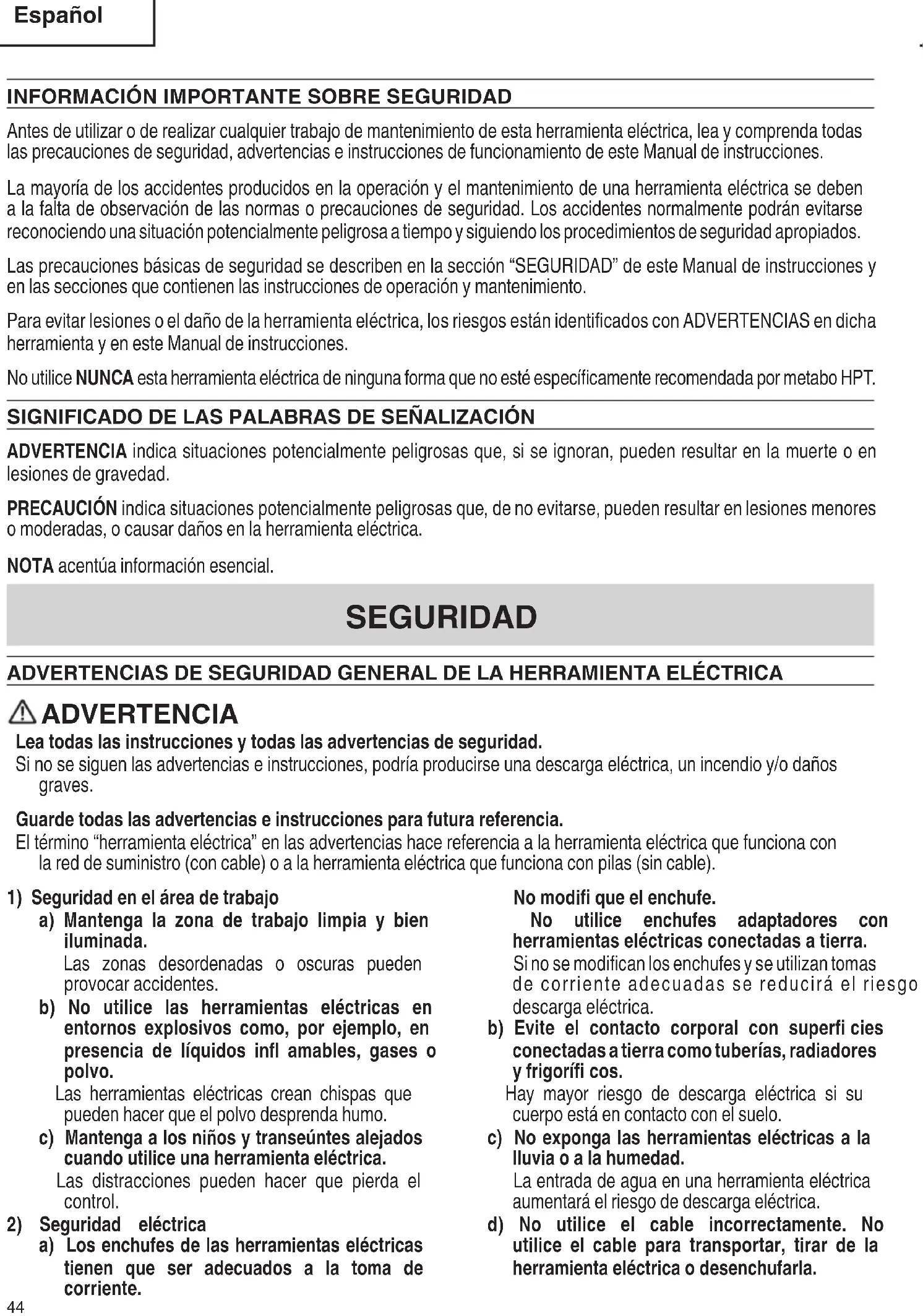 Français 00BookWH18DEXmetabo.indb4300BookWH18DEXmetabo.indb43 2022/02/0110:05:522022/02/0110:05:52INFORMACIÓN IMPORTANTE SOBRE SEGURIDAD Antes de utilizar o de realizar cualquier trabajo de mantenimiento de esta herramienta eléctrica, lea y comprenda todas las precauciones de seguridad, advertencias e instrucciones de funcionamiento de este Manual de instrucciones. La mayoría de los accidentes producidos en la operación y el mantenimiento de una herramienta eléctrica se deben a la falta de observación de las normas o precauciones de seguridad. Los accidentes normalmente podrán evitarse reconociendo una situación potencialmente peligrosa a tiempo y siguiendo los procedimientos de seguridad apropiados. Las precauciones básicas de seguridad se describen en la sección “SEGURIDAD” de este Manual de instrucciones y en las secciones que contienen las instrucciones de operación y mantenimiento. Para evitar lesiones o el daño de la herramienta eléctrica, los riesgos están identifi cados con ADVERTENCIAS en dicha herramienta y en este Manual de instrucciones. No utilice NUNCA esta herramienta eléctrica de ninguna forma que no esté específi camente recomendada por metabo HPT. SIGNIFICADO DE LAS PALABRAS DE SEÑALIZACIÓN ADVERTENCIA indica situaciones potencialmente peligrosas que, si se ignoran, pueden resultar en la muerte o en lesiones de gravedad. PRECAUCIÓN indica situaciones potencialmente peligrosas que, de no evitarse, pueden resultar en lesiones menores o moderadas, o causar daños en la herramienta eléctrica. NOTA acentúa información esencial. SEGURIDAD ADVERTENCIAS DE SEGURIDAD GENERAL DE LA HERRAMIENTA ELÉCTRICA ADVERTENCIA Lea todas las instrucciones y todas las advertencias de seguridad. Si no se siguen las advertencias e instrucciones, podría producirse una descarga eléctrica, un incendio y/o daños graves. Guarde todas las advertencias e instrucciones para futura referencia. El término “herramienta eléctrica” en las advertencias hace referencia a la herramienta eléctrica que funciona con la red de suministro (con cable) o a la herramienta eléctrica que funciona con pilas (sin cable).