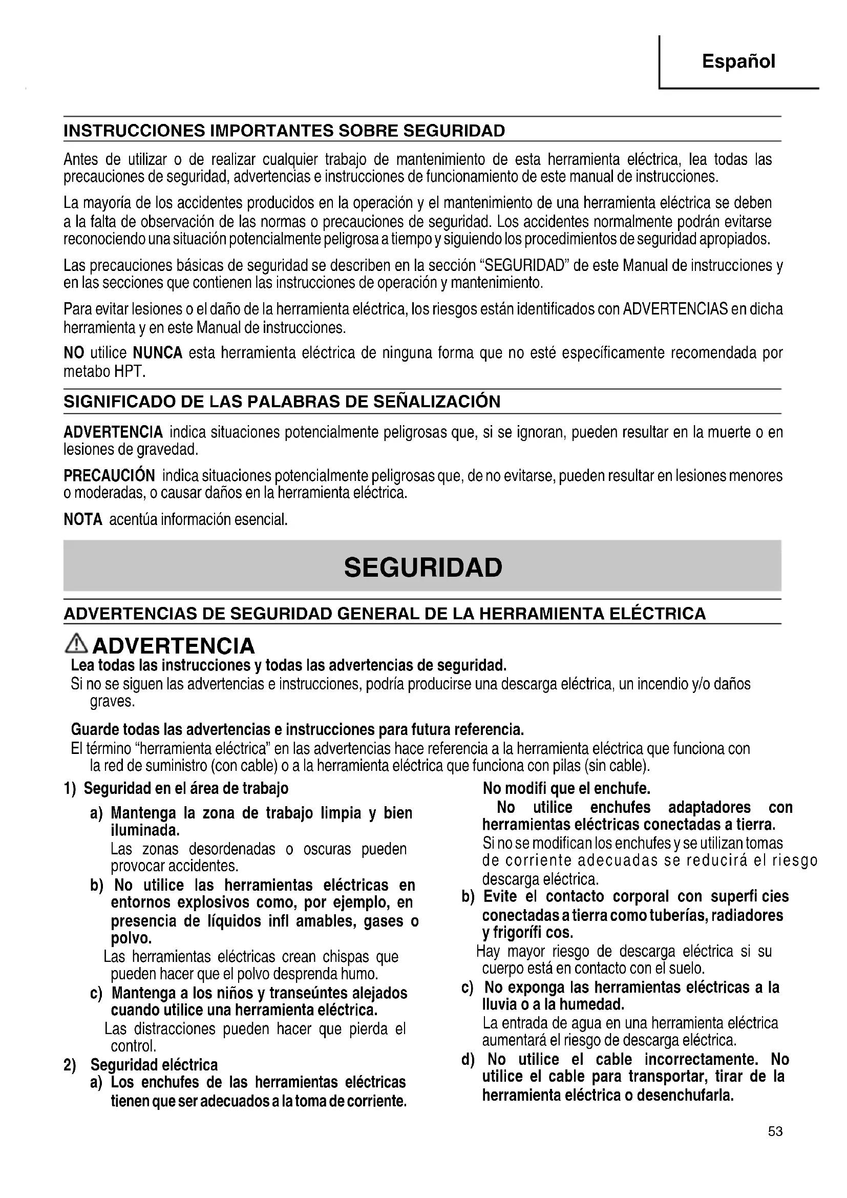 Antes de utilizar o de realizar cualquier trabajo de mantenimiento de esta herramienta eléctrica, lea todas las precauciones de seguridad, advertencias e instrucciones de funcionamiento de este manual de instrucciones. La mayoría de los accidentes producidos en la operación y el mantenimiento de una herramienta eléctrica se deben a la falta de observación de las normas o precauciones de seguridad. Los accidentes normalmente podrán evitarse reconociendo una situación potencialmente peligrosa a tiempo y siguiendo los procedimientos de seguridad apropiados. Las precauciones básicas de seguridad se describen en la sección “SEGURIDAD” de este Manual de instrucciones y en las secciones que contienen las instrucciones de operación y mantenimiento. Para evitar lesiones o el daño de la herramienta eléctrica, los riesgos están identifi cados con ADVERTENCIAS en dicha herramienta y en este Manual de instrucciones. NO utilice NUNCA esta herramienta eléctrica de ninguna forma que no esté específi camente recomendada por metabo HPT. SIGNIFICADO DE LAS PALABRAS DE SEÑALIZACIÓN ADVERTENCIA indica situaciones potencialmente peligrosas que, si se ignoran, pueden resultar en la muerte o en lesiones de gravedad. PRECAUCIÓN indica situaciones potencialmente peligrosas que, de no evitarse, pueden resultar en lesiones menores o moderadas, o causar daños en la herramienta eléctrica. NOTA acentúa información esencial. SEGURIDAD ADVERTENCIAS DE SEGURIDAD GENERAL DE LA HERRAMIENTA ELÉCTRICA ADVERTENCIA Lea todas las instrucciones y todas las advertencias de seguridad. Si no se siguen las advertencias e instrucciones, podría producirse una descarga eléctrica, un incendio y/o daños graves. Guarde todas las advertencias e instrucciones para futura referencia. El término “herramienta eléctrica” en las advertencias hace referencia a la herramienta eléctrica que funciona con la red de suministro (con cable) o a la herramienta eléctrica que funciona con pilas (sin cable).