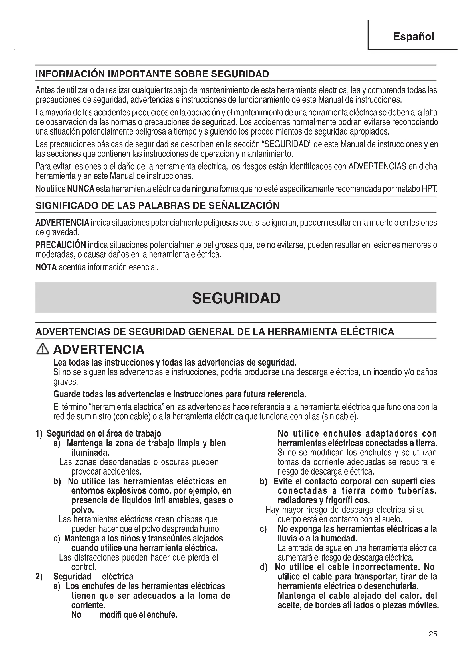 Antes de utilizar o de realizar cualquier trabajo de mantenimiento de esta herramienta eléctrica, lea y comprenda todas las precauciones de seguridad, advertencias e instrucciones de funcionamiento de este Manual de instrucciones. La mayoría de los accidentes producidos en la operación y el mantenimiento de una herramienta eléctrica se deben a la falta de observación de las normas o precauciones de seguridad. Los accidentes normalmente podrán evitarse reconociendo una situación potencialmente peligrosa a tiempo y siguiendo los procedimientos de seguridad apropiados. Las precauciones básicas de seguridad se describen en la sección “SEGURIDAD” de este Manual de instrucciones y en las secciones que contienen las instrucciones de operación y mantenimiento. Para evitar lesiones o el daño de la herramienta eléctrica, los riesgos están identifi cados con ADVERTENCIAS en dicha herramienta y en este Manual de instrucciones. No utilice NUNCA esta herramienta eléctrica de ninguna forma que no esté específi camente recomendada por metabo HPT. SIGNIFICADO DE LAS PALABRAS DE SEÑALIZACIÓN ADVERTENCIA indica situaciones potencialmente peligrosas que, si se ignoran, pueden resultar en la muerte o en lesiones de gravedad. PRECAUCIÓN indica situaciones potencialmente peligrosas que, de no evitarse, pueden resultar en lesiones menores o moderadas, o causar daños en la herramienta eléctrica. NOTA acentúa información esencial.