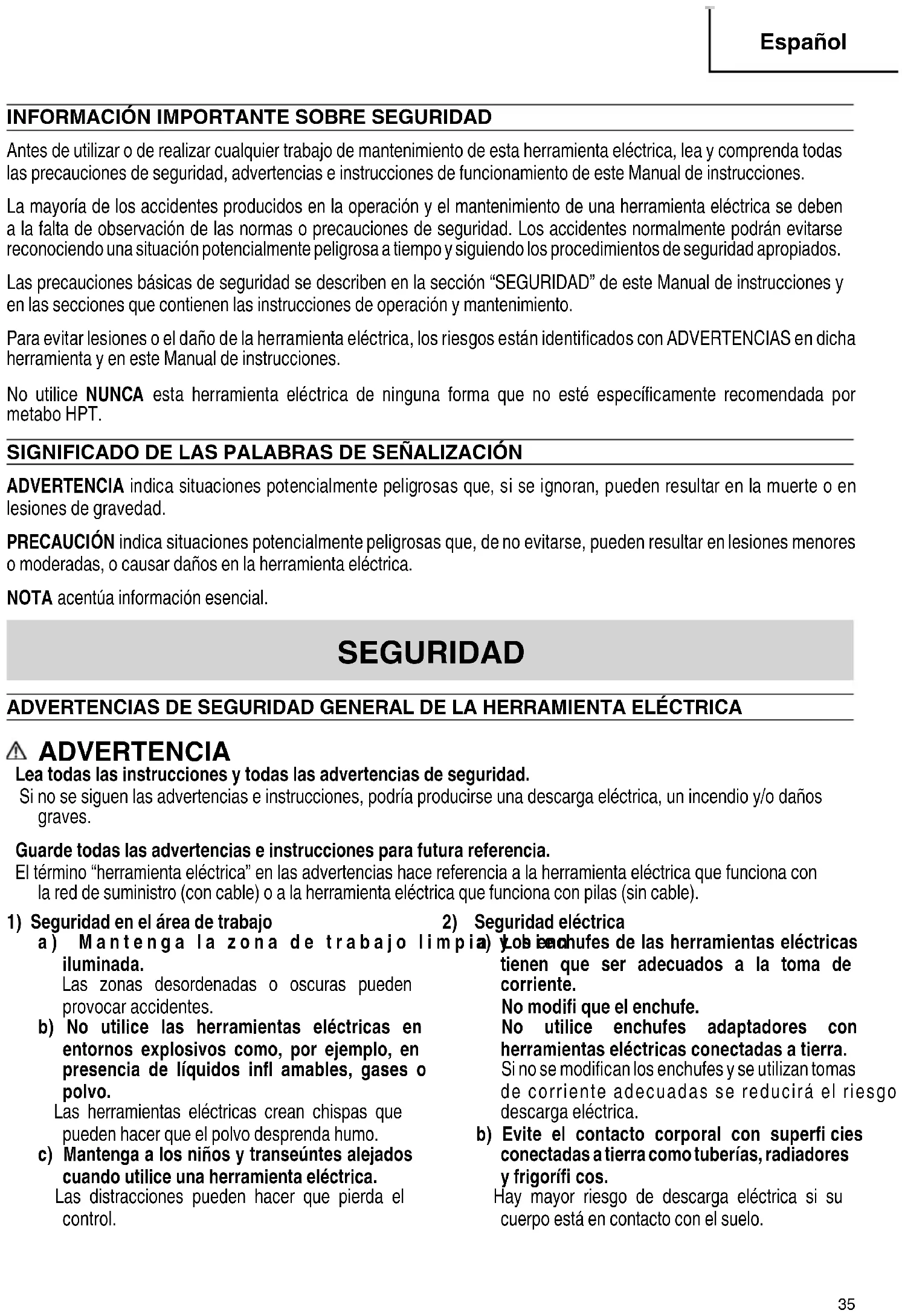 Français 000BookDN18DSLUS.indb34000BookDN18DSLUS.indb34 2018/10/2414:08:482018/10/2414:08:48INFORMACIÓN IMPORTANTE SOBRE SEGURIDAD Antes de utilizar o de realizar cualquier trabajo de mantenimiento de esta herramienta eléctrica, lea y comprenda todas las precauciones de seguridad, advertencias e instrucciones de funcionamiento de este Manual de instrucciones. La mayoría de los accidentes producidos en la operación y el mantenimiento de una herramienta eléctrica se deben a la falta de observación de las normas o precauciones de seguridad. Los accidentes normalmente podrán evitarse reconociendo una situación potencialmente peligrosa a tiempo y siguiendo los procedimientos de seguridad apropiados. Las precauciones básicas de seguridad se describen en la sección “SEGURIDAD” de este Manual de instrucciones y en las secciones que contienen las instrucciones de operación y mantenimiento. Para evitar lesiones o el daño de la herramienta eléctrica, los riesgos están identifi cados con ADVERTENCIAS en dicha herramienta y en este Manual de instrucciones. No utilice NUNCA esta herramienta eléctrica de ninguna forma que no esté específi camente recomendada por metabo HPT. SIGNIFICADO DE LAS PALABRAS DE SEÑALIZACIÓN ADVERTENCIA indica situaciones potencialmente peligrosas que, si se ignoran, pueden resultar en la muerte o en lesiones de gravedad. PRECAUCIÓN indica situaciones potencialmente peligrosas que, de no evitarse, pueden resultar en lesiones menores o moderadas, o causar daños en la herramienta eléctrica. NOTA acentúa información esencial. SEGURIDAD ADVERTENCIAS DE SEGURIDAD GENERAL DE LA HERRAMIENTA ELÉCTRICA ADVERTENCIA Lea todas las instrucciones y todas las advertencias de seguridad. Si no se siguen las advertencias e instrucciones, podría producirse una descarga eléctrica, un incendio y/o daños graves. Guarde todas las advertencias e instrucciones para futura referencia. El término “herramienta eléctrica” en las advertencias hace referencia a la herramienta eléctrica que funciona con la red de suministro (con cable) o a la herramienta eléctrica que funciona con pilas (sin cable).