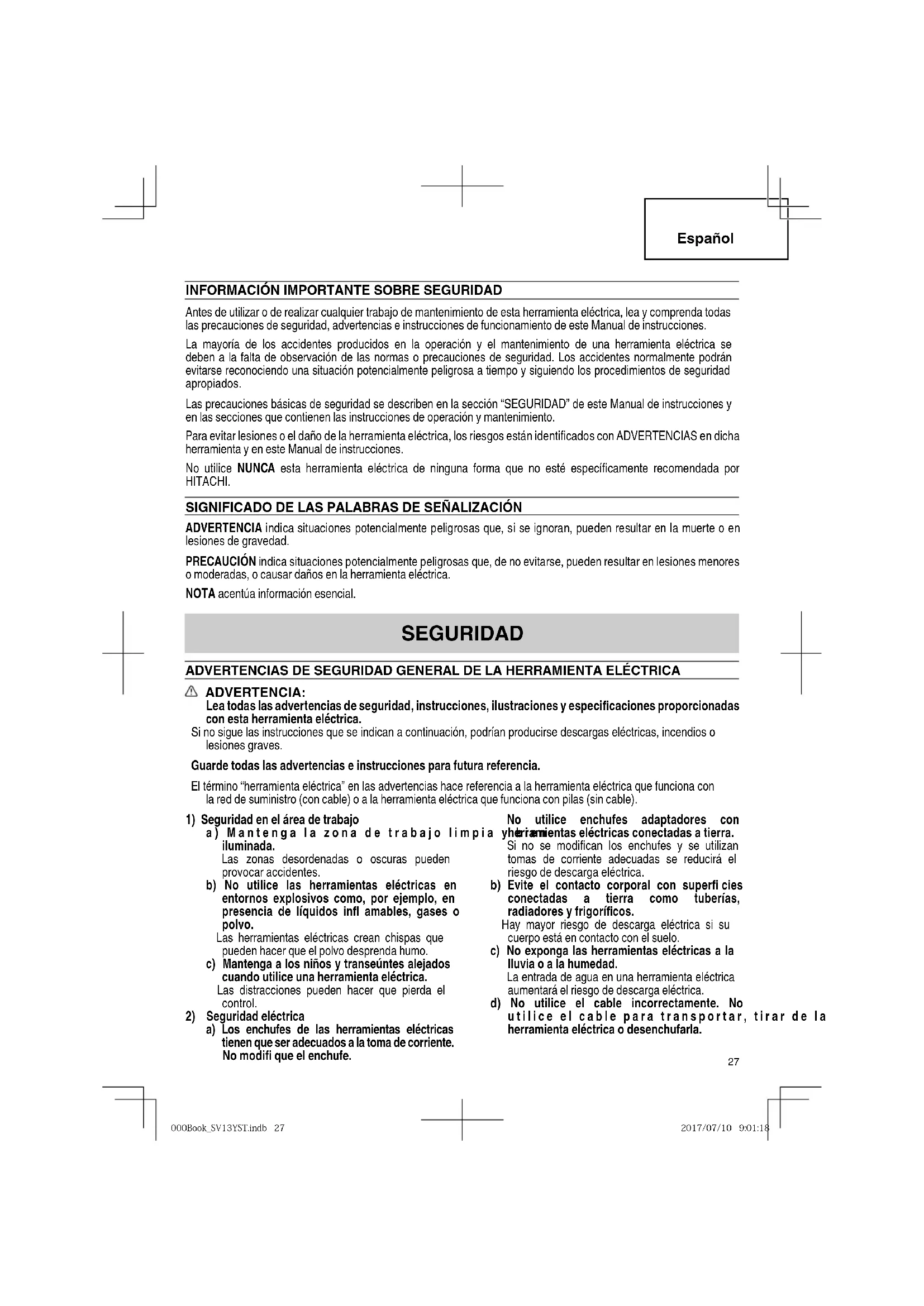 Antes de utilizar o de realizar cualquier trabajo de mantenimiento de esta herramienta eléctrica, lea y comprenda todas las precauciones de seguridad, advertencias e instrucciones de funcionamiento de este Manual de instrucciones. La mayoría de los accidentes producidos en la operación y el mantenimiento de una herramienta eléctrica se deben a la falta de observación de las normas o precauciones de seguridad. Los accidentes normalmente podrán evitarse reconociendo una situación potencialmente peligrosa a tiempo y siguiendo los procedimientos de seguridad apropiados. Las precauciones básicas de seguridad se describen en la sección “SEGURIDAD” de este Manual de instrucciones y en las secciones que contienen las instrucciones de operación y mantenimiento. Para evitar lesiones o el daño de la herramienta eléctrica, los riesgos están identifi cados con ADVERTENCIAS en dicha herramienta y en este Manual de instrucciones. No utilice NUNCA esta herramienta eléctrica de ninguna forma que no esté específi camente recomendada por HITACHI. SIGNIFICADO DE LAS PALABRAS DE SEÑALIZACIÓN ADVERTENCIA indica situaciones potencialmente peligrosas que, si se ignoran, pueden resultar en la muerte o en lesiones de gravedad. PRECAUCIÓN indica situaciones potencialmente peligrosas que, de no evitarse, pueden resultar en lesiones menores o moderadas, o causar daños en la herramienta eléctrica. NOTA acentúa información esencial. SEGURIDAD ADVERTENCIAS DE SEGURIDAD GENERAL DE LA HERRAMIENTA ELÉCTRICA ADVERTENCIA: Lea todas las advertencias de seguridad, instrucciones, ilustraciones y especifi caciones proporcionadas con esta herramienta eléctrica. Si no sigue las instrucciones que se indican a continuación, podrían producirse descargas eléctricas, incendios o lesiones graves. Guarde todas las advertencias e instrucciones para futura referencia. El término “herramienta eléctrica” en las advertencias hace referencia a la herramienta eléctrica que funciona con la red de suministro (con cable) o a la herramienta eléctrica que funciona con pilas (sin cable).