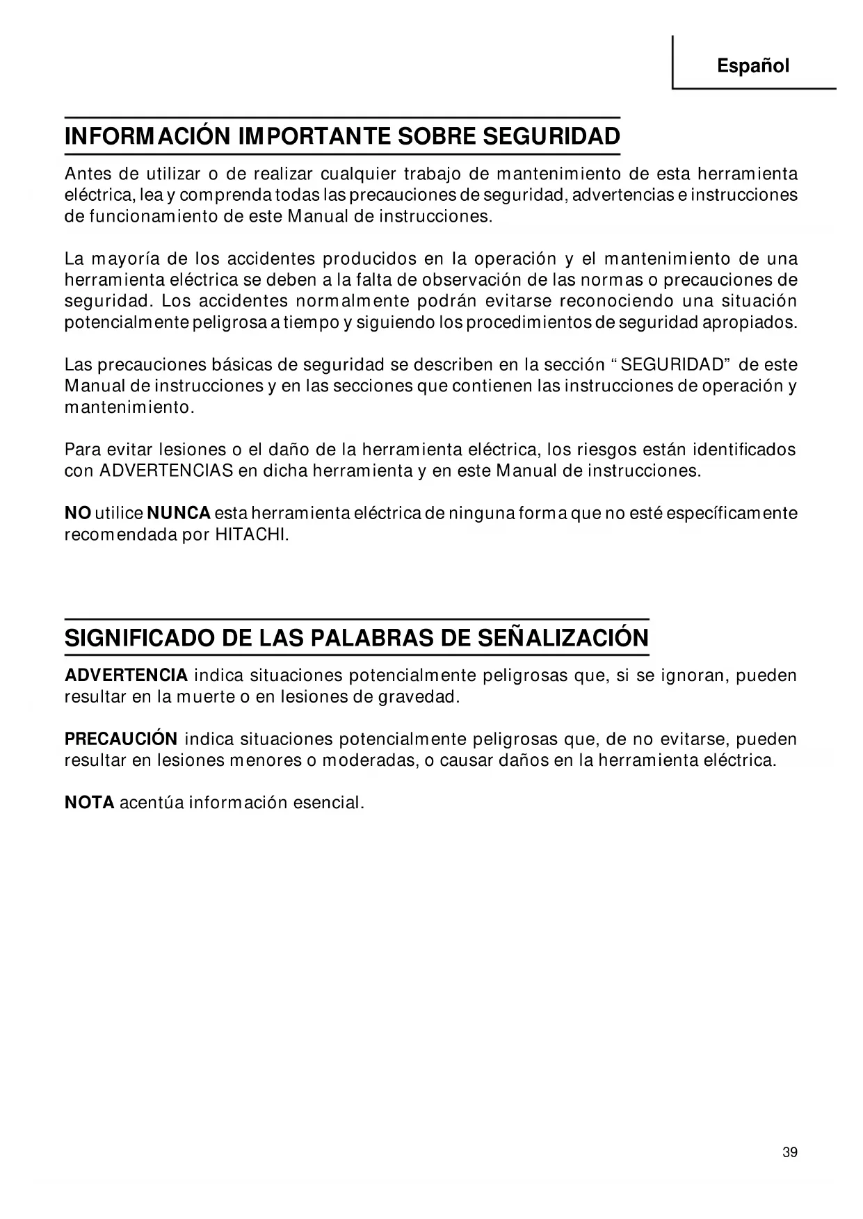 Antes de utilizar o de realizar cualquier trabajo de mantenimiento de esta herramienta eléctrica, lea y comprenda todas las precauciones de seguridad, advertencias e instrucciones de funcionamiento de este Manual de instrucciones. La mayoría de los accidentes producidos en la operación y el mantenimiento de una herramienta eléctrica se deben a la falta de observación de las normas o precauciones de seguridad. Los accidentes normalmente podrán evitarse reconociendo una situación potencialmente peligrosa a tiempo y siguiendo los procedimientos de seguridad apropiados. Las precauciones básicas de seguridad se describen en la sección “SEGURIDAD” de este Manual de instrucciones y en las secciones que contienen las instrucciones de operación y mantenimiento. Para evitar lesiones o el daño de la herramienta eléctrica, los riesgos están identificados con ADVERTENCIAS en dicha herramienta y en este Manual de instrucciones. NO utilice NUNCA esta herramienta eléctrica de ninguna forma que no esté específicamente recomendada por HITACHI. SIGNIFICADO DE LAS PALABRAS DE SEÑALIZACIÓN ADVERTENCIA indica situaciones potencialmente peligrosas que, si se ignoran, pueden resultar en la muerte o en lesiones de gravedad. PRECAUCIÓN indica situaciones potencialmente peligrosas que, de no evitarse, pueden resultar en lesiones menores o moderadas, o causar daños en la herramienta eléctrica. NOTA acentúa información esencial.40 Español SEGURIDAD