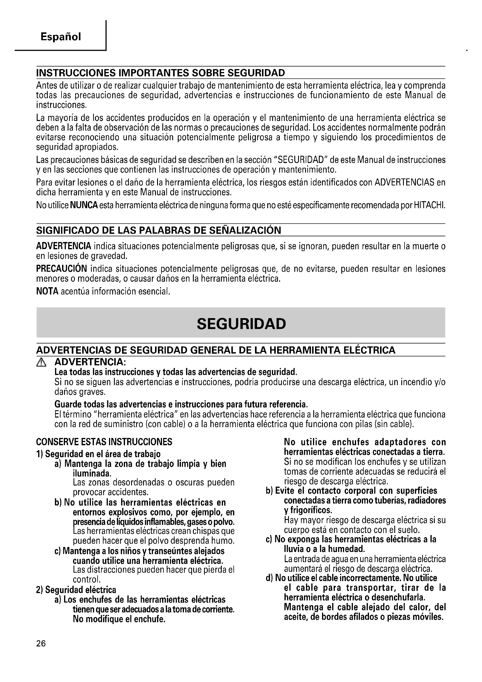 Antes de utilizar o de realizar cualquier trabajo de mantenimiento de esta herramienta eléctrica, lea y comprenda todas las precauciones de seguridad, advertencias e instrucciones de funcionamiento de este Manual de instrucciones. La mayoría de los accidentes producidos en la operación y el mantenimiento de una herramienta eléctrica se deben a la falta de observación de las normas o precauciones de seguridad. Los accidentes normalmente podrán evitarse reconociendo una situación potencialmente peligrosa a tiempo y siguiendo los procedimientos de seguridad apropiados. Las precauciones básicas de seguridad se describen en la sección “SEGURIDAD” de este Manual de instrucciones y en las secciones que contienen las instrucciones de operación y mantenimiento. Para evitar lesiones o el daño de la herramienta eléctrica, los riesgos están identificados con ADVERTENCIAS en dicha herramienta y en este Manual de instrucciones. No utilice NUNCA esta herramienta eléctrica de ninguna forma que no esté específicamente recomendada por HITACHI. SIGNIFICADO DE LAS PALABRAS DE SEÑALIZACIÓN ADVERTENCIA indica situaciones potencialmente peligrosas que, si se ignoran, pueden resultar en la muerte o en lesiones de gravedad. PRECAUCIÓN indica situaciones potencialmente peligrosas que, de no evitarse, pueden resultar en lesiones menores o moderadas, o causar daños en la herramienta eléctrica. NOTA acentúa información esencial. SEGURIDAD ADVERTENCIAS DE SEGURIDAD GENERAL DE LA HERRAMIENTA ELÉCTRICA ADVERTENCIA: Lea todas las instrucciones y todas las advertencias de seguridad. Si no se siguen las advertencias e instrucciones, podría producirse una descarga eléctrica, un incendio y/o daños graves. Guarde todas las advertencias e instrucciones para futura referencia. El término “herramienta eléctrica” en las advertencias hace referencia a la herramienta eléctrica que funciona con la red de suministro (con cable) o a la herramienta eléctrica que funciona con pilas (sin cable). No utilice enchufes adaptadores con herramientas eléctricas conectadas a tierra. Si no se modifican los enchufes y se utilizan tomas de corriente adecuadas se reducirá el riesgo de descarga eléctrica. b) Evite el contacto corporal con superficies conectadas a tierra como tuberías, radiadores y frigoríficos. Hay mayor riesgo de descarga eléctrica si su cuerpo está en contacto con el suelo. c) No exponga las herramientas eléctricas a la lluvia o a la humedad. La entrada de agua en una herramienta eléctrica aumentará el riesgo de descarga eléctrica. d) No utilice el cable incorrectamente. No utilice el cable para transportar, tirar de la herramienta eléctrica o desenchufarla. Mantenga el cable alejado del calor, del aceite, de bordes afilados o piezas móviles.