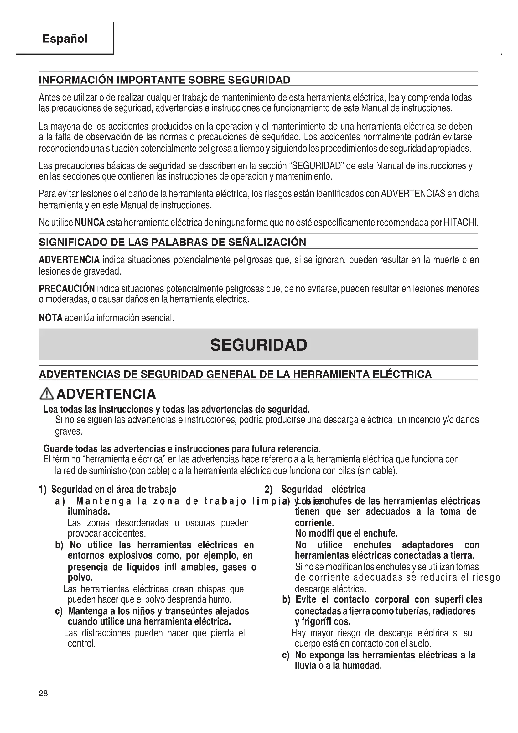 Français 0000G12VE.indb270000G12VE.indb27 2016/09/278:58:292016/09/278:58:29INFORMACIÓN IMPORTANTE SOBRE SEGURIDAD Antes de utilizar o de realizar cualquier trabajo de mantenimiento de esta herramienta eléctrica, lea y comprenda todas las precauciones de seguridad, advertencias e instrucciones de funcionamiento de este Manual de instrucciones. La mayoría de los accidentes producidos en la operación y el mantenimiento de una herramienta eléctrica se deben a la falta de observación de las normas o precauciones de seguridad. Los accidentes normalmente podrán evitarse reconociendo una situación potencialmente peligrosa a tiempo y siguiendo los procedimientos de seguridad apropiados. Las precauciones básicas de seguridad se describen en la sección “SEGURIDAD” de este Manual de instrucciones y en las secciones que contienen las instrucciones de operación y mantenimiento. Para evitar lesiones o el daño de la herramienta eléctrica, los riesgos están identifi cados con ADVERTENCIAS en dicha herramienta y en este Manual de instrucciones. No utilice NUNCA esta herramienta eléctrica de ninguna forma que no esté específi camente recomendada por HITACHI. SIGNIFICADO DE LAS PALABRAS DE SEÑALIZACIÓN ADVERTENCIA indica situaciones potencialmente peligrosas que, si se ignoran, pueden resultar en la muerte o en lesiones de gravedad. PRECAUCIÓN indica situaciones potencialmente peligrosas que, de no evitarse, pueden resultar en lesiones menores o moderadas, o causar daños en la herramienta eléctrica. NOTA acentúa información esencial. SEGURIDAD ADVERTENCIAS DE SEGURIDAD GENERAL DE LA HERRAMIENTA ELÉCTRICA ADVERTENCIA Lea todas las instrucciones y todas las advertencias de seguridad. Si no se siguen las advertencias e instrucciones, podría producirse una descarga eléctrica, un incendio y/o daños graves. Guarde todas las advertencias e instrucciones para futura referencia. El término “herramienta eléctrica” en las advertencias hace referencia a la herramienta eléctrica que funciona con la red de suministro (con cable) o a la herramienta eléctrica que funciona con pilas (sin cable).