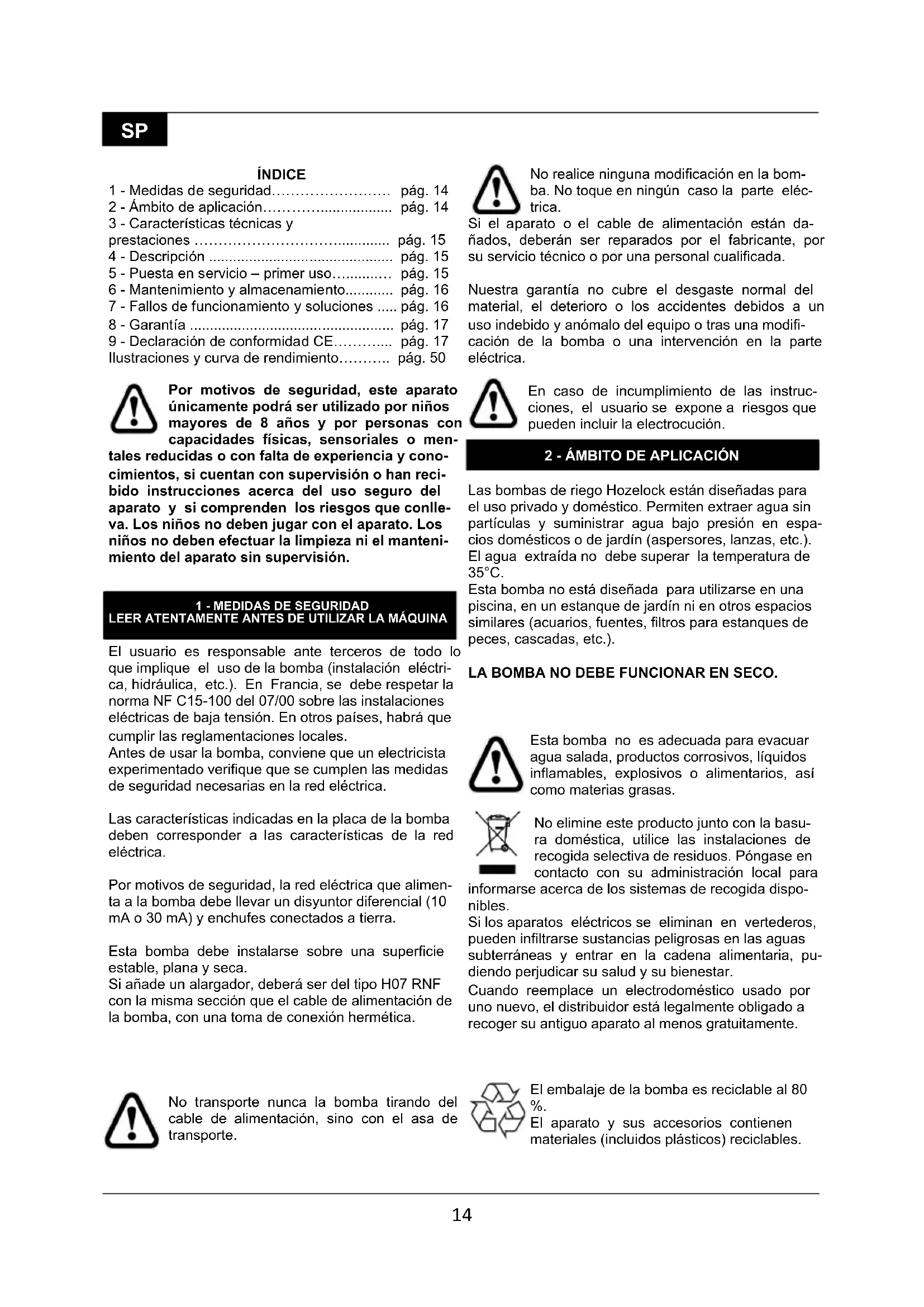 LEER ATENTAMENTE ANTES DE UTILIZAR LA MÁQUINA El usuario es responsable ante terceros de todo lo que implique el uso de la bomba (instalación eléctri- ca, hidráulica, etc.). En Francia, se debe respetar la norma NF C15-100 del 07/00 sobre las instalaciones eléctricas de baja tensión. En otros países, habrá que cumplir las reglamentaciones locales. Antes de usar la bomba, conviene que un electricista experimentado verifique que se cumplen las medidas de seguridad necesarias en la red eléctrica. Las características indicadas en la placa de la bomba deben corresponder a las características de la red eléctrica. Por motivos de seguridad, la red eléctrica que alimen- ta a la bomba debe llevar un disyuntor diferencial (10 mA o 30 mA) y enchufes conectados a tierra. Esta bomba debe instalarse sobre una superficie estable, plana y seca. Si añade un alargador, deberá ser del tipo H07 RNF con la misma sección que el cable de alimentación de la bomba, con una toma de conexión hermética.