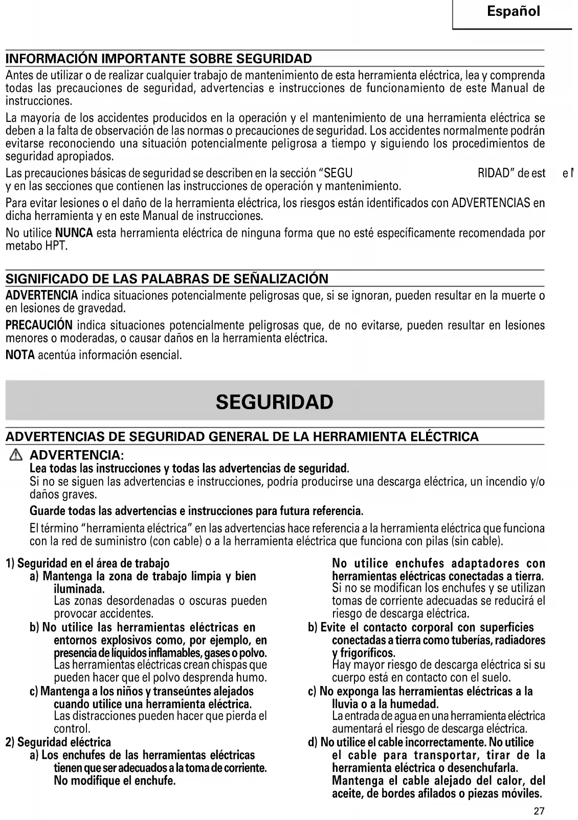 Antes de utilizar o de realizar cualquier trabajo de mantenimiento de esta herramienta eléctrica, lea y comprenda todas las precauciones de seguridad, advertencias e instrucciones de funcionamiento de este Manual de instrucciones. La mayoría de los accidentes producidos en la operación y el mantenimiento de una herramienta eléctrica se deben a la falta de observación de las normas o precauciones de seguridad. Los accidentes normalmente podrán evitarse reconociendo una situación potencialmente peligrosa a tiempo y siguiendo los procedimientos de seguridad apropiados. Las precauciones básicas de seguridad se describen en la sección “SEGU RIDAD” de est e Manual de instrucciones y en las secciones que contienen las instrucciones de operación y mantenimiento. Para evitar lesiones o el daño de la herramienta eléctrica, los riesgos están identificados con ADVERTENCIAS en dicha herramienta y en este Manual de instrucciones. No utilice NUNCA esta herramienta eléctrica de ninguna forma que no esté específicamente recomendada por metabo HPT. SIGNIFICADO DE LAS PALABRAS DE SEÑALIZACIÓN ADVERTENCIA indica situaciones potencialmente peligrosas que, si se ignoran, pueden resultar en la muerte o en lesiones de gravedad. PRECAUCIÓN indica situaciones potencialmente peligrosas que, de no evitarse, pueden resultar en lesiones menores o moderadas, o causar daños en la herramienta eléctrica. NOTA acentúa información esencial. SEGURIDAD ADVERTENCIAS DE SEGURIDAD GENERAL DE LA HERRAMIENTA ELÉCTRICA ADVERTENCIA: Lea todas las instrucciones y todas las advertencias de seguridad. Si no se siguen las advertencias e instrucciones, podría producirse una descarga eléctrica, un incendio y/o daños graves. Guarde todas las advertencias e instrucciones para futura referencia. El término “herramienta eléctrica” en las advertencias hace referencia a la herramienta eléctrica que funciona con la red de suministro (con cable) o a la herramienta eléctrica que funciona con pilas (sin cable).