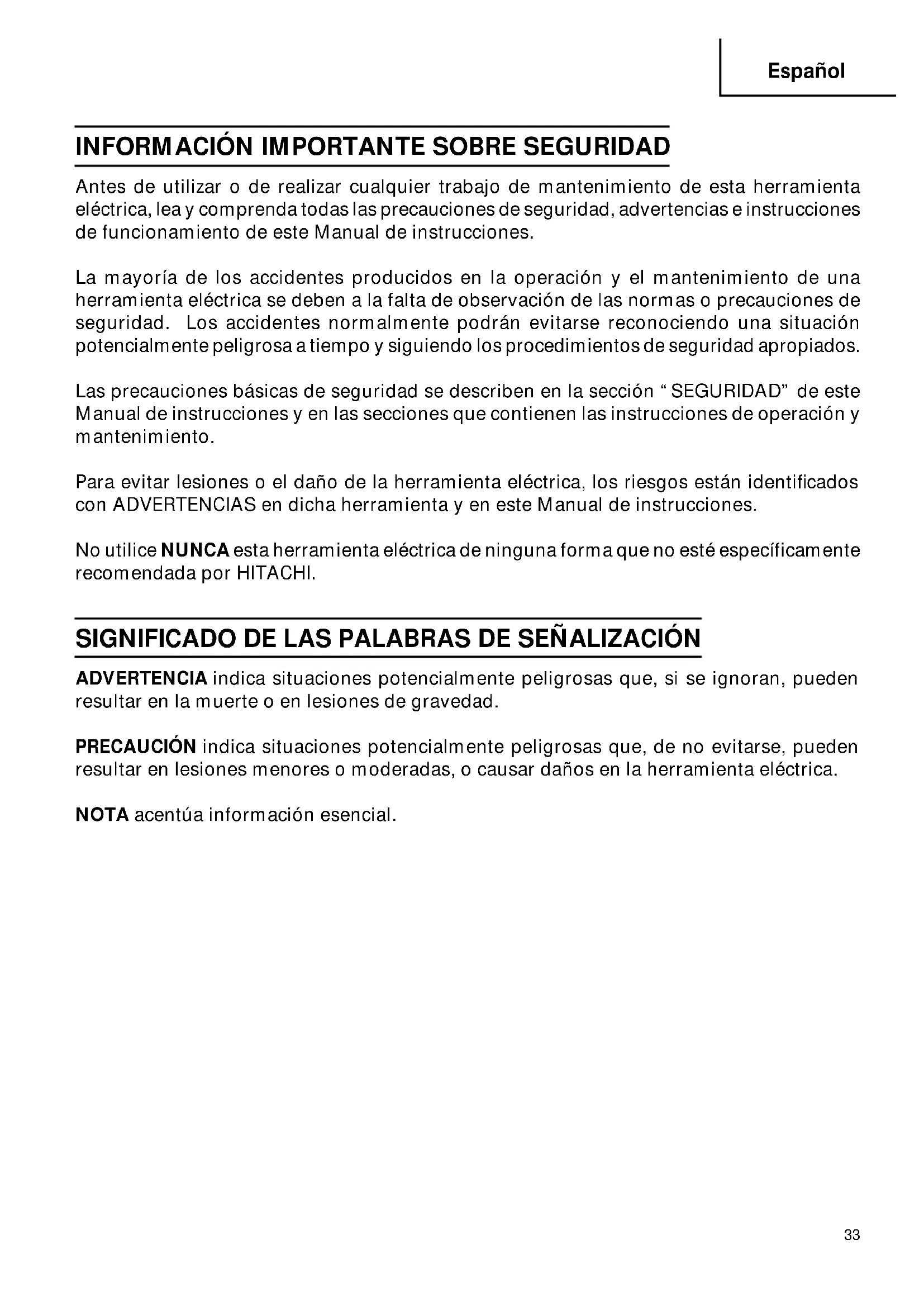 Antes de utilizar o de realizar cualquier trabajo de mantenimiento de esta herramienta eléctrica, lea y comprenda todas las precauciones de seguridad, advertencias e instrucciones de funcionamiento de este Manual de instrucciones. La mayoría de los accidentes producidos en la operación y el mantenimiento de una herramienta eléctrica se deben a la falta de observación de las normas o precauciones de seguridad. Los accidentes normalmente podrán evitarse reconociendo una situación potencialmente peligrosa a tiempo y siguiendo los procedimientos de seguridad apropiados. Las precauciones básicas de seguridad se describen en la sección “SEGURIDAD” de este Manual de instrucciones y en las secciones que contienen las instrucciones de operación y mantenimiento. Para evitar lesiones o el daño de la herramienta eléctrica, los riesgos están identificados con ADVERTENCIAS en dicha herramienta y en este Manual de instrucciones. No utilice NUNCA esta herramienta eléctrica de ninguna forma que no esté específicamente recomendada por HITACHI. SIGNIFICADO DE LAS PALABRAS DE SEÑALIZACIÓN ADVERTENCIA indica situaciones potencialmente peligrosas que, si se ignoran, pueden resultar en la muerte o en lesiones de gravedad. PRECAUCIÓN indica situaciones potencialmente peligrosas que, de no evitarse, pueden resultar en lesiones menores o moderadas, o causar daños en la herramienta eléctrica. NOTA acentúa información esencial.34 Español SEGURIDAD