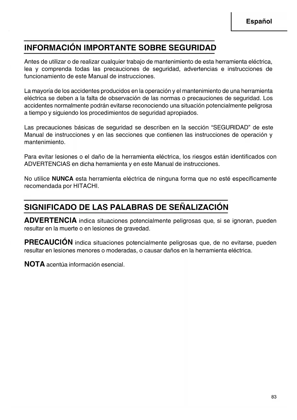 Antes de utilizar o de realizar cualquier trabajo de mantenimiento de esta herramienta eléctrica, lea y comprenda todas las precauciones de seguridad, advertencias e instrucciones de funcionamiento de este Manual de instrucciones. La mayoría de los accidentes producidos en la operación y el mantenimiento de una herramienta eléctrica se deben a la falta de observación de las normas o precauciones de seguridad. Los accidentes normalmente podrán evitarse reconociendo una situación potencialmente peligrosa a tiempo y siguiendo los procedimientos de seguridad apropiados. Las precauciones básicas de seguridad se describen en la sección “SEGURIDAD” de este Manual de instrucciones y en las secciones que contienen las instrucciones de operación y mantenimiento. Para evitar lesiones o el daño de la herramienta eléctrica, los riesgos están identifi cados con ADVERTENCIAS en dicha herramienta y en este Manual de instrucciones. No utilice NUNCA esta herramienta eléctrica de ninguna forma que no esté específi camente recomendada por HITACHI. SIGNIFICADO DE LAS PALABRAS DE SEÑALIZACIÓN ADVERTENCIA indica situaciones potencialmente peligrosas que, si se ignoran, pueden resultar en la muerte o en lesiones de gravedad. PRECAUCIÓN indica situaciones potencialmente peligrosas que, de no evitarse, pueden resultar en lesiones menores o moderadas, o causar daños en la herramienta eléctrica. NOTA acentúa información esencial. 0000BookC12RSH2.indb830000BookC12RSH2.indb83 2017/08/3010:30:552017/08/3010:30:5584 Español SEGURIDAD