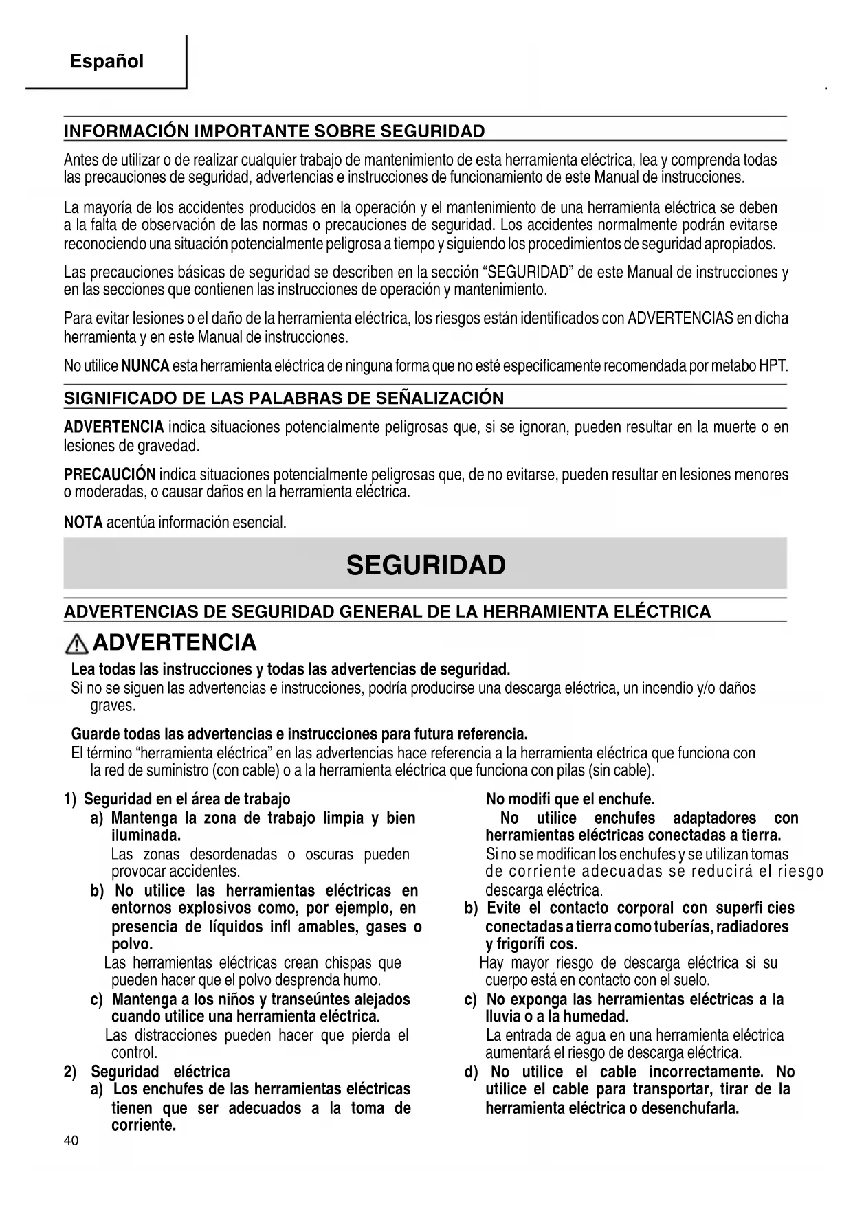 Français 00BookDS18DFXmetabo.indb3900BookDS18DFXmetabo.indb39 2021/09/2815:33:402021/09/2815:33:40INFORMACIÓN IMPORTANTE SOBRE SEGURIDAD Antes de utilizar o de realizar cualquier trabajo de mantenimiento de esta herramienta eléctrica, lea y comprenda todas las precauciones de seguridad, advertencias e instrucciones de funcionamiento de este Manual de instrucciones. La mayoría de los accidentes producidos en la operación y el mantenimiento de una herramienta eléctrica se deben a la falta de observación de las normas o precauciones de seguridad. Los accidentes normalmente podrán evitarse reconociendo una situación potencialmente peligrosa a tiempo y siguiendo los procedimientos de seguridad apropiados. Las precauciones básicas de seguridad se describen en la sección “SEGURIDAD” de este Manual de instrucciones y en las secciones que contienen las instrucciones de operación y mantenimiento. Para evitar lesiones o el daño de la herramienta eléctrica, los riesgos están identifi cados con ADVERTENCIAS en dicha herramienta y en este Manual de instrucciones. No utilice NUNCA esta herramienta eléctrica de ninguna forma que no esté específi camente recomendada por metabo HPT. SIGNIFICADO DE LAS PALABRAS DE SEÑALIZACIÓN ADVERTENCIA indica situaciones potencialmente peligrosas que, si se ignoran, pueden resultar en la muerte o en lesiones de gravedad. PRECAUCIÓN indica situaciones potencialmente peligrosas que, de no evitarse, pueden resultar en lesiones menores o moderadas, o causar daños en la herramienta eléctrica. NOTA acentúa información esencial. SEGURIDAD ADVERTENCIAS DE SEGURIDAD GENERAL DE LA HERRAMIENTA ELÉCTRICA ADVERTENCIA Lea todas las instrucciones y todas las advertencias de seguridad. Si no se siguen las advertencias e instrucciones, podría producirse una descarga eléctrica, un incendio y/o daños graves. Guarde todas las advertencias e instrucciones para futura referencia. El término “herramienta eléctrica” en las advertencias hace referencia a la herramienta eléctrica que funciona con la red de suministro (con cable) o a la herramienta eléctrica que funciona con pilas (sin cable).