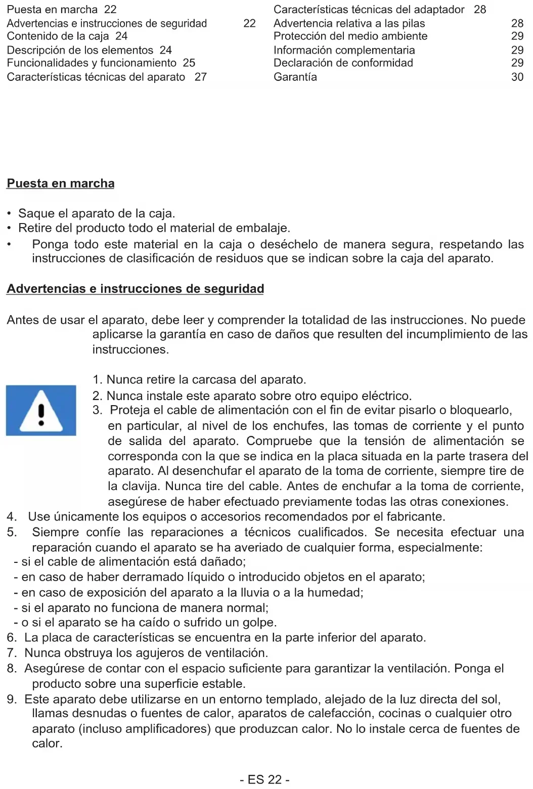 Contenido de la caja 24 Descripción de los elementos 24 Funcionalidades y funcionamiento 25 Características técnicas del aparato 27 Características técnicas del adaptador 28 Advertencia relativa a las pilas 28 Protección del medio ambiente 29 Información complementaria 29 Declaración de conformidad 29 Garantía 30- ES 23 -