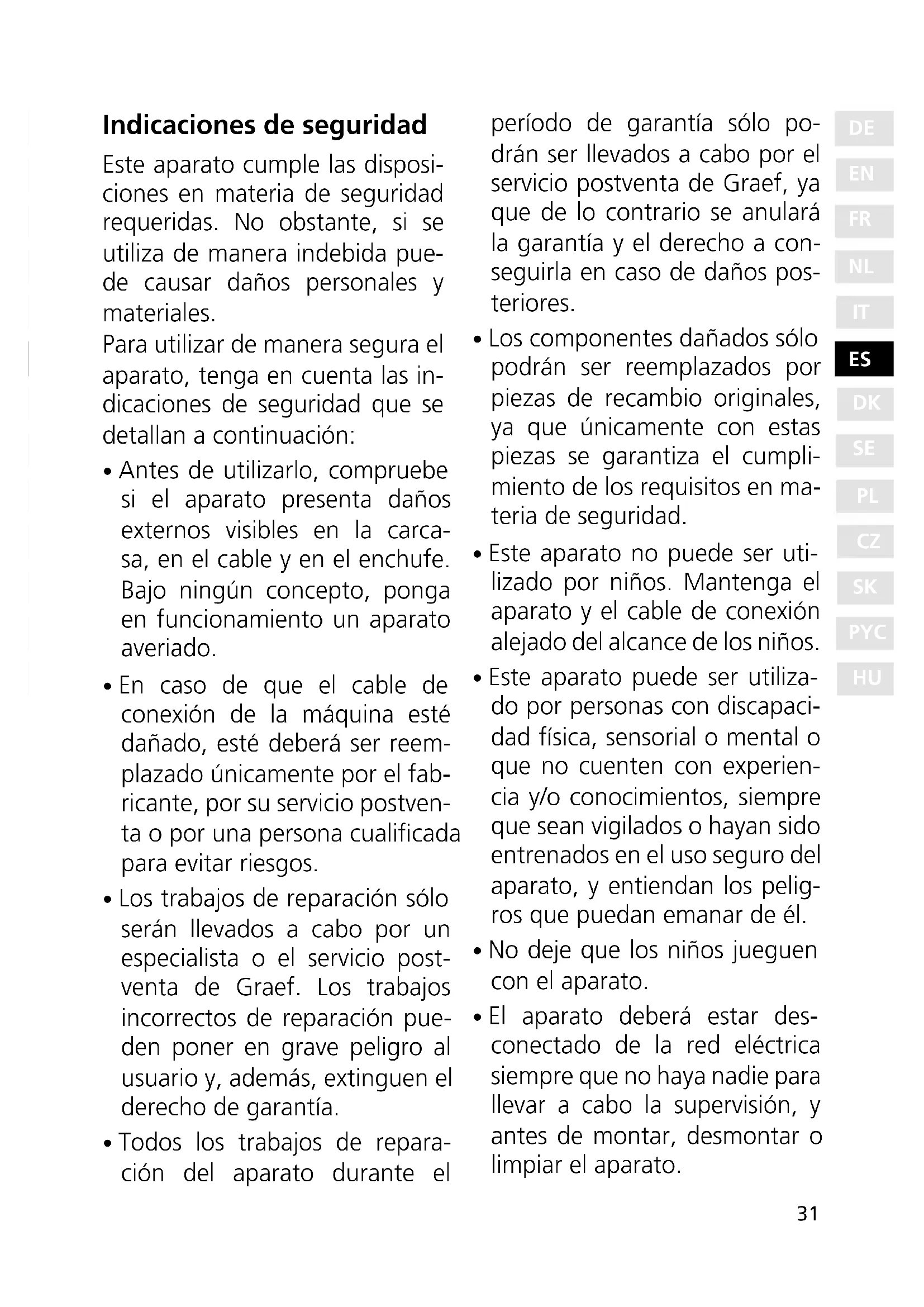 - Todos los trabajos de repara- ción del aparato durante el período de garantía sólo po- drán ser llevados a cabo por el servicio postventa de Graef, ya que de lo contrario se anulará la garantía y el derecho a con- seguirla en caso de daños pos- teriores.