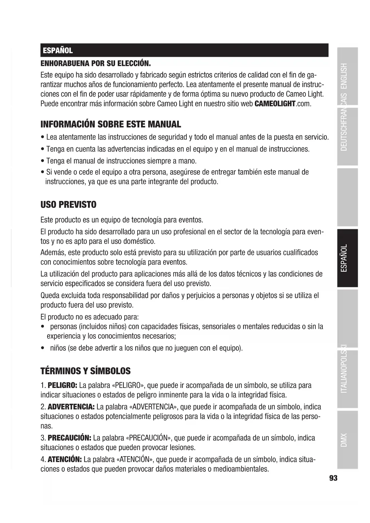 DMX DEUTSCHFRANCAIS ESPAÑOL ENGLISH ITALIANO POLSKI ESPAÑOL ENHORABUENA POR SU ELECCIÓN. Este equipo ha sido desarrollado y fabricado según estrictos criterios de calidad con el fin de ga- rantizar muchos años de funcionamiento perfecto. Lea atentamente el presente manual de instruc- ciones con el fin de poder usar rápidamente y de forma óptima su nuevo producto de Cameo Light. Puede encontrar más información sobre Cameo Light en nuestro sitio web CAMEOLIGHT.com.