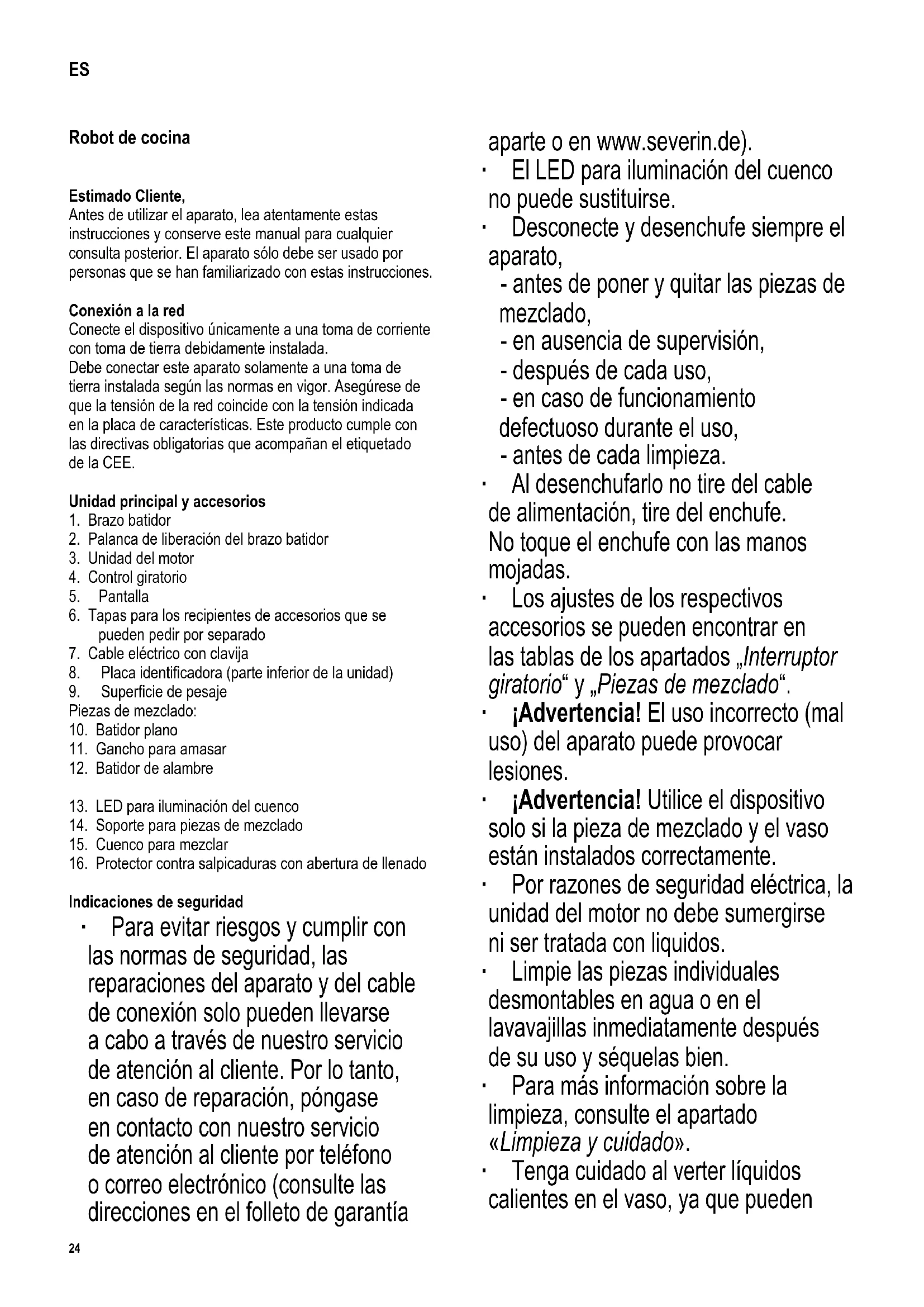 Indicaciones de seguridad ∙ Para evitar riesgos y cumplir con las normas de seguridad, las reparaciones del aparato y del cable de conexión solo pueden llevarse a cabo a través de nuestro servicio de atención al cliente. Por lo tanto, en caso de reparación, póngase en contacto con nuestro servicio de atención al cliente por teléfono o correo electrónico (consulte las direcciones en el folleto de garantía aparte o en www.severin.de). ∙ El LED para iluminación del cuenco no puede sustituirse. ∙ Desconecte y desenchufe siempre el aparato, - antes de poner y quitar las piezas de mezclado, - en ausencia de supervisión, - después de cada uso, - en caso de funcionamiento defectuoso durante el uso, - antes de cada limpieza. ∙ Al desenchufarlo no tire del cable de alimentación, tire del enchufe. No toque el enchufe con las manos mojadas. ∙ Los ajustes de los respectivos accesorios se pueden encontrar en las tablas de los apartados „Interruptor giratorio“ y „Piezas de mezclado“. ∙ ¡Advertencia! El uso incorrecto (mal uso) del aparato puede provocar lesiones. ∙ ¡Advertencia! Utilice el dispositivo solo si la pieza de mezclado y el vaso están instalados correctamente. ∙ Por razones de seguridad eléctrica, la unidad del motor no debe sumergirse ni ser tratada con liquidos. ∙ Limpie las piezas individuales desmontables en agua o en el lavavajillas inmediatamente después de su uso y séquelas bien. ∙ Para más información sobre la limpieza, consulte el apartado «Limpieza y cuidado». ∙ Tenga cuidado al verter líquidos calientes en el vaso, ya que pueden ES25 142 x 208 mm escapar del dispositivo en forma de columna de vapor repentina. ∙ Este aparato está diseñado para el uso doméstico y usos similares, como por ejemplo - en cocinas de personal de comercios,ocinasylugaresde trabajo similares, - en empresas agrícolas, - por clientes de hoteles, moteles y otro tipo de alojamiento típicos, - en pensiones de alojamiento y desayuno. ∙ El aparato podrá ser utilizado por personas con reducidas facultades físicas, sensoriales o mentales, o sin experiencia ni conocimiento del producto, solo cuando sean supervisados o hayan recibido instrucciones referentes al uso del aparato y entiendan por completo todo el peligro y las precauciones de seguridad. ∙ No se permite que los niños utilicen el aparato. El aparato y el cable eléctrico se deben mantener fuera del alcance de los niños. ∙ Los niños no deben jugar con el aparato. ∙ Mantenga a los niños alejados del material de embalaje. Existepeligrodeasxia. ∙ Antes de utilizar el aparato, siempre se debe comprobar que tanto la unidad principal como el cable de alimentación o cualquier accesorio no estén defectuosos. En el caso de que el aparato, por ejemplo, se haya caído al suelo o se haya tirado demasiado del cable de alimentación, puede presentar desperfectos externos no visibles. En este caso, no utilice el aparato. ∙ Coloqueeldispositivosobreunasupercieestabley nivelada. ∙ No deje que el cable de conexión quede colgando. ∙ Ni el aparato ni el cable de conexión deben estar expuestos al calor externo. ∙ Nunca introduzca la mano entre las piezas de mezclado ni las toque con una espátula, una cuchara de madera ni nada similar. ∙ Antes de enchufar el cable de alimentación, asegúrese de que el botón giratorio esté en la posición ‚0‘. ∙ Después de apagarlo, espere a que el motor se detenga antes de quitar la protección contra salpicaduras o levantar el brazo batidor. ¡No toque ninguna pieza que esté en movimiento! Uso previsto ∙ El robot de cocina está diseñado para pesar y remover alimentos y, utilizando los accesorios, para mezclar y picar alimentos. ∙ La báscula es un aparato doméstico y, por tanto, no es adecuado para uso médico o comercial. El aparato no estácalibradoocialmente. ∙ La báscula tiene una capacidad de carga máxima de hasta 7,5 kg. ∙ El aparato solo se puede usar con los accesorios originalesyparalanalidaddescrita. ∙ Cualquier otra utilización distinta a las indicadas en estas instrucciones debe ser considerada inapropiada y puede provocar lesiones personales o daños materiales. ∙ Si el aparato se utiliza de forma incorrecta o para nesdistintosalosprevistos,noseaceptaráninguna responsabilidad por los daños que puedan producirse. Utensilios adicionales ∙ El procesador de alimentos puede equiparse con accesorios disponibles por separado. ∙ Picadora de carne ZB 5591 Rallador de verduras ZB 5592 Accesorio para batidora de vaso ZB 5593 Recipiente mezclado de repuesto ZB 5595 Accesorio para pasta ZB 5594 La información actual sobre otros accesorios se puede encontrar en nuestra página de inicio en cualquier momento. Antes de la primera puesta en marcha ∙ Desembale completamente el aparato y retire los restos de embalaje y las pegatinas. ¡No retire la placa de las características! ∙ Limpie las piezas desmontables como se indica en el apartado «Limpieza y cuidado». Uso de corta duración El dispositivo está diseñado para un funcionamiento de corta duración (10 min), es decir, puede utilizarse durante un máximo de 10 minutos. A continuación, el dispositivo deberá apagarse durante 20 minutos para que se enfríe.26 142 x 208 mm Anillo luminoso e iluminación del cuenco El anillo luminoso junto al mando giratorio y el LED para la iluminación del cuenco parpadean mientras el aparato está en espera.Duranteelprocesodemezcla,seiluminanjos. Pantalla En la pantalla se muestran las funciones seleccionadas, el peso y la duración de los procesos. También puede seleccionar la duración de los procesos y la unidad de peso. Símbolo Función Indicación del proceso de mezcla Indicador del proceso de pesado y tarado de la báscula Indicación del tiempo restante o de la duración en el proceso de mezcla
