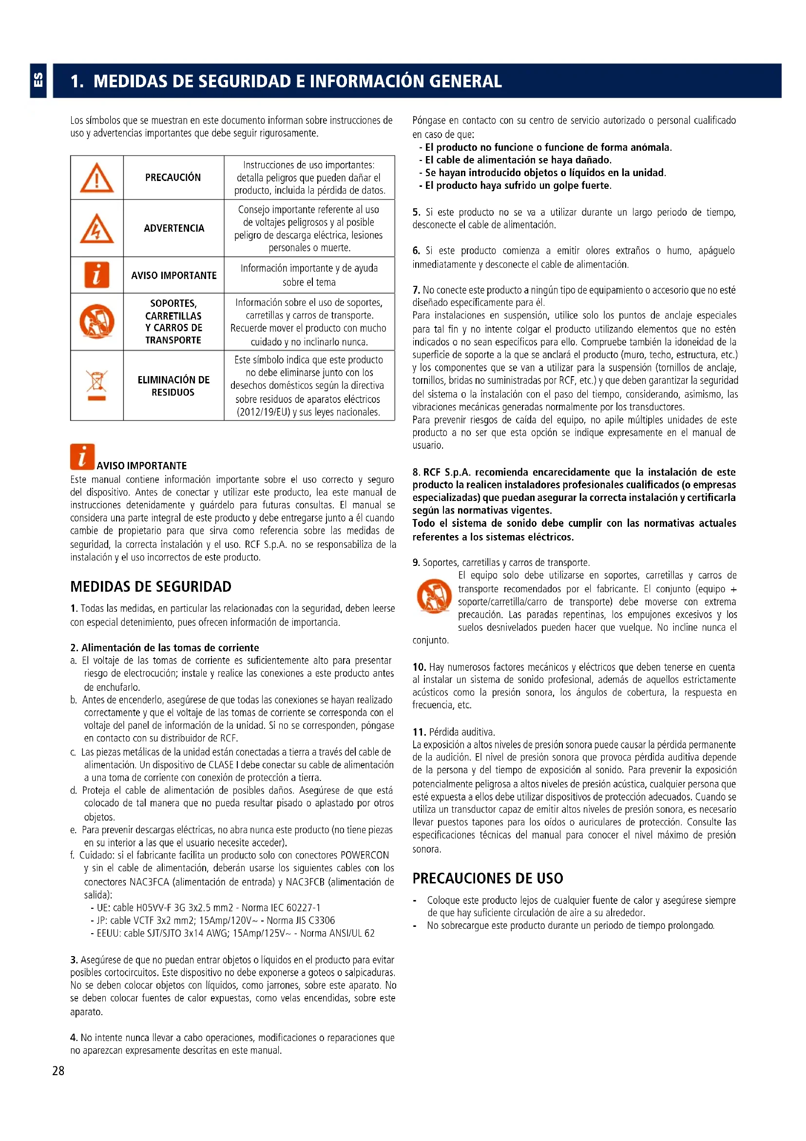 1 Todas las medidas, en particular las relacionadas con la seguridad, deben leerse con especial detenimiento, pues ofrecen información de importancia 2 Alimentación de las tomas de corriente a El voltaje de las tomas de corriente es suficientemente alto para presentar riesgo de electrocución; instale y realice las conexiones a este producto antes de enchufarlo b Antes de encenderlo, asegúrese de que todas las conexiones se hayan realizado correctamente y que el voltaje de las tomas de corriente se corresponda con el voltaje del panel de información de la unidad Si no se corresponden, póngase en contacto con su distribuidor de RCF c Las piezas metálicas de la unidad están conectadas a tierra a través del cable de alimentación Un dispositivo de CLASE I debe conectar su cable de alimentación a una toma de corriente con conexión de protección a tierra d Proteja el cable de alimentación de posibles daños Asegúrese de que está colocado de tal manera que no pueda resultar pisado o aplastado por otros objetos e Para prevenir descargas eléctricas, no abra nunca este producto (no tiene piezas en su interior a las que el usuario necesite acceder) f Cuidado: si el fabricante facilita un producto solo con conectores POWERCON y sin el cable de alimentación, deberán usarse los siguientes cables con los conectores NAC3FCA (alimentación de entrada) y NAC3FCB (alimentación de salida): - UE: cable H05VV-F 3G 3x25 mm2 - Norma IEC 60227-1 - JP: cable VCTF 3x2 mm2; 15Amp/120V~ - Norma JIS C3306 - EEUU: cable SJT/SJTO 3x14 AWG; 15Amp/125V~ - Norma ANSI/UL 62 3 Asegúrese de que no puedan entrar objetos o líquidos en el producto para evitar posibles cortocircuitos Este dispositivo no debe exponerse a goteos o salpicaduras No se deben colocar objetos con líquidos, como jarrones, sobre este aparato No se deben colocar fuentes de calor expuestas, como velas encendidas, sobre este aparato 4 No intente nunca llevar a cabo operaciones, modificaciones o reparaciones que no aparezcan expresamente descritas en este manual Póngase en contacto con su centro de servicio autorizado o personal cualificado en caso de que: - El producto no funcione o funcione de forma anómala - El cable de alimentación se haya dañado - Se hayan introducido objetos o líquidos en la unidad - El producto haya sufrido un golpe fuerte 5 Si este producto no se va a utilizar durante un largo periodo de tiempo, desconecte el cable de alimentación 6 Si este producto comienza a emitir olores extraños o humo, apáguelo inmediatamente y desconecte el cable de alimentación 7 No conecte este producto a ningún tipo de equipamiento o accesorio que no esté diseñado específicamente para él Para instalaciones en suspensión, utilice solo los puntos de anclaje especiales para tal fin y no intente colgar el producto utilizando elementos que no estén indicados o no sean específicos para ello Compruebe también la idoneidad de la superficie de soporte a la que se anclará el producto (muro, techo, estructura, etc) y los componentes que se van a utilizar para la suspensión (tornillos de anclaje, tornillos, bridas no suministradas por RCF, etc) y que deben garantizar la seguridad del sistema o la instalación con el paso del tiempo, considerando, asimismo, las vibraciones mecánicas generadas normalmente por los transductores Para prevenir riesgos de caída del equipo, no apile múltiples unidades de este producto a no ser que esta opción se indique expresamente en el manual de usuario 8 RCF SpA recomienda encarecidamente que la instalación de este producto la realicen instaladores profesionales cualificados (o empresas especializadas) que puedan asegurar la correcta instalación y certificarla según las normativas vigentes Todo el sistema de sonido debe cumplir con las normativas actuales referentes a los sistemas eléctricos 9 Soportes, carretillas y carros de transporte El equipo solo debe utilizarse en soportes, carretillas y carros de transporte recomendados por el fabricante El conjunto (equipo + soporte/carretilla/carro de transporte) debe moverse con extrema precaución Las paradas repentinas, los empujones excesivos y los suelos desnivelados pueden hacer que vuelque No incline nunca el conjunto 10 Hay numerosos factores mecánicos y eléctricos que deben tenerse en cuenta al instalar un sistema de sonido profesional, además de aquellos estrictamente acústicos como la presión sonora, los ángulos de cobertura, la respuesta en frecuencia, etc 11 Pérdida auditiva La exposición a altos niveles de presión sonora puede causar la pérdida permanente de la audición El nivel de presión sonora que provoca pérdida auditiva depende de la persona y del tiempo de exposición al sonido Para prevenir la exposición potencialmente peligrosa a altos niveles de presión acústica, cualquier persona que esté expuesta a ellos debe utilizar dispositivos de protección adecuados Cuando se utiliza un transductor capaz de emitir altos niveles de presión sonora, es necesario llevar puestos tapones para los oídos o auriculares de protección Consulte las especificaciones técnicas del manual para conocer el nivel máximo de presión sonora