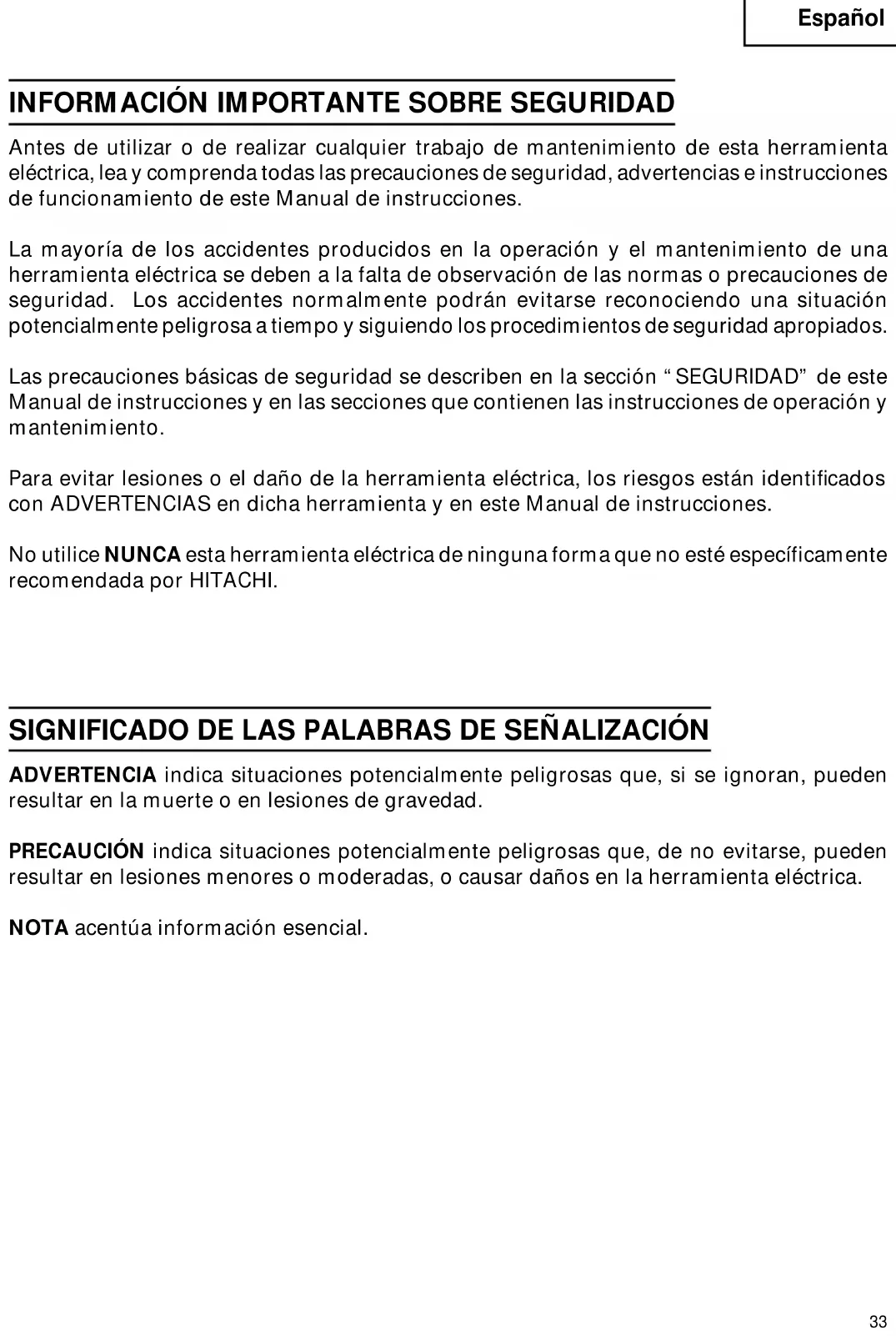 Antes de utilizar o de realizar cualquier trabajo de mantenimiento de esta herramienta eléctrica, lea y comprenda todas las precauciones de seguridad, advertencias e instrucciones de funcionamiento de este Manual de instrucciones. La mayoría de los accidentes producidos en la operación y el mantenimiento de una herramienta eléctrica se deben a la falta de observación de las normas o precauciones de seguridad. Los accidentes normalmente podrán evitarse reconociendo una situación potencialmente peligrosa a tiempo y siguiendo los procedimientos de seguridad apropiados. Las precauciones básicas de seguridad se describen en la sección “SEGURIDAD” de este Manual de instrucciones y en las secciones que contienen las instrucciones de operación y mantenimiento. Para evitar lesiones o el daño de la herramienta eléctrica, los riesgos están identificados con ADVERTENCIAS en dicha herramienta y en este Manual de instrucciones. No utilice NUNCA esta herramienta eléctrica de ninguna forma que no esté específicamente recomendada por HITACHI. SIGNIFICADO DE LAS PALABRAS DE SEÑALIZACIÓN ADVERTENCIA indica situaciones potencialmente peligrosas que, si se ignoran, pueden resultar en la muerte o en lesiones de gravedad. PRECAUCIÓN indica situaciones potencialmente peligrosas que, de no evitarse, pueden resultar en lesiones menores o moderadas, o causar daños en la herramienta eléctrica. NOTA acentúa información esencial.Español
