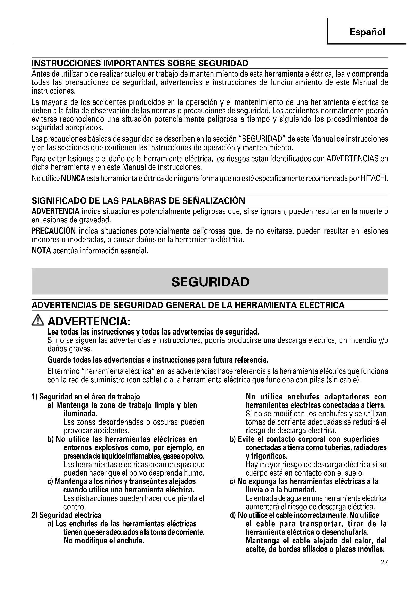 Antes de utilizar o de realizar cualquier trabajo de mantenimiento de esta herramienta eléctrica, lea y comprenda todas las precauciones de seguridad, advertencias e instrucciones de funcionamiento de este Manual de instrucciones. La mayoría de los accidentes producidos en la operación y el mantenimiento de una herramienta eléctrica se deben a la falta de observación de las normas o precauciones de seguridad. Los accidentes normalmente podrán evitarse reconociendo una situación potencialmente peligrosa a tiempo y siguiendo los procedimientos de seguridad apropiados. Las precauciones básicas de seguridad se describen en la sección “SEGURIDAD” de este Manual de instrucciones y en las secciones que contienen las instrucciones de operación y mantenimiento. Para evitar lesiones o el daño de la herramienta eléctrica, los riesgos están identificados con ADVERTENCIAS en dicha herramienta y en este Manual de instrucciones. No utilice NUNCA esta herramienta eléctrica de ninguna forma que no esté específicamente recomendada por HITACHI. SIGNIFICADO DE LAS PALABRAS DE SEÑALIZACIÓN ADVERTENCIA indica situaciones potencialmente peligrosas que, si se ignoran, pueden resultar en la muerte o en lesiones de gravedad. PRECAUCIÓN indica situaciones potencialmente peligrosas que, de no evitarse, pueden resultar en lesiones menores o moderadas, o causar daños en la herramienta eléctrica. NOTA acentúa información esencial. SEGURIDAD ADVERTENCIAS DE SEGURIDAD GENERAL DE LA HERRAMIENTA ELÉCTRICA ADVERTENCIA: Lea todas las instrucciones y todas las advertencias de seguridad. Si no se siguen las advertencias e instrucciones, podría producirse una descarga eléctrica, un incendio y/o daños graves. Guarde todas las advertencias e instrucciones para futura referencia. El término “herramienta eléctrica” en las advertencias hace referencia a la herramienta eléctrica que funciona con la red de suministro (con cable) o a la herramienta eléctrica que funciona con pilas (sin cable).