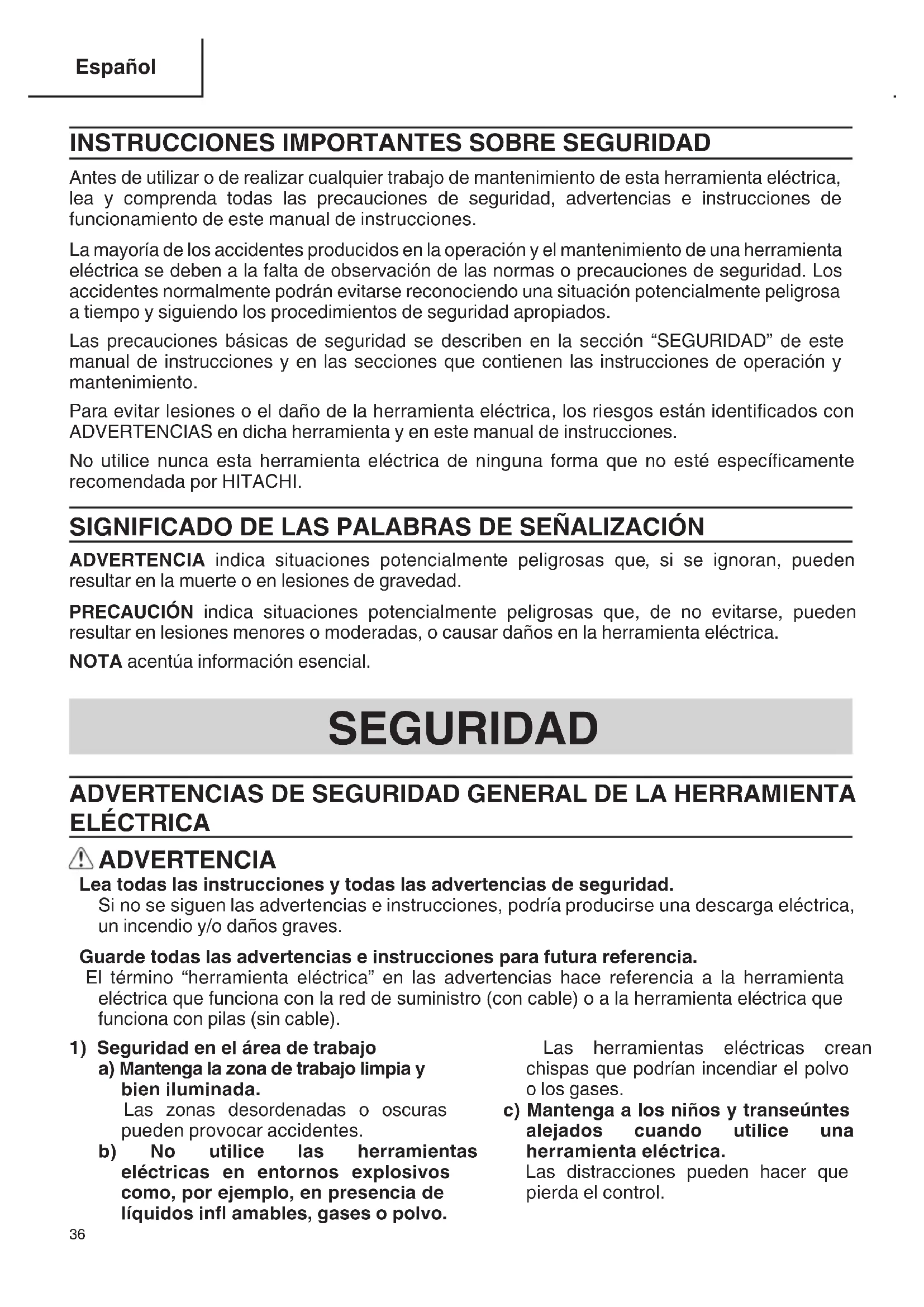 Antes de utilizar o de realizar cualquier trabajo de mantenimiento de esta herramienta eléctrica, lea y comprenda todas las precauciones de seguridad, advertencias e instrucciones de funcionamiento de este manual de instrucciones. La mayoría de los accidentes producidos en la operación y el mantenimiento de una herramienta eléctrica se deben a la falta de observación de las normas o precauciones de seguridad. Los accidentes normalmente podrán evitarse reconociendo una situación potencialmente peligrosa a tiempo y siguiendo los procedimientos de seguridad apropiados. Las precauciones básicas de seguridad se describen en la sección “SEGURIDAD” de este manual de instrucciones y en las secciones que contienen las instrucciones de operación y mantenimiento. Para evitar lesiones o el daño de la herramienta eléctrica, los riesgos están identifi cados con ADVERTENCIAS en dicha herramienta y en este manual de instrucciones. No utilice nunca esta herramienta eléctrica de ninguna forma que no esté específi camente recomendada por HITACHI. SIGNIFICADO DE LAS PALABRAS DE SEÑALIZACIÓN ADVERTENCIA indica situaciones potencialmente peligrosas que, si se ignoran, pueden resultar en la muerte o en lesiones de gravedad. PRECAUCIÓN indica situaciones potencialmente peligrosas que, de no evitarse, pueden resultar en lesiones menores o moderadas, o causar daños en la herramienta eléctrica. NOTA acentúa información esencial. SEGURIDAD ADVERTENCIAS DE SEGURIDAD GENERAL DE LA HERRAMIENTA ELÉCTRICA ADVERTENCIA Lea todas las instrucciones y todas las advertencias de seguridad. Si no se siguen las advertencias e instrucciones, podría producirse una descarga eléctrica, un incendio y/o daños graves. Guarde todas las advertencias e instrucciones para futura referencia. El término “herramienta eléctrica” en las advertencias hace referencia a la herramienta eléctrica que funciona con la red de suministro (con cable) o a la herramienta eléctrica que funciona con pilas (sin cable).