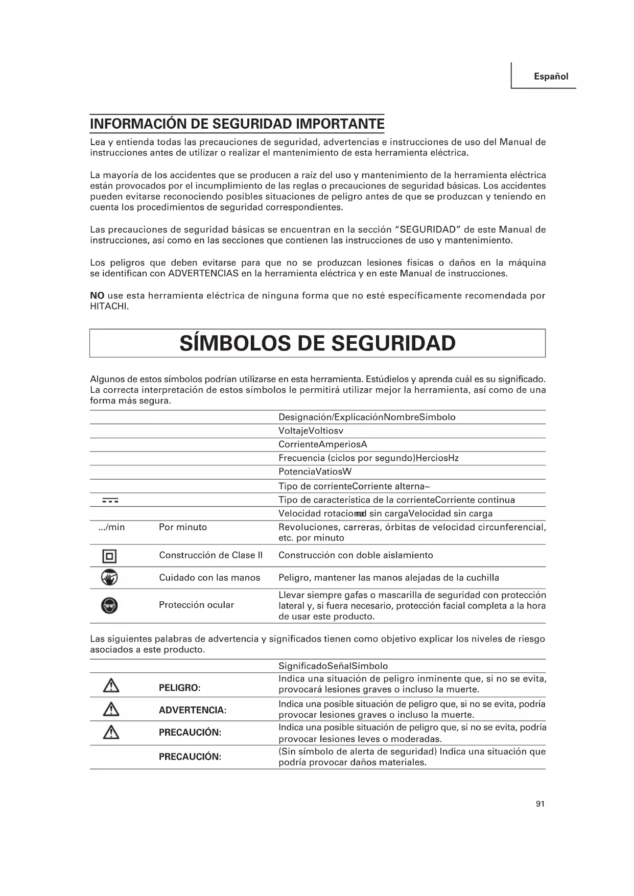 position Arrêt et retirer toujours la fiche de la source d’alimentation avant d’effectuer des réglages. Communiquer avec le centre de service Hitachi autorisé si, pour une raison quelconque, le moteur ne tourne pas. GUIDE DE DÉPANNAGELas siguientes palabras de advertencia y significados tienen como objetivo explicar los niveles de riesgo asociados a este producto. Lea y entienda todas las precauciones de seguridad, advertencias e instrucciones de uso del Manual de instrucciones antes de utilizar o realizar el mantenimiento de esta herramienta eléctrica. La mayoría de los accidentes que se producen a raíz del uso y mantenimiento de la herramienta eléctrica están provocados por el incumplimiento de las reglas o precauciones de seguridad básicas. Los accidentes pueden evitarse reconociendo posibles situaciones de peligro antes de que se produzcan y teniendo en cuenta los procedimientos de seguridad correspondientes. Las precauciones de seguridad básicas se encuentran en la sección “SEGURIDAD” de este Manual de instrucciones, así como en las secciones que contienen las instrucciones de uso y mantenimiento. Los peligros que deben evitarse para que no se produzcan lesiones físicas o daños en la máquina se identifican con ADVERTENCIAS en la herramienta eléctrica y en este Manual de instrucciones. NO use esta herramienta eléctrica de ninguna forma que no esté específicamente recomendada por HITACHI.