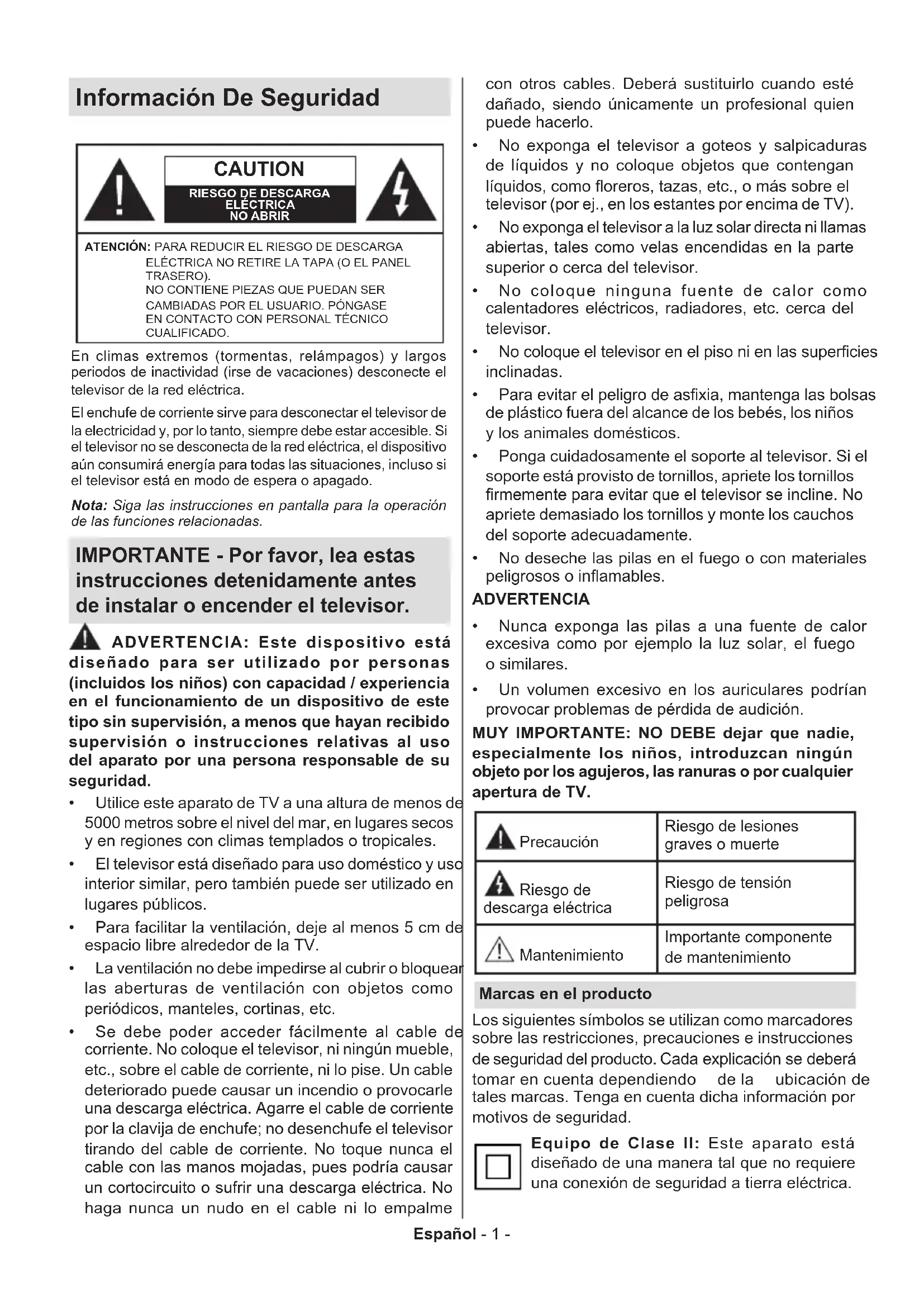 ADVERTENCIA Nunca exponga las pilas a una fuente de calor excesiva como por ejemplo la luz solar, el fuego o similares. Un volumen excesivo en los auriculares podrían provocar problemas de pérdida de audición. MUY IMPORTANTE: NO DEBE dejar que nadie, especialmente los niños, introduzcan ningún objeto por los agujeros, las ranuras o por cualquier apertura de TV. Precaución Riesgo de lesiones graves o muerte Riesgo de descarga eléctrica Riesgo de tensión peligrosa Mantenimiento Importante componente de mantenimiento Marcas en el producto Los siguientes símbolos se utilizan como marcadores sobre las restricciones, precauciones e instrucciones de seguridad del producto.