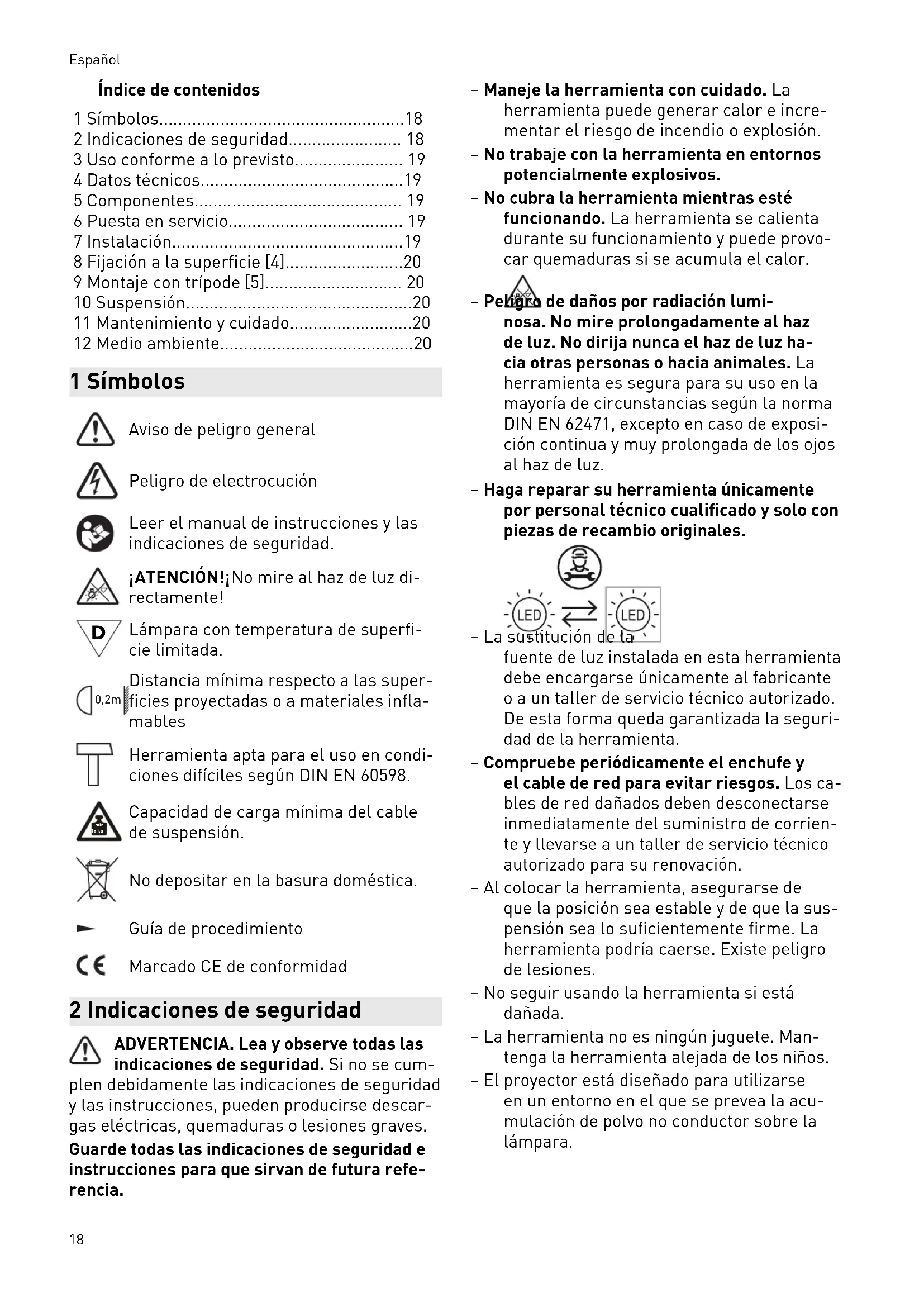 Lámpara con temperatura de superfi cie limitada. 0,2m Distancia mínima respecto a las super ficies proyectadas o a materiales infla mables Herramienta apta para el uso en condi ciones difíciles según DIN EN 60598. min. 15 kg Capacidad de carga mínima del cable de suspensión. No depositar en la basura doméstica. Guía de procedimiento Marcado CE de conformidad 2 Indicaciones de seguridad ADVERTENCIA. Lea y observe todas las indicaciones de seguridad. Si no se cum plen debidamente las indicaciones de seguridad y las instrucciones, pueden producirse descar gas eléctricas, quemaduras o lesiones graves. Guarde todas las indicaciones de seguridad e instrucciones para que sirvan de futura refe rencia. – Maneje la herramienta con cuidado. La herramienta puede generar calor e incre mentar el riesgo de incendio o explosión. – No trabaje con la herramienta en entornos potencialmente explosivos. – No cubra la herramienta mientras esté funcionando. La herramienta se calienta durante su funcionamiento y puede provo car quemaduras si se acumula el calor. – Peligro de daños por radiación lumi nosa. No mire prolongadamente al haz de luz. No dirija nunca el haz de luz ha cia otras personas o hacia animales. La herramienta es segura para su uso en la mayoría de circunstancias según la norma DINEN62471, excepto en caso de exposi ción continua y muy prolongada de los ojos al haz de luz. – Haga reparar su herramienta únicamente por personal técnico cualificado y solo con piezas de recambio originales. – La sustitución de la fuente de luz instalada en esta herramienta debe encargarse únicamente al fabricante o a un taller de servicio técnico autorizado. De esta forma queda garantizada la seguri dad de la herramienta. – Compruebe periódicamente el enchufe y el cable de red para evitar riesgos. Los ca bles de red dañados deben desconectarse inmediatamente del suministro de corrien te y llevarse a un taller de servicio técnico autorizado para su renovación. – Al colocar la herramienta, asegurarse de que la posición sea estable y de que la sus pensión sea lo suficientemente firme. La herramienta podría caerse. Existe peligro de lesiones. – No seguir usando la herramienta si está dañada. – La herramienta no es ningún juguete. Man tenga la herramienta alejada de los niños. – El proyector está diseñado para utilizarse en un entorno en el que se prevea la acu mulación de polvo no conductor sobre la lámpara. Español 183 Uso conforme a lo previsto El proyector es apto para iluminar grandes su perficies en zonas de obras, espacios de traba jo, garajes, etc. Debe prestarse atención a la seguridad eléctrica de los puntos de conexión de corriente. La herramienta no es apta para la iluminación de estancias en el hogar. El usuario será responsable de cualquier utilización indebida. AVISO En algunos países existen normas adicionales para el uso de herramientas eléctricas en obras. Estas normativas naciona les pueden restringir el uso del proyector o exigir requisitos adicionales. Cumpla todas las normas nacionales que le afecten. 4 Datos técnicos Proyector SYSLITE DUO Tensión nominal 220-240V Frecuencia 50/60Hz Medio luminoso 80 LED Power de 1,4W Potencia máxima 112 W Corriente débil LED 8.000lm Temperatura de color 5.000K Reproducción de los colo res RA > 80 Vida útil (L70) >10.000 h Peso 3,4 kg Tipo de protección IP 55 Este equipo contiene una fuente luminosa de eficiencia energética de claseE. 5 Componentes [1-1] Pie de apoyo extraíble, enrollacables [1-2] Superficie de iluminación [1-3] Empuñadura [1-4] Gancho para colgar, sujetacables [1-5] Cable de conexión a la red Las figuras indicadas se encuentran al principio del manual de instrucciones. 6 Puesta en servicio