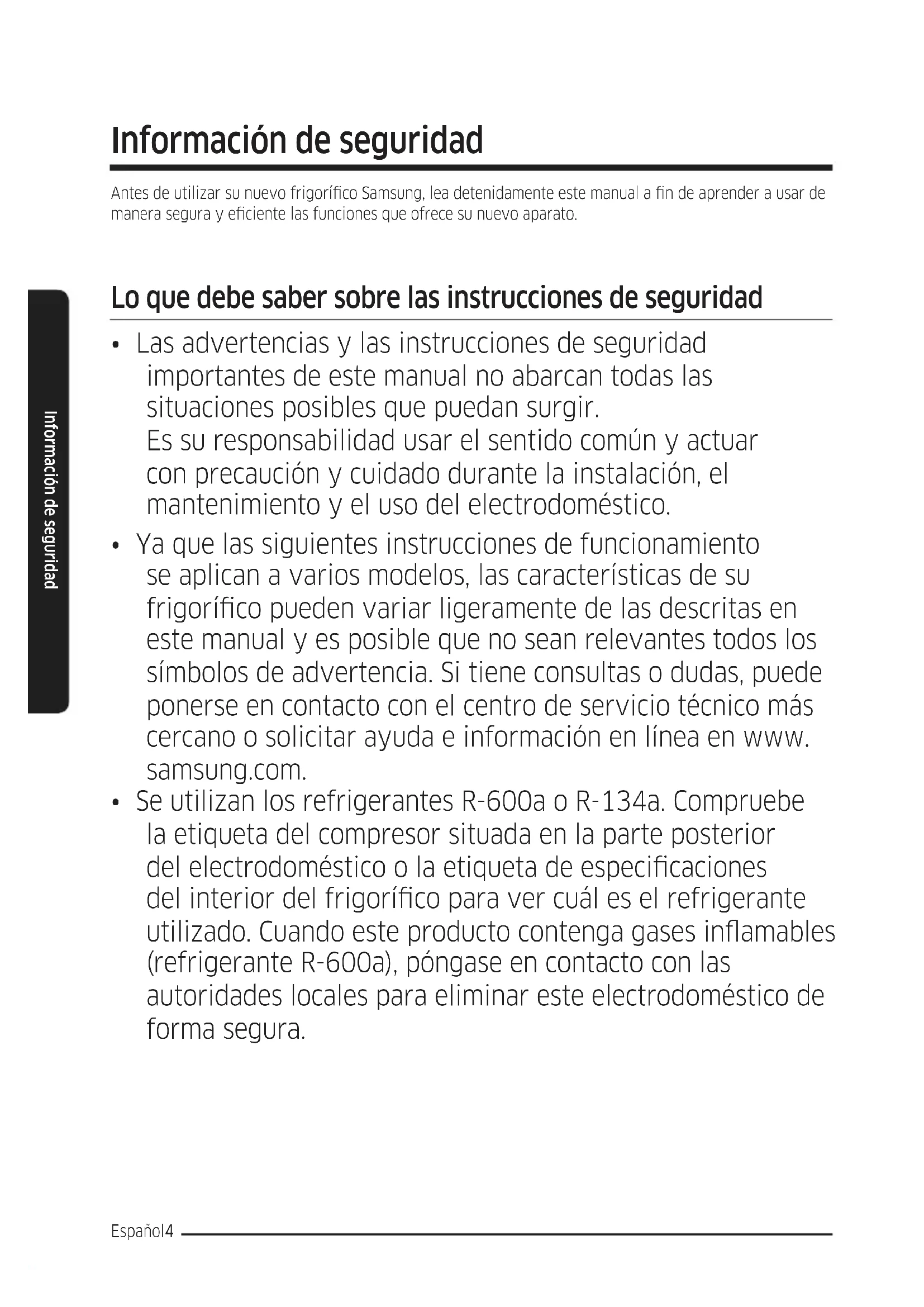 Chamada para a rede xa nacional Dias úteis das 9h às 20h www.samsung.com/pt/support SPAIN 91 175 00 15 www.samsung.com/es/support DA68-04756A-00Frigoríco Manual del usuario Electrodoméstico independienteEspañol2 Índice Índice Información de seguridad 4 Lo que debe saber sobre las instrucciones de seguridad 4 Símbolos y precauciones de seguridad importantes: 7 Precauciones de seguridad importantes 8 Señales de advertencia importantes sobre el transporte y la ubicación 12 Advertencias de instalación muy importantes 13 Precauciones de instalación 17 Advertencias de uso muy importantes 17 Precauciones de uso 23 Precauciones de limpieza 26 Advertencias de eliminación muy importantes 28 Consejos adicionales para un uso correcto 29 Instrucciones sobre los RAEE 31 Instalación 32 Descripción general del frigoríco 32 Instalación paso a paso 34 Funcionamiento 48 Panel principal 48 Ajuste de la temperatura o función 50 Cambio de la escala de temperatura 51 Activar o desactivar la máquina de hielo (solo modelos aplicables) 51 Activa o desactiva la wi 52 SmartThings 53 Características especiales 56 Mantenimiento 59 Manipulación y cuidado 59 Limpieza 63 Recambio 64 Solución de problemas 65 General 65 ¿Se oyen ruidos anómalos procedentes del frigoríco? 68 SmartThings 70 Apéndice 71 Instrucciones de seguridad 71 Instrucciones de instalación 71 Instrucciones sobre la temperatura 72 Información para el modelo y el pedido de piezas de repuesto 75Español 3 Índice Open Source Announcement 76Español4 Información de seguridad Antes de utilizar su nuevo frigoríco Samsung, lea detenidamente este manual a n de aprender a usar de manera segura y eciente las funciones que ofrece su nuevo aparato. Lo que debe saber sobre las instrucciones de seguridad