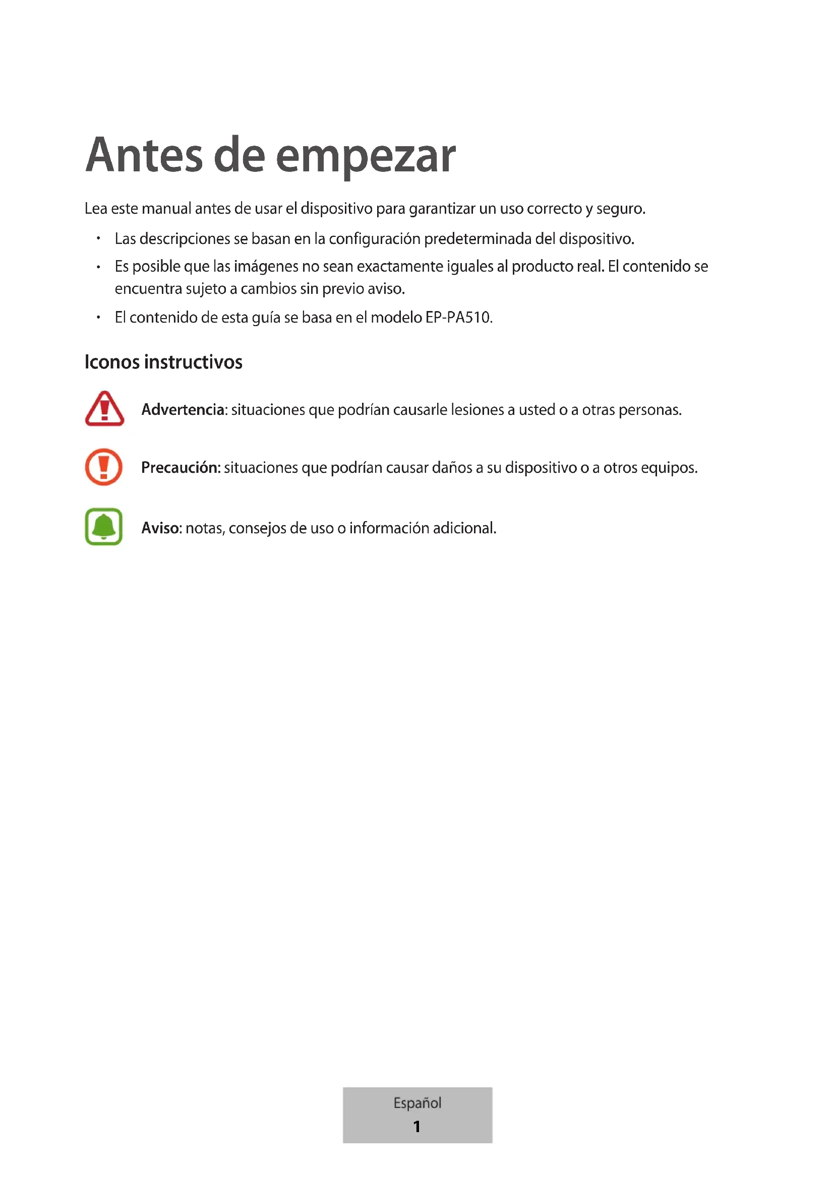 El contenido de esta guía se basa en el modelo EP-PA510. Iconos instructivos Advertencia: situaciones que podrían causarle lesiones a usted o a otras personas. Precaución: situaciones que podrían causar daños a su dispositivo o a otros equipos. Aviso: notas, consejos de uso o información adicional. Español