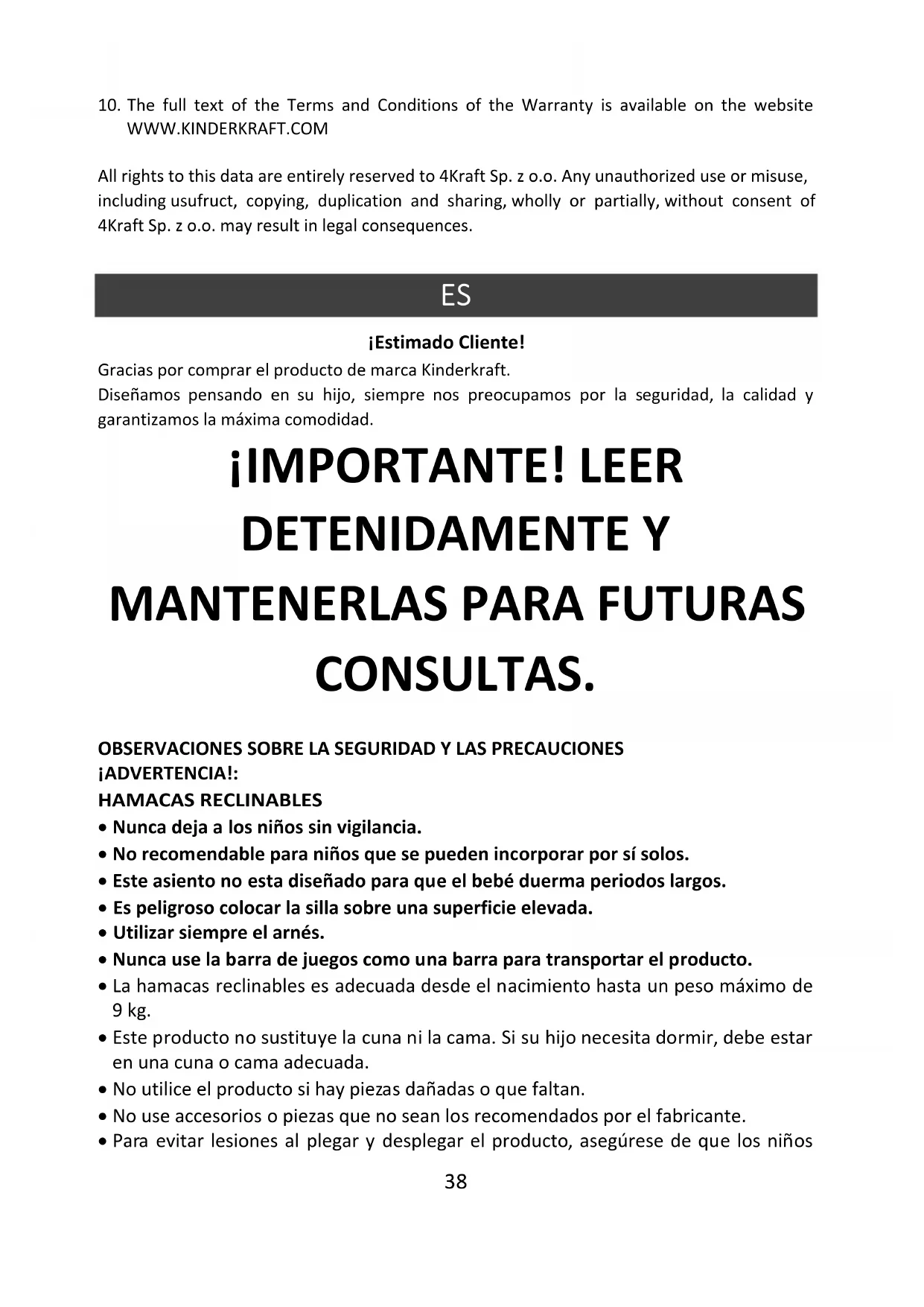 ¡Estimado Cliente! Gracias por comprar el producto de marca Kinderkraft. Diseñamosي pensandoي enي suي hijo,ي siempreي nosي preocupamosي por la seguridad, la calidad y garantizamosيlaيmáximaيcomodidad.ي ¡IMPORTANTE! LEER DETENIDAMENTE Y