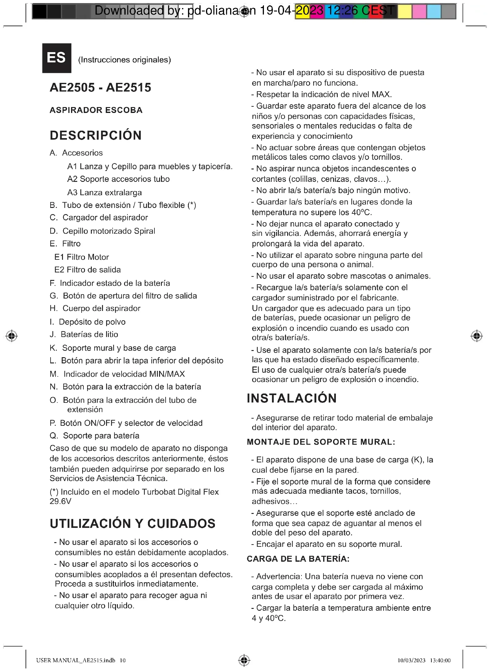 - No usar el aparato si los accesorios o consumibles no están debidamente acoplados. - No usar el aparato si los accesorios o consumibles acoplados a él presentan defectos. Proceda a sustituirlos inmediatamente. - No usar el aparato para recoger agua ni cualquier otro líquido. - No usar el aparato si su dispositivo de puesta en marcha/paro no funciona. - Respetar la indicación de nivel MAX. - Guardar este aparato fuera del alcance de los niños y/o personas con capacidades físicas, sensoriales o mentales reducidas o falta de experiencia y conocimiento - No actuar sobre áreas que contengan objetos metálicos tales como clavos y/o tornillos. - No aspirar nunca objetos incandescentes o cortantes (colillas, cenizas, clavos…). - No abrir la/s batería/s bajo ningún motivo. - Guardar la/s batería/s en lugares donde la temperatura no supere los 40ºC. - No dejar nunca el aparato conectado y sin vigilancia. Además, ahorrará energía y prolongará la vida del aparato. - No utilizar el aparato sobre ninguna parte del cuerpo de una persona o animal. - No usar el aparato sobre mascotas o animales. - Recargue la/s batería/s solamente con el cargador suministrado por el fabricante. Un cargador que es adecuado para un tipo de baterías, puede ocasionar un peligro de explosión o incendio cuando es usado con otra/s batería/s. - Use el aparato solamente con la/s batería/s por las que ha estado diseñado especícamente. El uso de cualquier otra/s batería/s puede ocasionar un peligro de explosión o incendio. INSTALACIÓN - Asegurarse de retirar todo material de embalaje del interior del aparato. MONTAJE DEL SOPORTE MURAL: - El aparato dispone de una base de carga (K), la cual debe jarse en la pared. - Fije el soporte mural de la forma que considere más adecuada mediante tacos, tornillos, adhesivos… - Asegurarse que el soporte esté anclado de forma que sea capaz de aguantar al menos el doble del peso del aparato. - Encajar el aparato en su soporte mural. CARGA DE LA BATERÍA: - Advertencia: Una batería nueva no viene con carga completa y debe ser cargada al máximo antes de usar el aparato por primera vez. - Cargar la batería a temperatura ambiente entre 4 y 40ºC. ES (Instrucciones originales) USER MANUAL_AE2515.indb 10USER MANUAL_AE2515.indb 10 10/03/2023 13:40:0010/03/2023 13:40:00 Downloaded by: pd-oliana on 19-04-2023 12:26 CEST- Enchufar el cargador a la red eléctrica y a la parte trasera del producto, encima del mango. - Se iluminará un piloto que indica que el cargador está listo para iniciar la carga de la batería. - El tiempo necesario para una carga completa es de 4 a 5 horas aproximadamente. Nunca intente sobrecargar las baterías (aunque es recomendable que la primera carga se realice durante 6 horas de carga). - Mientras la batería se esté cargando, se iluminará el piloto que indica que el cargador está cargando la batería. - Una vez nalizada la carga, desenchufar el cargador de la red eléctrica. - Nota: No utilizar el aparato mientras esté conectado al cargador.