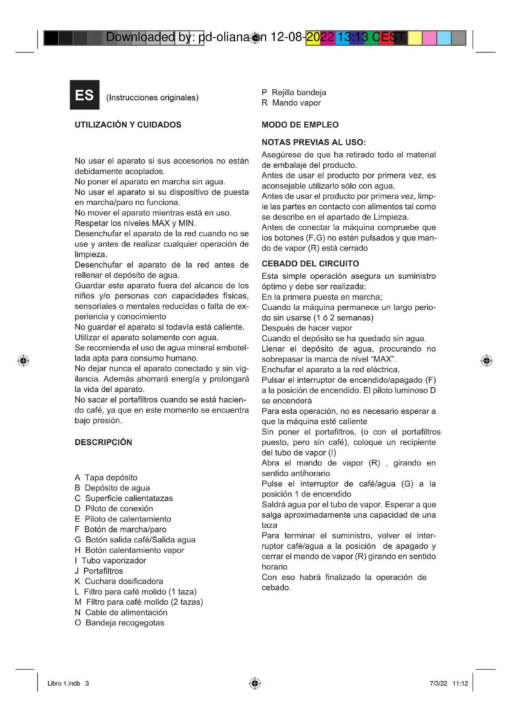 Libro 1.indb 2 Libro 1.indb 2 7/3/22 11:12 7/3/22 11:12 Downloaded by: pd-oliana on 12-08-2022 13:13 CESTUTILIZACIÓN Y CUIDADOS No usar el aparato si sus accesorios no están debidamente acoplados. No poner el aparato en marcha sin agua. No usar el aparato si su dispositivo de puesta en marcha/paro no funciona. No mover el aparato mientras está en uso. Respetar los niveles MAX y MIN. Desenchufar el aparato de la red cuando no se use y antes de realizar cualquier operación de limpieza. Desenchufar el aparato de la red antes de rellenar el depósito de agua. Guardar este aparato fuera del alcance de los niños y/o personas con capacidades físicas, sensoriales o mentales reducidas o falta de ex- periencia y conocimiento No guardar el aparato si todavía está caliente. Utilizar el aparato solamente con agua. Se recomienda el uso de agua mineral embotel- lada apta para consumo humano. No dejar nunca el aparato conectado y sin vig- ilancia. Además ahorrará energía y prolongará la vida del aparato. No sacar el portaltros cuando se está hacien- do café, ya que en este momento se encuentra bajo presión. DESCRIPCIÓN A Tapa depósito B Depósito de agua C Supercie calientatazas D Piloto de conexión E Piloto de calentamiento F Botón de marcha/paro G Botón salida café/Salida agua H Botón calentamiento vapor I Tubo vaporizador J Portaltros K Cuchara dosicadora L Filtro para café molido (1 taza) M Filtro para café molido (2 tazas) N Cable de alimentación O Bandeja recogegotas P Rejilla bandeja R Mando vapor