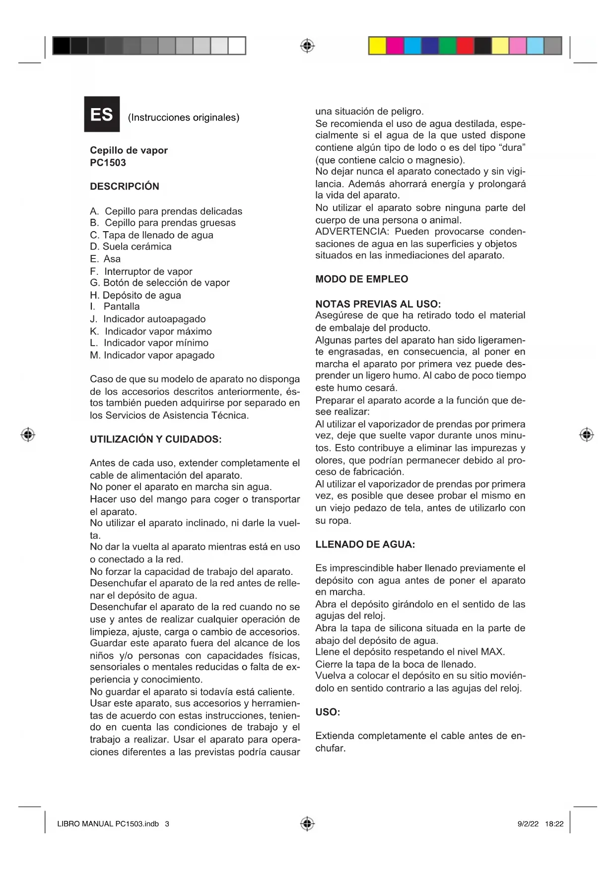 LIBRO MANUAL PC1503.indb 2LIBRO MANUAL PC1503.indb 2 9/2/22 18:229/2/22 18:22Cepillo de vapor PC1503 DESCRIPCIÓN A. Cepillo para prendas delicadas B. Cepillo para prendas gruesas C. Tapa de llenado de agua D. Suela cerámica E. Asa F. Interruptor de vapor G. Botón de selección de vapor H. Depósito de agua