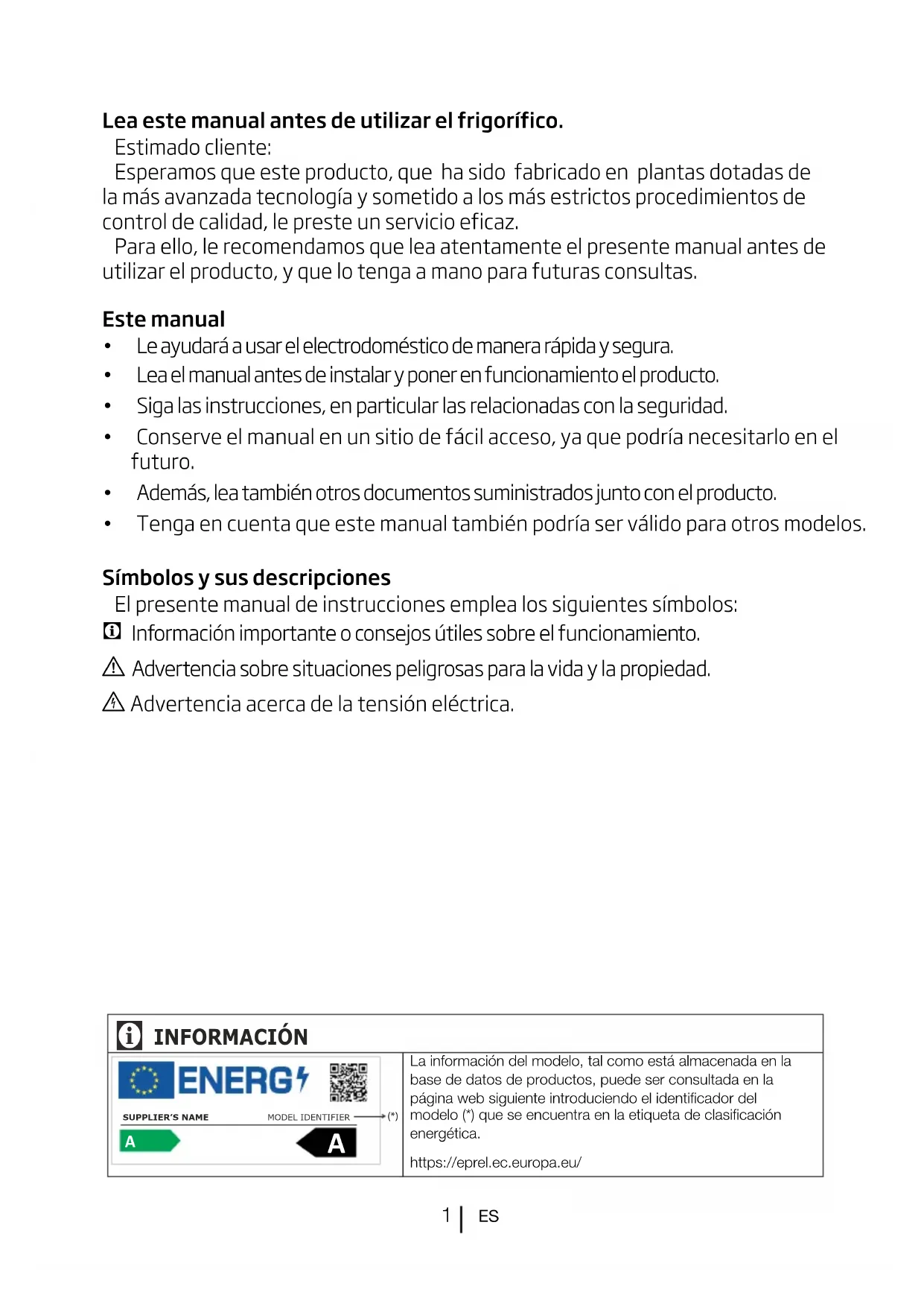 Lea este manual antes de utilizar el frigorífico. Estimado cliente: Esperamos que este producto, que ha sido fabricado en plantas dotadas de la más avanzada tecnología y sometido a los más estrictos procedimientos de control de calidad, le preste un servicio eficaz. Para ello, le recomendamos que lea atentamente el presente manual antes de utilizar el producto, y que lo tenga a mano para futuras consultas. Este manual t Le ayudará a usar el electrodoméstico de manera rápida y segura. t Lea el manual antes de instalar y poner en funcionamiento el producto. t Siga las instrucciones, en particular las relacionadas con la seguridad. t Conserve el manual en un sitio de fácil acceso, ya que podría necesitarlo en el futuro. t Además, lea también otros documentos suministrados junto con el producto. t Tenga en cuenta que este manual también podría ser válido para otros modelos. Símbolos y sus descripciones El presente manual de instrucciones emplea los siguientes símbolos: C Información importante o consejos útiles sobre el funcionamiento. A Advertencia sobre situaciones peligrosas para la vida y la propiedad. B Advertencia acerca de la tensión eléctrica. INFORMACIÓN