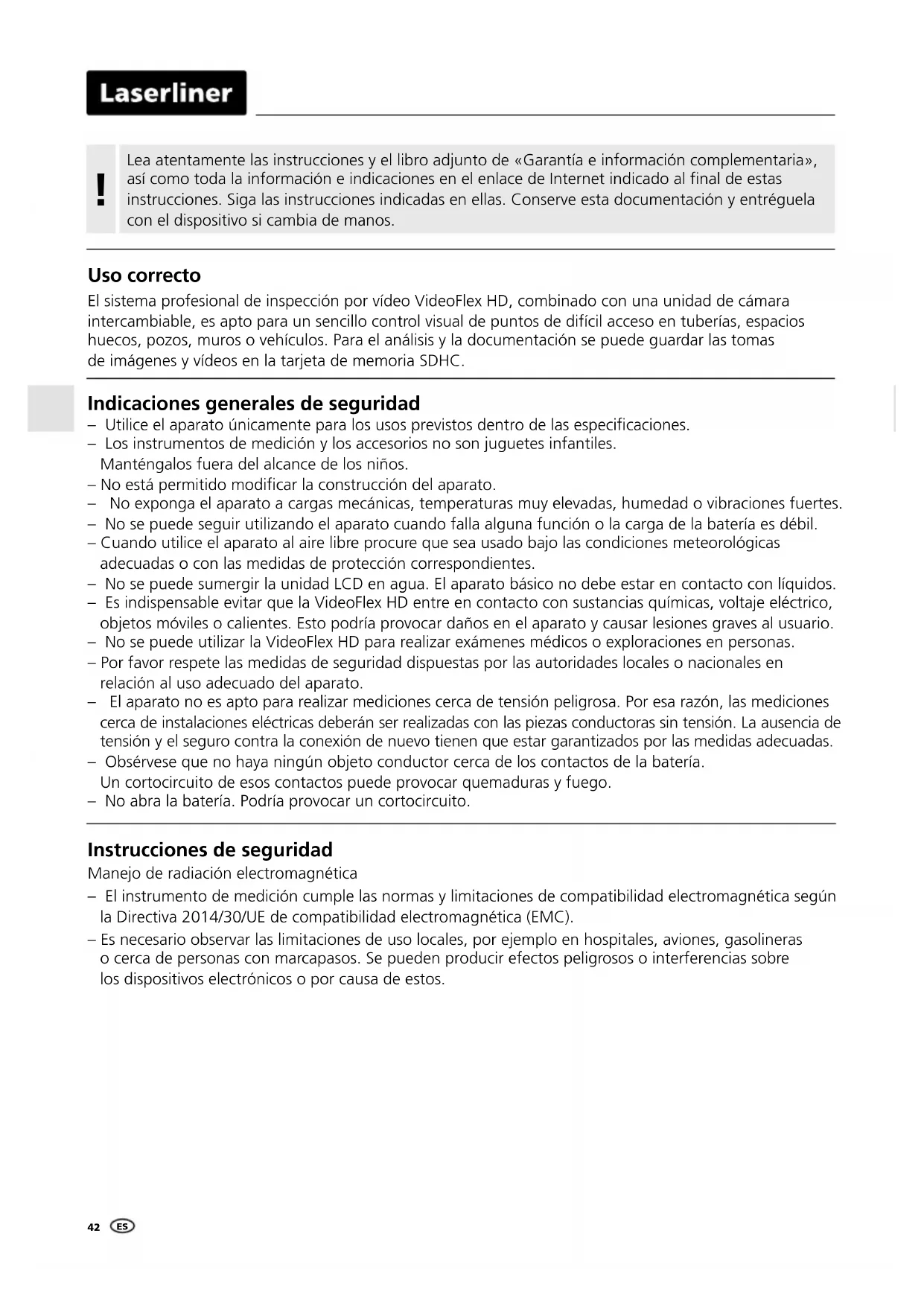 Instrucciones de seguridad Manejo de radiación electromagnética – El instrumento de medición cumple las normas y limitaciones de compatibilidad electromagnética según la Directiva 2014/30/UE de compatibilidad electromagnética (EMC). – Es necesario observar las limitaciones de uso locales, por ejemplo en hospitales, aviones, gasolineras o cerca de personas con marcapasos. Se pueden producir efectos peligrosos o interferencias sobre los dispositivos electrónicos o por causa de estos. Indicaciones generales de seguridad – Utilice el aparato únicamente para los usos previstos dentro de las especicaciones. – Los instrumentos de medición y los accesorios no son juguetes infantiles. Manténgalos fuera del alcance de los niños. – No está permitido modicar la construcción del aparato. – No exponga el aparato a cargas mecánicas, temperaturas muy elevadas, humedad o vibraciones fuertes. – No se puede seguir utilizando el aparato cuando falla alguna función o la carga de la batería es débil. – Cuando utilice el aparato al aire libre procure que sea usado bajo las condiciones meteorológicas adecuadas o con las medidas de protección correspondientes. – No se puede sumergir la unidad LCD en agua. El aparato básico no debe estar en contacto con líquidos. – Es indispensable evitar que la VideoFlex HD entre en contacto con sustancias químicas, voltaje eléctrico, objetos móviles o calientes. Esto podría provocar daños en el aparato y causar lesiones graves al usuario. – No se puede utilizar la VideoFlex HD para realizar exámenes médicos o exploraciones en personas. – Por favor respete las medidas de seguridad dispuestas por las autoridades locales o nacionales en relación al uso adecuado del aparato. – El aparato no es apto para realizar mediciones cerca de tensión peligrosa. Por esa razón, las mediciones cerca de instalaciones eléctricas deberán ser realizadas con las piezas conductoras sin tensión. La ausencia de tensión y el seguro contra la conexión de nuevo tienen que estar garantizados por las medidas adecuadas. – Obsérvese que no haya ningún objeto conductor cerca de los contactos de la batería. Un cortocircuito de esos contactos puede provocar quemaduras y fuego. – No abra la batería. Podría provocar un cortocircuito. Uso correcto El sistema profesional de inspección por vídeo VideoFlex HD, combinado con una unidad de cámara intercambiable, es apto para un sencillo control visual de puntos de difícil acceso en tuberías, espacios huecos, pozos, muros o vehículos. Para el análisis y la documentación se puede guardar las tomas de imágenes y vídeos en la tarjeta de memoria SDHC.