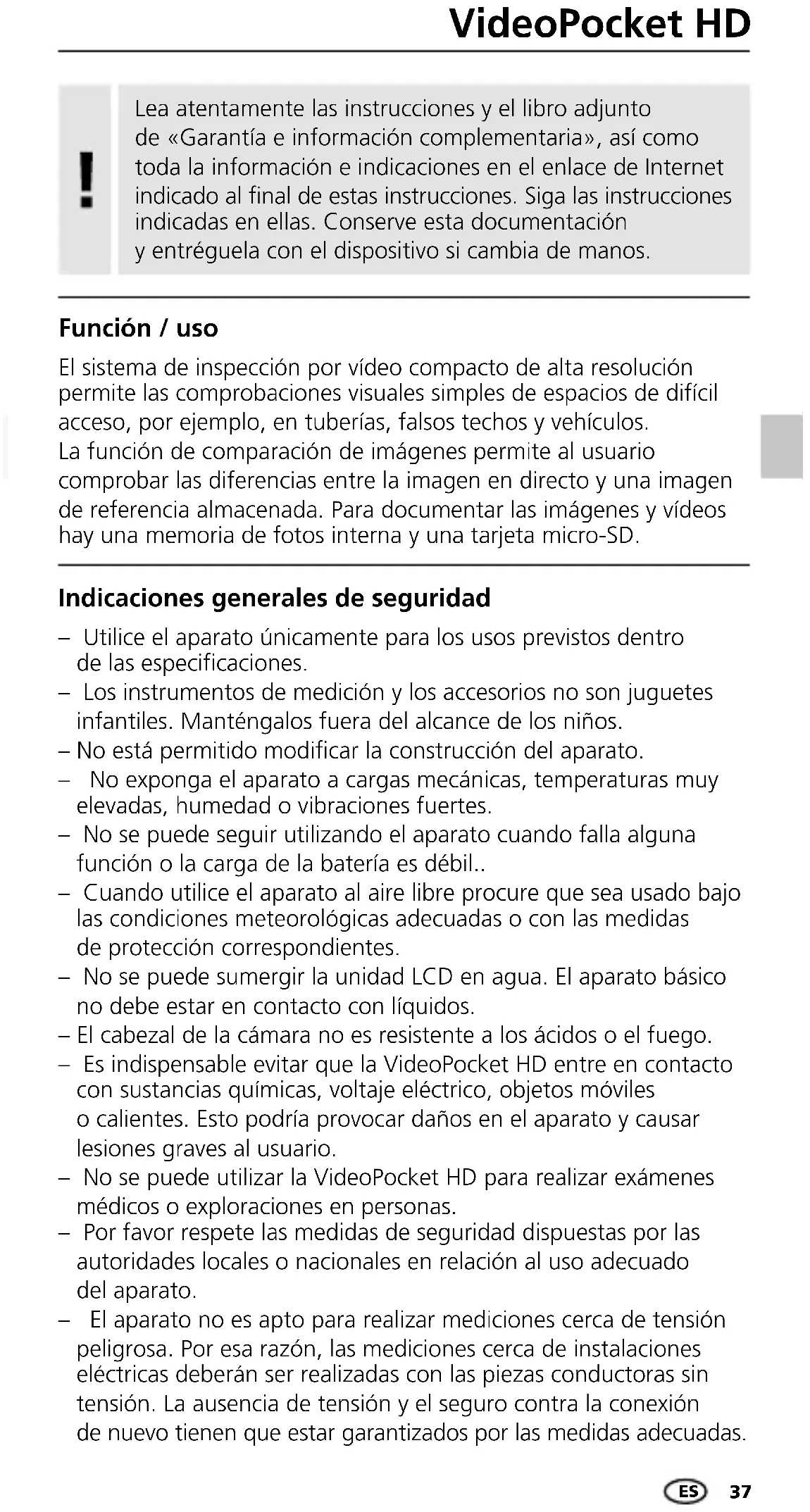 Format de l’image JPEG Format de la vidéo MJPG (AVI) Interface Micro-USB Type de protection de la sonde de la caméra MJPG (AVI) Alimentation électrique 4 x 1,5V LR6 (AA) Conditions de travail -10°C … 50°C, humidité relative de l’air max. 85% RH, non condensante, altitude de travail max. de 2000 m au-dessus du niveau moyen de la mer Conditions de stockage -20°C … 60°C, humidité relative de l’air max. 85% RH, non condensante Dimensions (l x h x p) 85 x 155 x 32 mm Poids 370 g (piles incluse) Réglementation UE et élimination des déchets L‘appareil est conforme à toutes les normes nécessaires pour la libre circulation des marchandises dans l‘Union européenne. Ce produit est un appareil électrique et doit donc faire l‘objet d‘une collecte et d‘une mise au rebut sélectives conformément à la directive européenne sur les anciens appareils électriques et électroniques (directive DEEE). Autres remarques complémentaires et consignes de sécurité sur https://packd.li/ll/ale/in FR37 VideoPocket HD Lea atentamente las instrucciones y el libro adjunto de «Garantía e información complementaria», así como toda la información e indicaciones en el enlace de Internet indicado al nal de estas instrucciones. Siga las instrucciones indicadas en ellas. Conserve esta documentación y entréguela con el dispositivo si cambia de manos. Función / uso El sistema de inspección por vídeo compacto de alta resolución permite las comprobaciones visuales simples de espacios de difícil acceso, por ejemplo, en tuberías, falsos techos y vehículos. La función de comparación de imágenes permite al usuario comprobar las diferencias entre la imagen en directo y una imagen de referencia almacenada. Para documentar las imágenes y vídeos hay una memoria de fotos interna y una tarjeta micro-SD. Indicaciones generales de seguridad – Utilice el aparato únicamente para los usos previstos dentro de las especicaciones. – Los instrumentos de medición y los accesorios no son juguetes infantiles. Manténgalos fuera del alcance de los niños. – No está permitido modicar la construcción del aparato. – No exponga el aparato a cargas mecánicas, temperaturas muy elevadas, humedad o vibraciones fuertes. – No se puede seguir utilizando el aparato cuando falla alguna función o la carga de la batería es débil.. – Cuando utilice el aparato al aire libre procure que sea usado bajo las condiciones meteorológicas adecuadas o con las medidas de protección correspondientes. – No se puede sumergir la unidad LCD en agua. El aparato básico no debe estar en contacto con líquidos. – El cabezal de la cámara no es resistente a los ácidos o el fuego. – Es indispensable evitar que la VideoPocket HD entre en contacto con sustancias químicas, voltaje eléctrico, objetos móviles o calientes. Esto podría provocar daños en el aparato y causar lesiones graves al usuario. – No se puede utilizar la VideoPocket HD para realizar exámenes médicos o exploraciones en personas. – Por favor respete las medidas de seguridad dispuestas por las autoridades locales o nacionales en relación al uso adecuado del aparato. – El aparato no es apto para realizar mediciones cerca de tensión peligrosa. Por esa razón, las mediciones cerca de instalaciones eléctricas deberán ser realizadas con las piezas conductoras sin tensión. La ausencia de tensión y el seguro contra la conexión de nuevo tienen que estar garantizados por las medidas adecuadas. ES38 – El aparato trabaja con LED del grupo de riesgo RG 0 (grupo libre, sin riesgo) según las normas vigentes para la seguridad fotobioló- gica (EN 62471:2008-09ff / IEC/TR 62471:2006-07ff) en sus ediciones actuales. – La radiación perceptible de los LED no es peligrosa para el ojo ni la piel humanos si se utiliza el aparato correctamente y en condiciones razonablemente previsibles. Instrucciones de seguridad Manejo de radiación electromagnética – El instrumento de medición cumple las normas y limitaciones de compatibilidad electromagnética según la Directiva 2014/30/UE de compatibilidad electromagnética (EMC). – Es necesario observar las limitaciones de uso locales, por ejemplo en hospitales, aviones, gasolineras o cerca de personas con mar- capasos. Se pueden producir efectos peligrosos o interferencias sobre los dispositivos electrónicos o por causa de estos. Oricio de salida del LED Instrucciones de seguridad Modo de proceder con radiación óptica articial según el OStrV (reglamento alemán de protección laboral contra la radiación óptica articial)