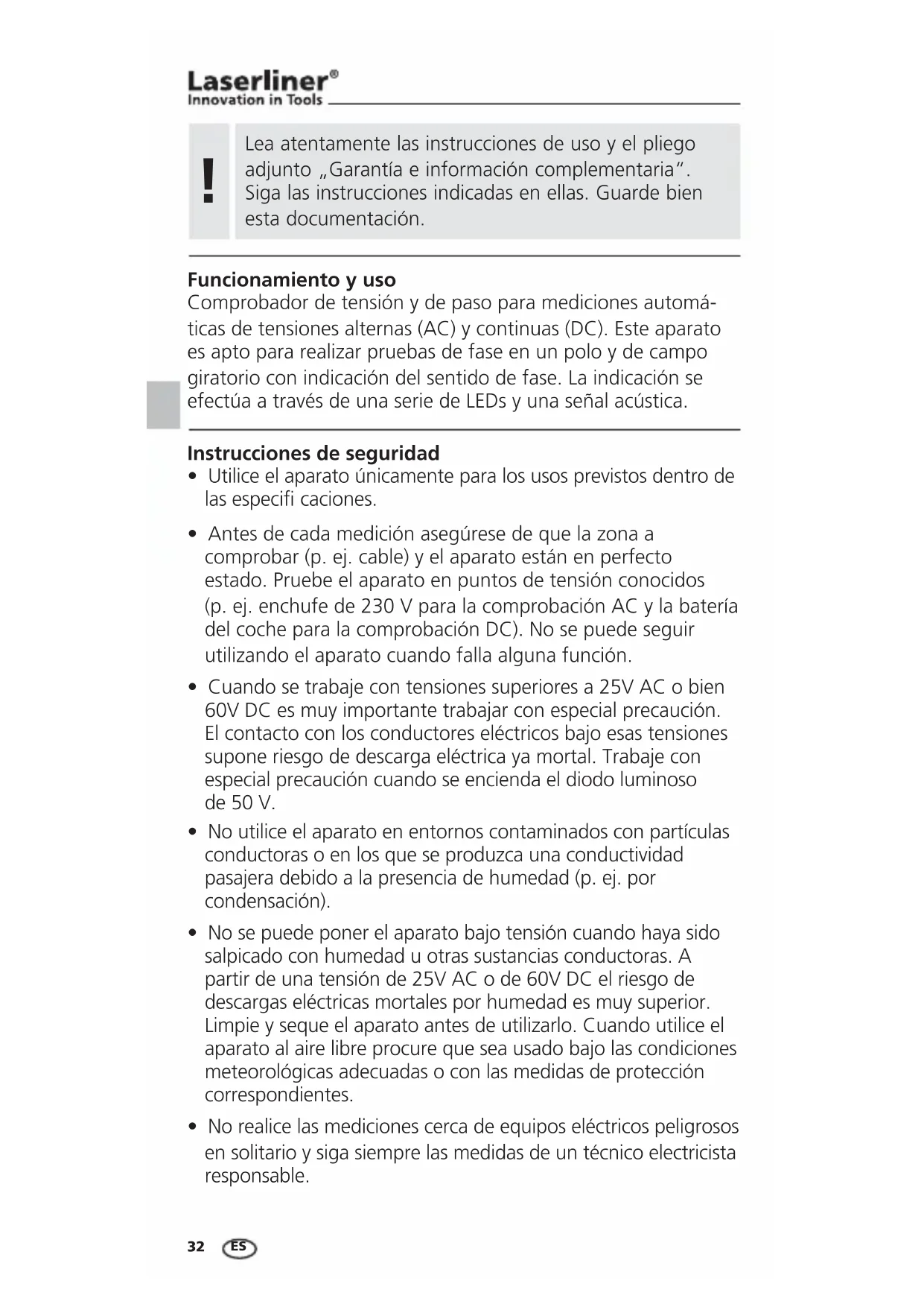Funcionamiento y uso Comprobador de tensión y de paso para mediciones automá- ticas de tensiones alternas (AC) y continuas (DC). Este aparato es apto para realizar pruebas de fase en un polo y de campo giratorio con indicación del sentido de fase. La indicación se efectúa a través de una serie de LEDs y una señal acústica. Instrucciones de seguridad