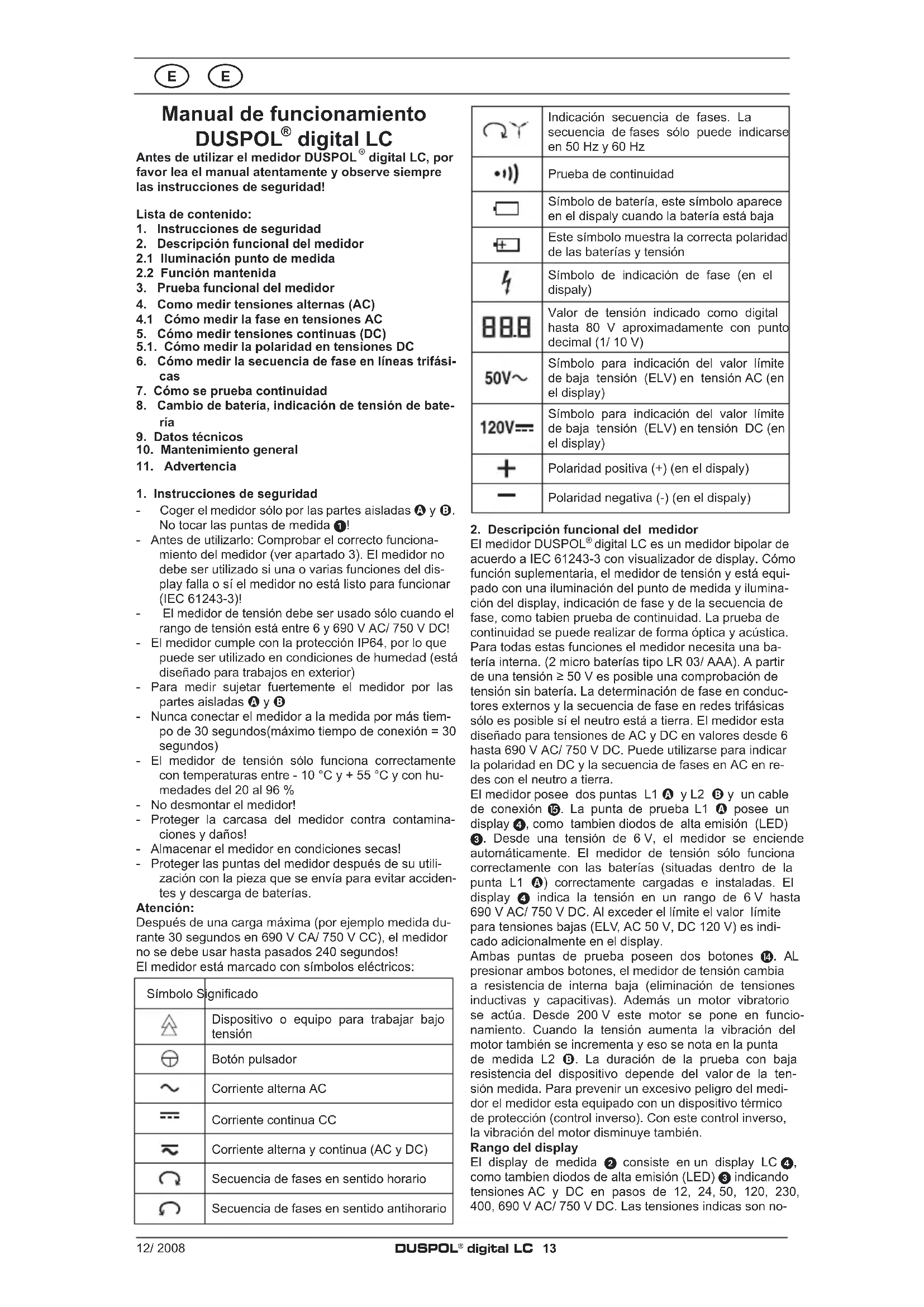 cas - La secuencia de fase es posible en tensiones desde 230 V AC (fase – fase) en una red trifásica - Sujetar con firmeza las puntas A y B de las puntas de prueba L1 y L2. (corriente de fugas para prueba de fase con punta L1!). - Poner los electrodos de medida de las puntas de medida L1 A y L2 B sobre los puntos a medir. - Sí una tensión superior a 5 V está presente en el punto de medida, el medidor se enciende automá- ticamente y muestra en el display el valor de la ten- sión - El LC display indica el valor de la tensión por me- dio de tres dígitos 7. - Cuando conecte los dos electrodos 1 con dos fases de una red trifásica está en sentido horario, el display LC 4 indica el símbolo “ ” 9. Sí dos fases están en sentido antihorario, el LC display indica el símbolo “ ” 8. La secuencia de fases sólo requiere una medida! Si el display indica sentido horario para dos fases en una red trifásica, estas dos fases probadas también con los electrodos 1 en sentido contrario. En este caso no se mostrará el símbolo sobre el display 4. Sí en ambos12/ 2008 DUSPOL