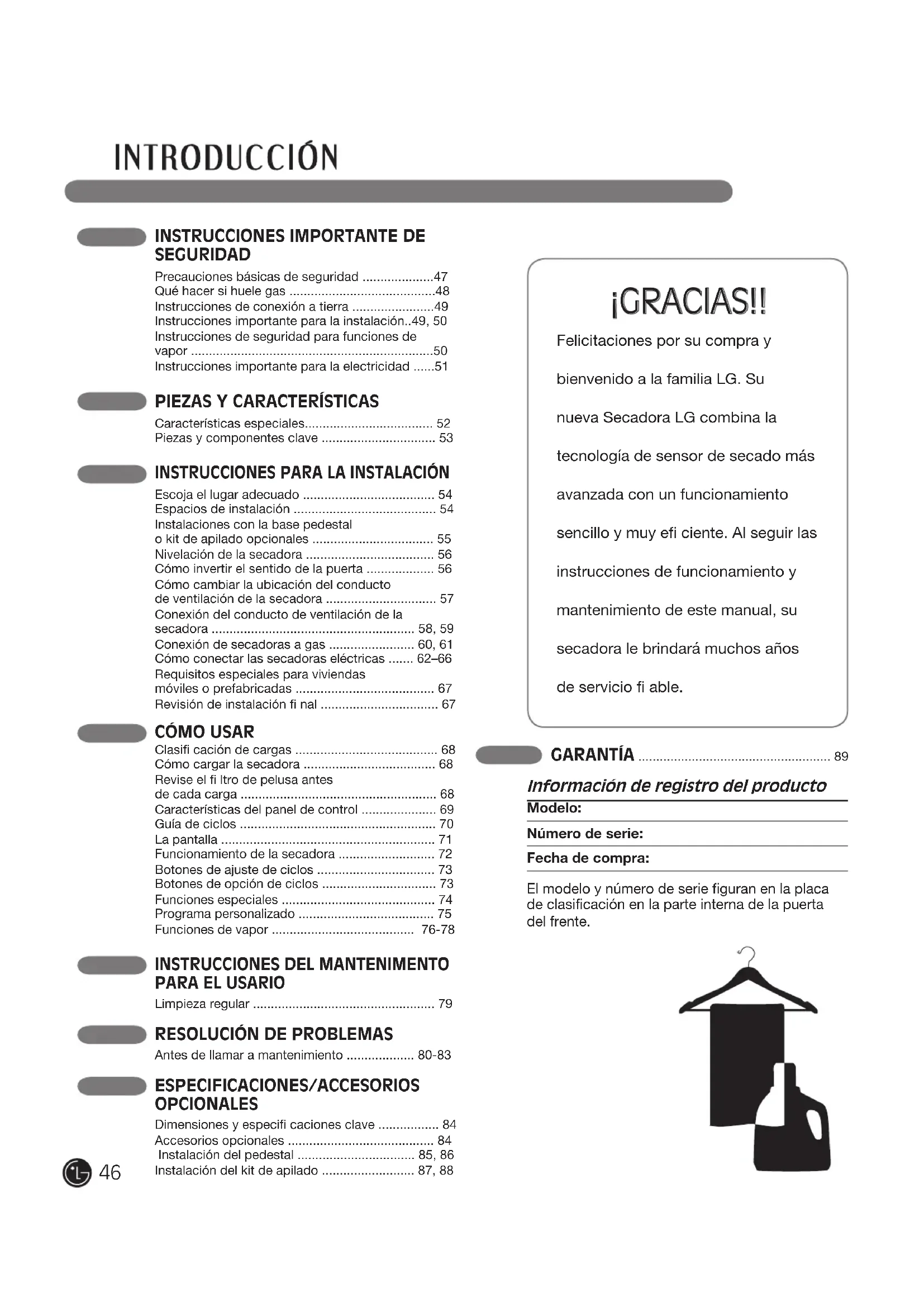 - Revisión de instalación fi nal Felicitaciones por su compra y bienvenido a la familia LG. Su nueva Secadora LG combina la tecnología de sensor de secado más avanzada con un funcionamiento sencillo y muy efi ciente. Al seguir las instrucciones de funcionamiento y mantenimiento de este manual, su secadora le brindará muchos años de servicio fi able. ¡GRACIAS!! p. 67