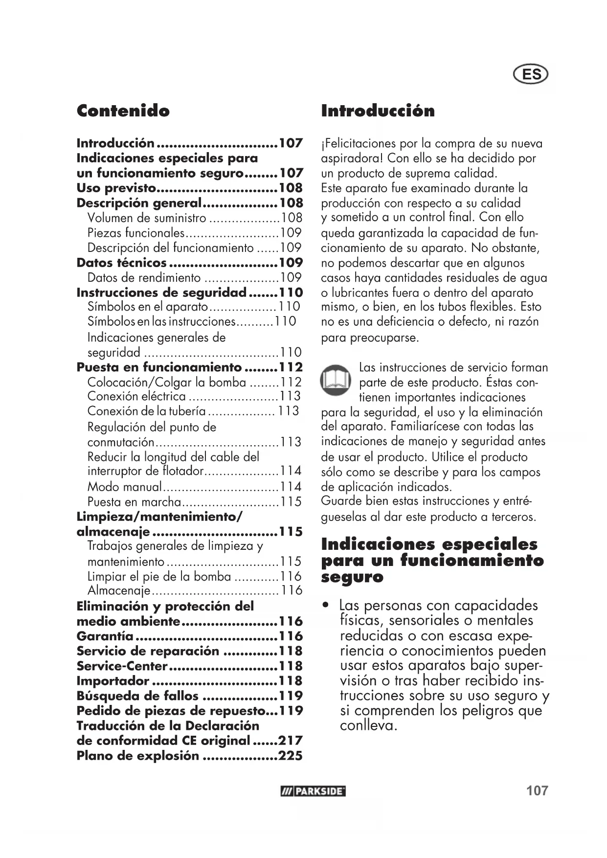 - Las personas con capacidades físicas, sensoriales o mentales reducidas o con escasa expe- riencia o conocimientos pueden usar estos aparatos bajo super- visión o tras haber recibido ins- trucciones sobre su uso seguro y si comprenden los peligros que conlleva. Contenido Introducción .............................107 Indicaciones especiales para un funcionamiento seguro ........ 107 Uso previsto .............................108 Descripción general .................. 108 Volumen de suministro ...................108 Piezas funcionales .........................109 Descripción del funcionamiento ......109 Datos técnicos ..........................109 Datos de rendimiento ....................109 Instrucciones de seguridad .......110 Símbolos en el aparato .................. 110 Símbolos en las instrucciones ..........110 Indicaciones generales de seguridad ....................................110 Puesta en funcionamiento ........112 Colocación/Colgar la bomba ........112 Conexión eléctrica ........................113 Conexión de la tubería .................. 113 Regulación del punto de conmutación .................................113 Reducir la longitud del cable del interruptor de otador ....................114 Modo manual ...............................114 Puesta en marcha ..........................115 Limpieza/mantenimiento/ almacenaje ..............................115 Trabajos generales de limpieza y mantenimiento ..............................115 Limpiar el pie de la bomba ............116 Almacenaje .................................. 116 Eliminación y protección del medio ambiente .......................116 Garantía ..................................116 Servicio de reparación .............118 Service-Center ..........................118 Importador ..............................118 Búsqueda de fallos ..................119 Pedido de piezas de repuesto ...119 Traducción de la Declaración de conformidad CE original ......217 Plano de explosión ..................225108