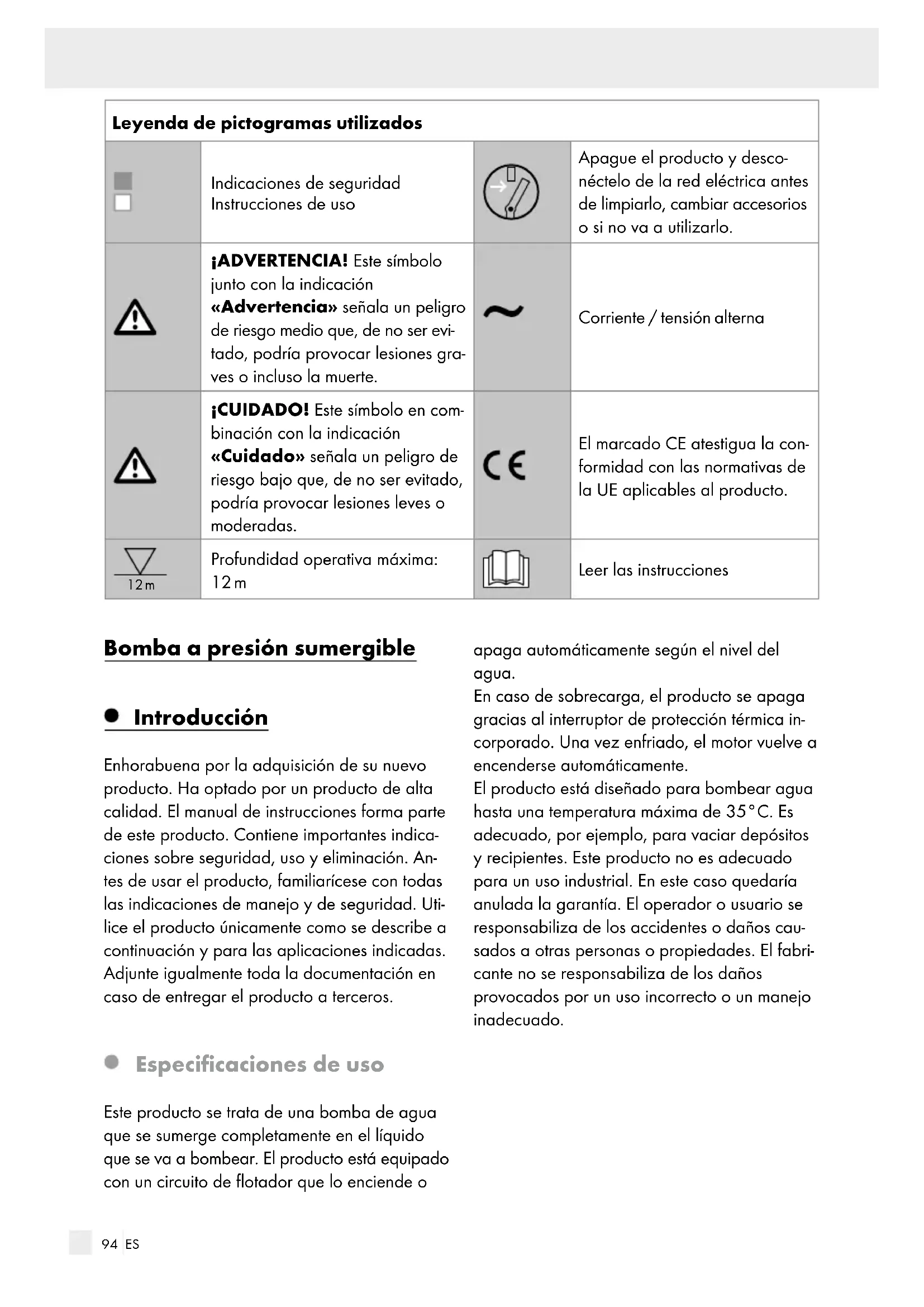 con agua limpia. Quite el lodo del fondo del pozo regular- mente (al menos cada 3 meses) y limpie también las paredes del pozo. La suciedad de la parte inferior de la bomba puede limpiarse rociando agua limpia. Todas las demás medidas, en particular en caso de tener que abrir el producto, deben ser realizadas por un electricista cualificado. Si ne- cesita realizar alguna reparación póngase siempre en contacto con el servicio técnico. Almacenar el producto Limpie el producto antes de guardarlo. Guarde el producto seco, protegido frente a heladas y fuera del alcance de los niños. Si no va a utilizar la bomba durante un pe- riodo prolongado de tiempo, deberá lim- piarla a fondo después del último uso y antes de volver a utilizarla. De lo contrario, los depósitos y residuos pueden causar difi- cultades en la puesta en marcha. Localización de fallos Pro- blema Posible causa Solución de problemas La bomba no fun- ciona. Falta tensión de red. Revisar la toma de corriente, el cable de alimen- tación, el cableado, el enchufe y, si es necesa- rio, reparar por un electricista. La bomba no bom- bea. Rejilla de entrada del pie de la bomba obstruida. Limpiar la rejilla de entrada del pie de la bomba con un chorro de agua (ver «Realizar tareas de mantenimiento general»). Rendimiento de la bomba redu- cido debido a aditivos de agua muy sucios y abrasivos. Limpiar la bomba. La bomba no se apaga. El sensor de flotador no baja. Colocar la bomba correctamente en el fondo del pozo. Caudal in- suficiente. Rejilla de entrada del pie de la bomba obstruida. Limpiar la rejilla de entrada del pie de la bomba con un chorro de agua (ver «Realizar tareas de mantenimiento general»). Rendimiento de la bomba redu- cido debido a aditivos de agua muy sucios y abrasivos. Limpiar la bomba.103 ES Pro- blema Posible causa Solución de problemas La bomba se apaga al poco tiempo de estar fun- cionando. La protección del motor apaga la bomba debido a una intensa contaminación del agua. Desconectar el cable de alimentación y limpiar la bomba y el pozo. Temperatura del agua dema- siado elevada, la protección del motor apaga el producto. ¡Observar que la temperatura máxima del agua sea de 35 ºC! Eliminación El embalaje está compuesto por materiales no contaminantes que pueden ser desechados en el centro de reciclaje local.