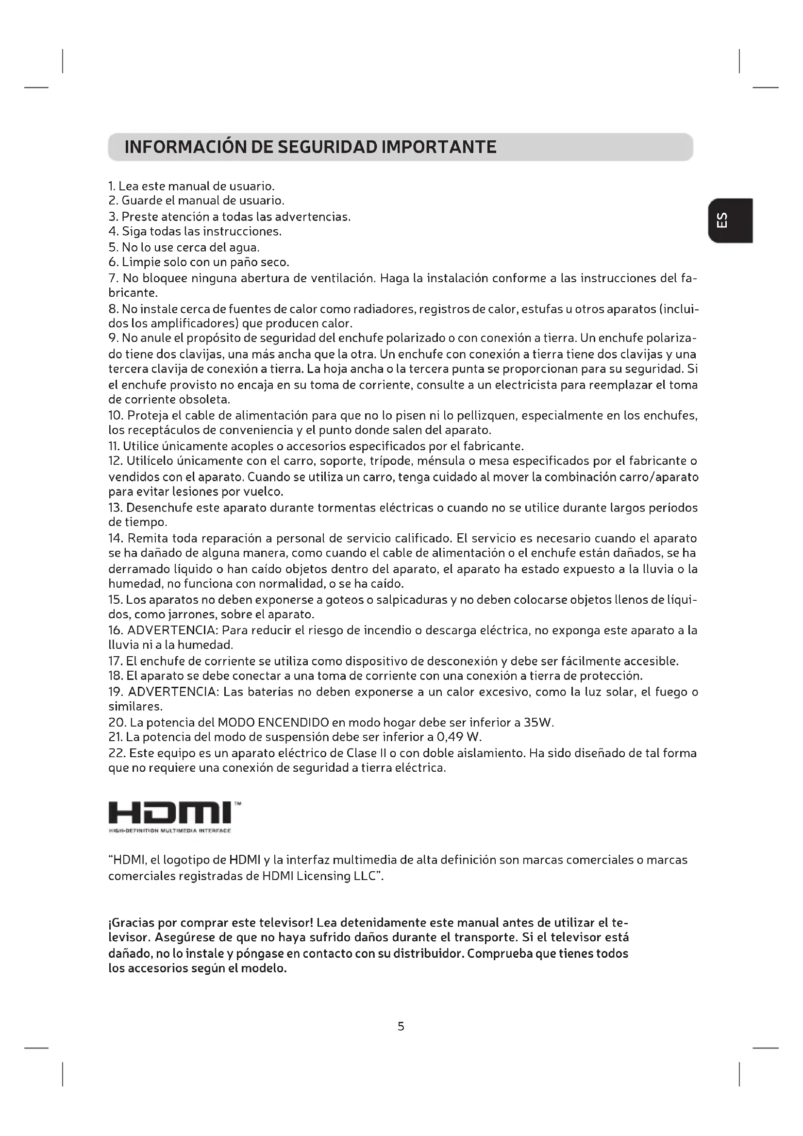 que no requiere una conexión de seguridad a ierra eléctrica. “HDMI, el logoipo de HDMI y la interfaz mulimedia de alta deinición son marcas comerciales o marcas comerciales registradas de HDMI Licensing LLC”. ¡Gracias por comprar este televisor! Lea detenidamente este manual antes de uilizar el te- levisor. Asegúrese de que no haya sufrido daños durante el transporte. Si el televisor está dañado, no lo instale y póngase en contacto con su distribuidor. Comprueba que ienes todos los accesorios según el modelo.