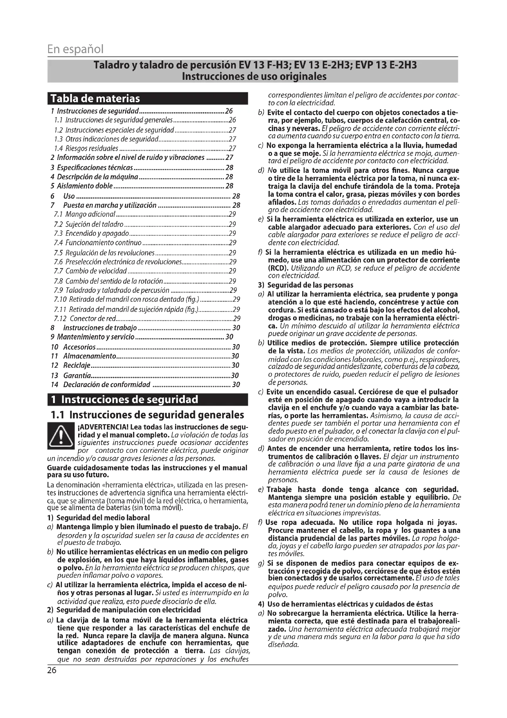 Taladro y taladro de percusión EV13F-H3; EV13E-2H3; EVP13E-2H3 Instrucciones de uso originales Tabla de materias 1 Instrucciones de seguridad ............................................... 26