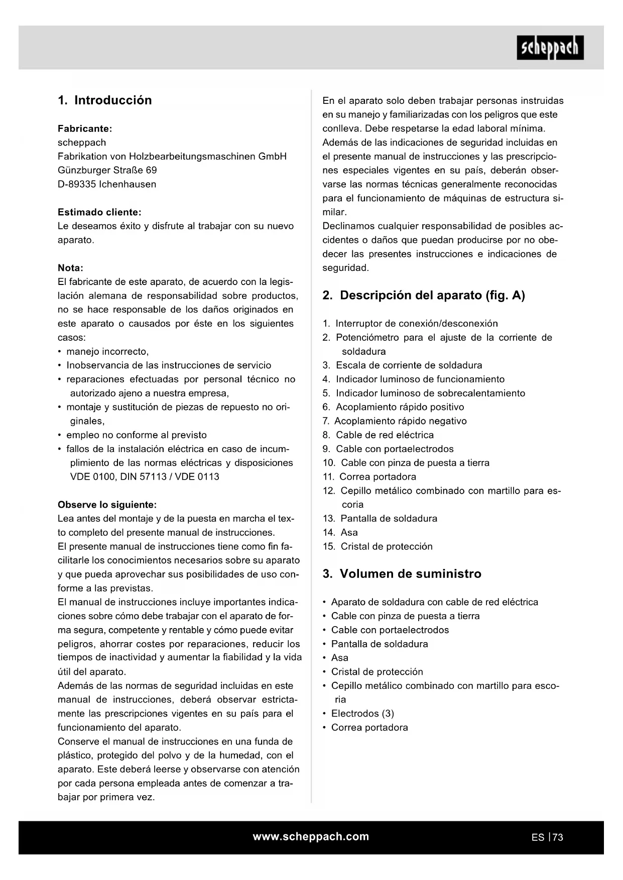 Observe lo siguiente: Lea antes del montaje y de la puesta en marcha el tex- to completo del presente manual de instrucciones. El presente manual de instrucciones tiene como n fa- cilitarle los conocimientos necesarios sobre su aparato y que pueda aprovechar sus posibilidades de uso con- forme a las previstas. El manual de instrucciones incluye importantes indica- ciones sobre cómo debe trabajar con el aparato de for- ma segura, competente y rentable y cómo puede evitar peligros, ahorrar costes por reparaciones, reducir los tiempos de inactividad y aumentar la abilidad y la vida útil del aparato. Además de las normas de seguridad incluidas en este manual de instrucciones, deberá observar estricta- mente las prescripciones vigentes en su país para el funcionamiento del aparato. Conserve el manual de instrucciones en una funda de plástico, protegido del polvo y de la humedad, con el aparato. Este deberá leerse y observarse con atención por cada persona empleada antes de comenzar a tra- bajar por primera vez.www.scheppach.com