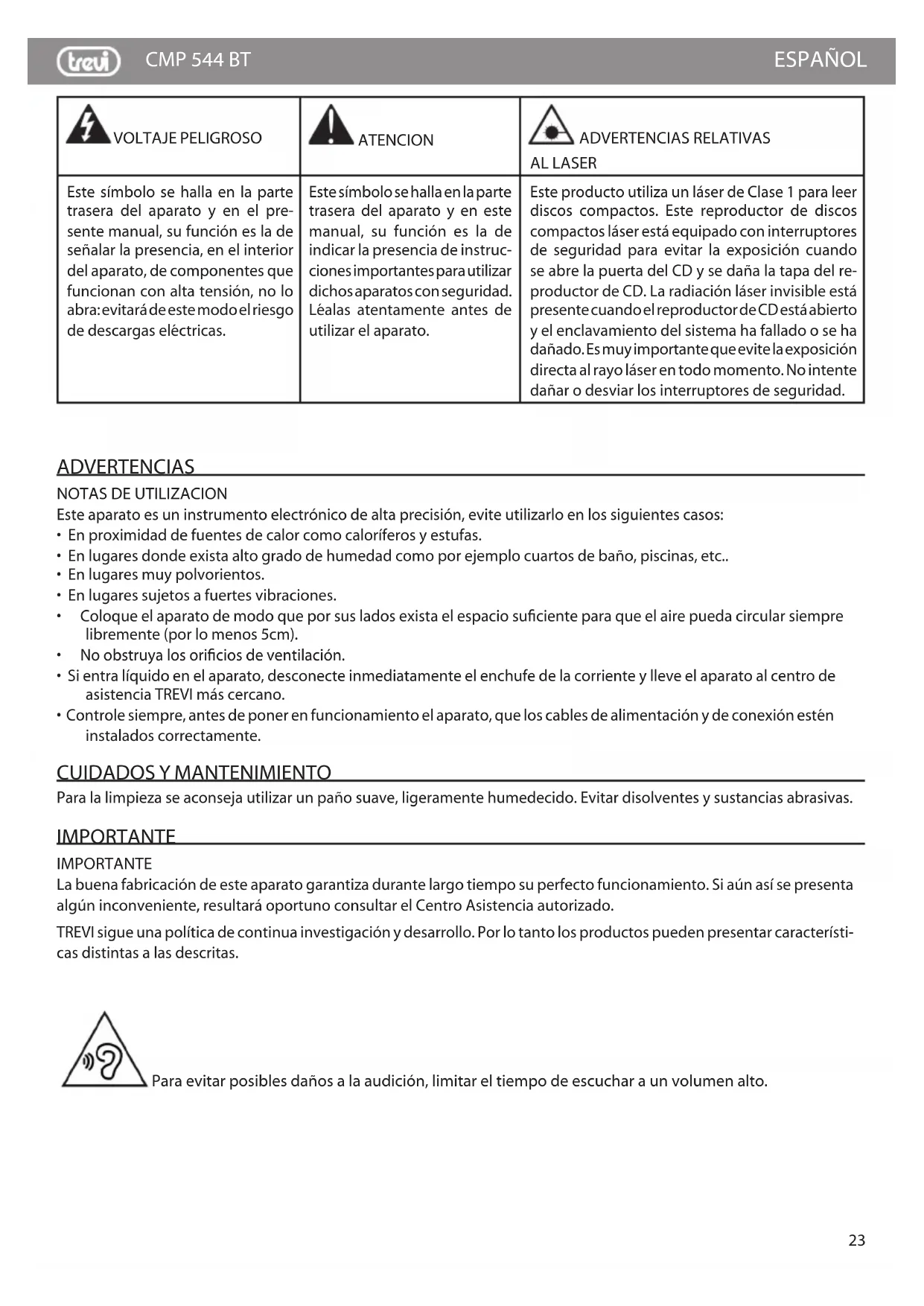 Para la limpieza se aconseja utilizar un paño suave, ligeramente humedecido. Evitar disolventes y sustancias abrasivas. IMPORTANTE IMPORTANTE La buena fabricación de este aparato garantiza durante largo tiempo su perfecto funcionamiento. Si aún así se presenta algún inconveniente, resultará oportuno consultar el Centro Asistencia autorizado. TREVI sigue una política de continua investigación y desarrollo. Por lo tanto los productos pueden presentar característi- cas distintas a las descritas. VOLTAJE PELIGROSO ATENCION ADVERTENCIAS RELATIVAS AL LASER Este símbolo se halla en la parte trasera del aparato y en el pre- sente manual, su función es la de señalar la presencia, en el interior del aparato, de componentes que funcionan con alta tensión, no lo abra: evitará de este modo el riesgo de descargas eléctricas. Este símbolo se halla en la parte trasera del aparato y en este manual, su función es la de indicar la presencia de instruc- ciones importantes para utilizar dichos aparatos con seguridad. Léalas atentamente antes de utilizar el aparato. Este producto utiliza un láser de Clase 1 para leer discos compactos. Este reproductor de discos compactos láser está equipado con interruptores de seguridad para evitar la exposición cuando se abre la puerta del CD y se daña la tapa del re- productor de CD. La radiación láser invisible está presente cuando el reproductor de CD está abierto y el enclavamiento del sistema ha fallado o se ha dañado. Es muy importante que evite la exposición directa al rayo láser en todo momento. No intente dañar o desviar los interruptores de seguridad.24 CMP 544 BT ESPAÑOL