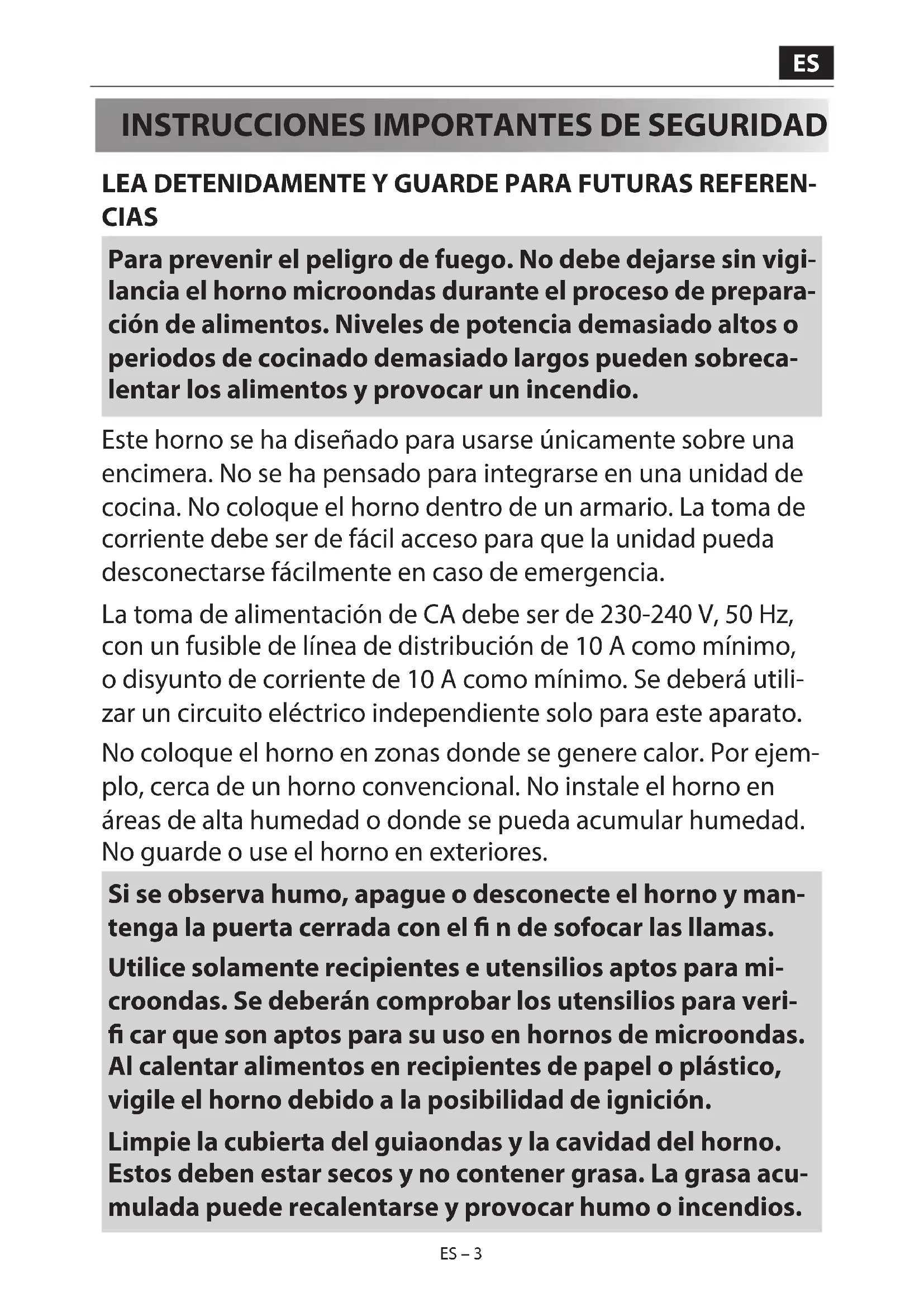 LEA DETENIDAMENTE Y GUARDE PARA FUTURAS REFEREN- CIAS Para prevenir el peligro de fuego. No debe dejarse sin vigi- lancia el horno microondas durante el proceso de prepara- ción de alimentos. Niveles de potencia demasiado altos o periodos de cocinado demasiado largos pueden sobreca- lentar los alimentos y provocar un incendio. Este horno se ha diseñado para usarse únicamente sobre una encimera. No se ha pensado para integrarse en una unidad de cocina. No coloque el horno dentro de un armario. La toma de corriente debe ser de fácil acceso para que la unidad pueda desconectarse fácilmente en caso de emergencia. La toma de alimentación de CA debe ser de 230-240V, 50Hz, con un fusible de línea de distribución de 10A como mínimo, odisyunto de corriente de 10A como mínimo. Se deberá utili- zar un circuito eléctrico independiente solo para este aparato. No coloque el horno en zonas donde se genere calor. Por ejem- plo, cerca de un horno convencional. No instale el horno en áreas de alta humedad o donde se pueda acumular humedad. No guarde o use el horno en exteriores. Si se observa humo, apague o desconecte el horno y man- tenga la puerta cerrada con el n de sofocar las llamas. Utilice solamente recipientes e utensilios aptos para mi- croondas. Se deberán comprobar los utensilios para veri- car que son aptos para su uso en hornos de microondas. Al calentar alimentos en recipientes de papel o plástico, vigile el horno debido a la posibilidad de ignición. Limpie la cubierta del guiaondas y la cavidad del horno. Estos deben estar secos y no contener grasa. La grasa acu- mulada puede recalentarse y provocar humo o incendios.ES – 4 ES – 4 No coloque materiales in amables cerca del horno o de los ori cios de ventilación. No bloquee los ori cios de ventilación. Extraiga todos los sellos metálicos, envolturas con alambre, etc., de los alimentos y de las envolturas de alimentos. Los arcos eléctricos en super cies metálicas pueden provocar incendios. No use el horno microondas para calentar aceite destinado a freír. La temperatura no se puede controlar y el aceite puede in- cendiarse. Cuando prepare palomitas de maíz, utilice solamen- te fabricantes especializados en palomitas para microondas. No almacene comida u otros artículos dentro del horno. Compruebe la con guración después de encender el horno para asegurarse de que el aparato funciona como se desea. No deje el horno sin atender mientras se usa. Para evitar el calentamiento excesivo y el fuego, se debe prestar atención especial al cocinar o recalentar alimentos con un contenido alto de azúcar o grasa, por ejemplo, salchichas, pasteles o pudin de Navidad. Consulte las sugerencias correspondientes en el manual de funcionamiento. Para evitar la posibilidad de lesiones. ADVERTENCIA: No use el horno si está dañado o no funciona correctamente. Compruebe lo siguiente antes de usar: a) Compruebe que la puerta está correctamente cerrada y asegúrese de que no esté desalineada o deformada. b) Compruebe que las bisagras y las cerraduras de seguridad de la puerta no están rotas ni sueltas. c) Asegúrese de que las juntas de las puertas y super cies de sellado no están dañadas. d) Asegúrese de que interior de la cavidad del horno o la puerta no presentan abolladuras. e) Asegúrese de que el cable de alimentación y el enchufe no estén dañados. Si las juntas de la puerta o la puerta están dañadas, no debeES ES – 5 ES – 5 utilizarse el horno hasta que haya sido reparado por una per- sona competente. No ajuste, repare o modi que el horno. Es peligroso para cualquier persona que no esté capacitada para llevar a cabo cualquier operación de mantenimiento o reparación que consista en retirar una cubierta que protege contra la exposición a la energía de microondas. No utilice el horno con la puerta abierta ni modi que las cerra- duras de seguridad de ninguna manera. No utilice el horno si hay algún objeto entre las juntas de la puerta y las super cies de sellado. No permita que la grasa ni la suciedad se acumule en las juntas de las puertas y las partes adyacentes. Limpie el horno con regularidad y elimine los depósitos de alimen- tos. Siga las instrucciones de «Cuidado y limpieza». No mante- ner el horno limpio podría dar lugar a que la super cie se deteriore, y podría afectar negativamente a la vida útil del aparato y originar situaciones de peligro. Las personas con MARCAPASOS deben consultar a su médico o al fabricante del marcapasos para tomar las precauciones debi- das respecto a los hornos microondas. Para evitar la posibilidad de una descarga eléctrica.