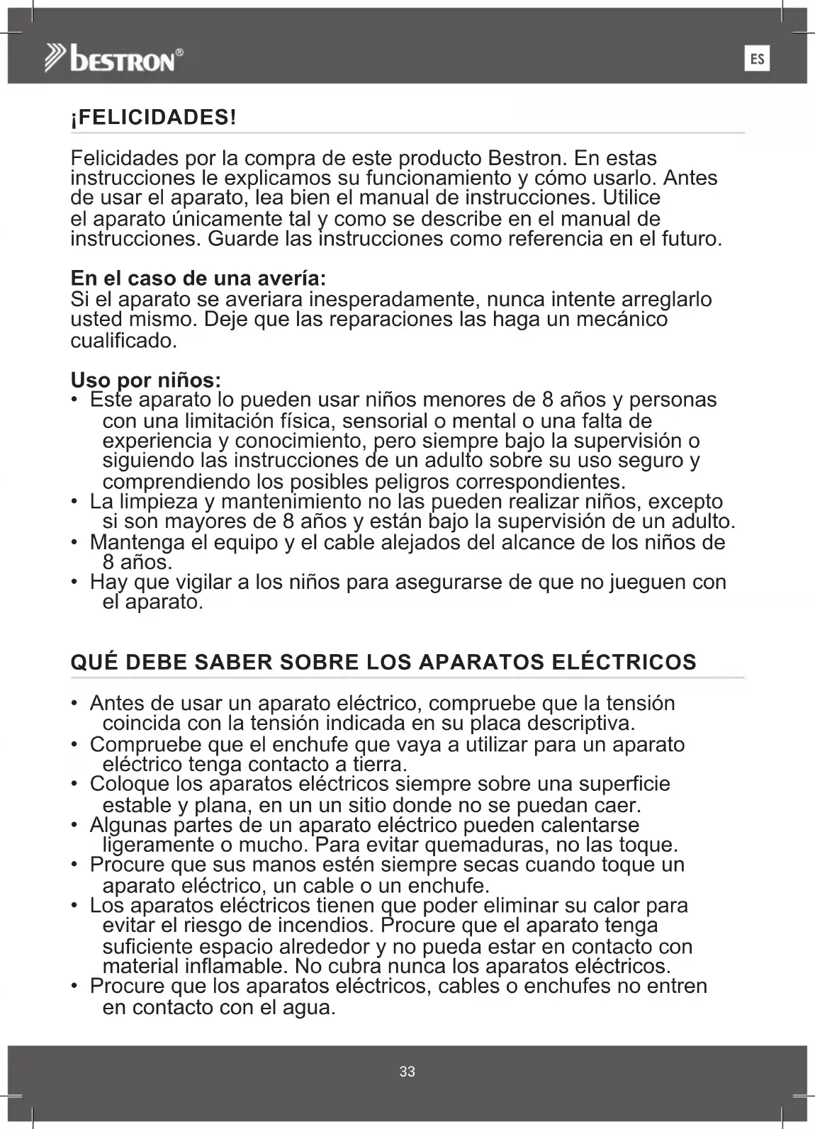 IT¡FELICIDADES! Felicidades por la compra de este producto Bestron. En estas instrucciones le explicamos su funcionamiento y cómo usarlo. Antes de usar el aparato, lea bien el manual de instrucciones. Utilice el aparato únicamente tal y como se describe en el manual de instrucciones. Guarde las instrucciones como referencia en el futuro. En el caso de una avería: Si el aparato se averiara inesperadamente, nunca intente arreglarlo usted mismo. Deje que las reparaciones las haga un mecánico cualificado. Uso por niños: